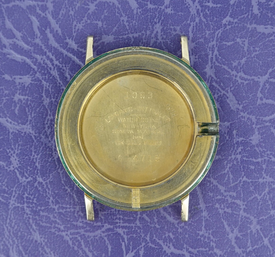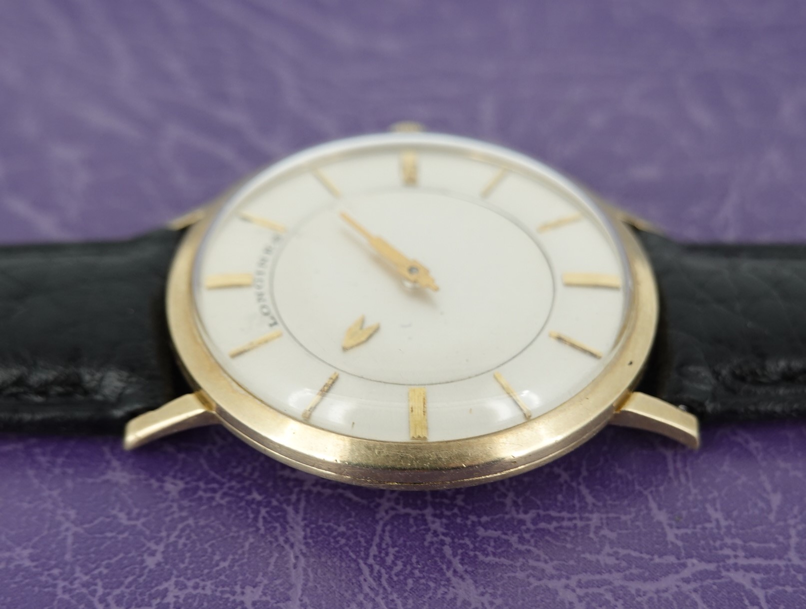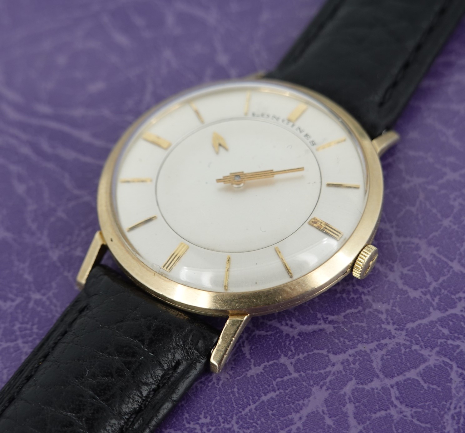 It isn’t really a mystery to see how this watch works. Instead of an hour hand, it has an hour disc that turns. Everything else is conventional, so things like reliability and future spare parts should not be a worry. The movement chosen is Longines’ 23Z, a seventeen jewel manual wind calibre that is all running well. The case is stamped for Longines-Wittnauer, and is 10k gold filled, so this watch was definitely intended to be sold in the USA. The minute hand is quite unique too, in the shape of a skyscraper. The leather strap is new, and could be swapped for a different colour or material if preferred. The watch is signed on the dial, case, movement and crown.