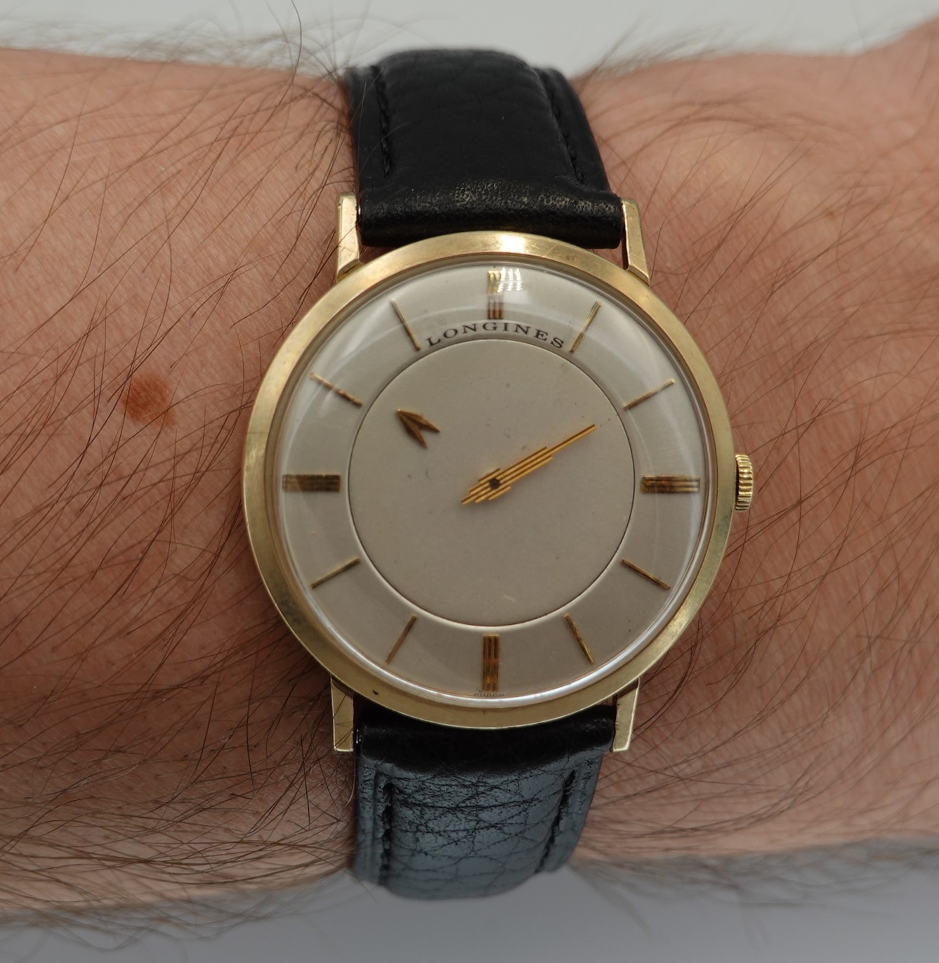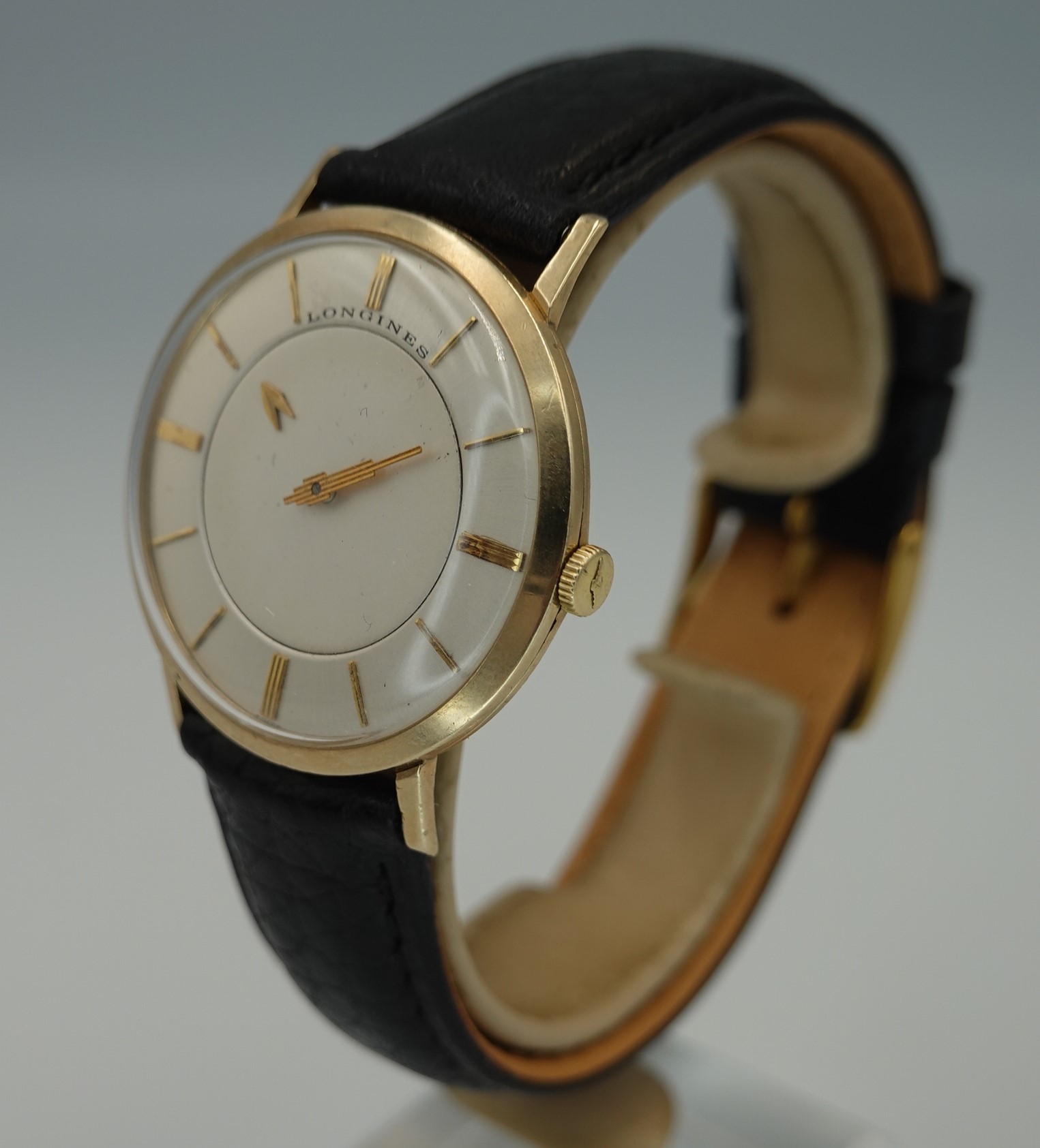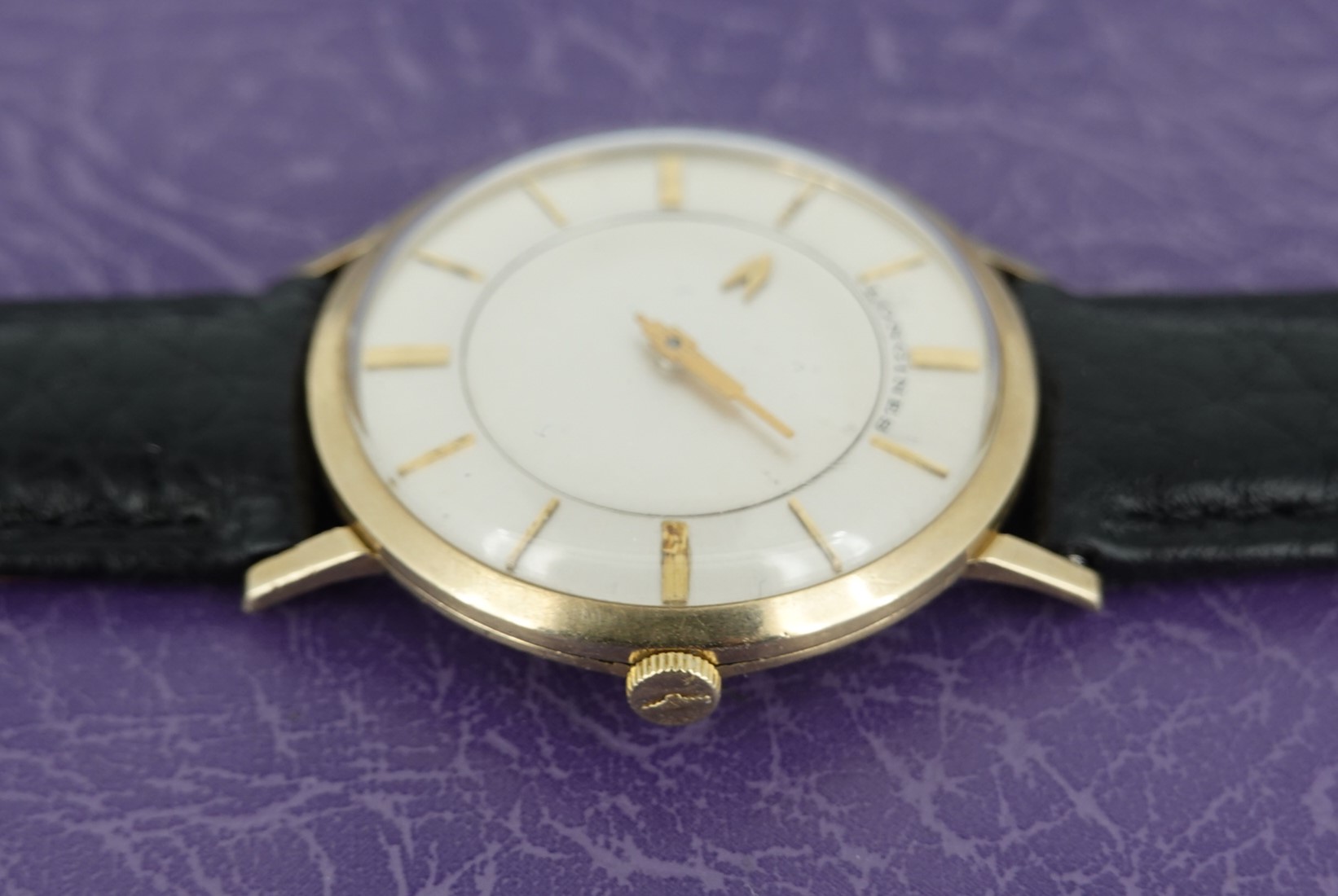 It isn’t really a mystery to see how this watch works. Instead of an hour hand, it has an hour disc that turns. Everything else is conventional, so things like reliability and future spare parts should not be a worry. The movement chosen is Longines’ 23Z, a seventeen jewel manual wind calibre that is all running well. The case is stamped for Longines-Wittnauer, and is 10k gold filled, so this watch was definitely intended to be sold in the USA. The minute hand is quite unique too, in the shape of a skyscraper. The leather strap is new, and could be swapped for a different colour or material if preferred. The watch is signed on the dial, case, movement and crown.