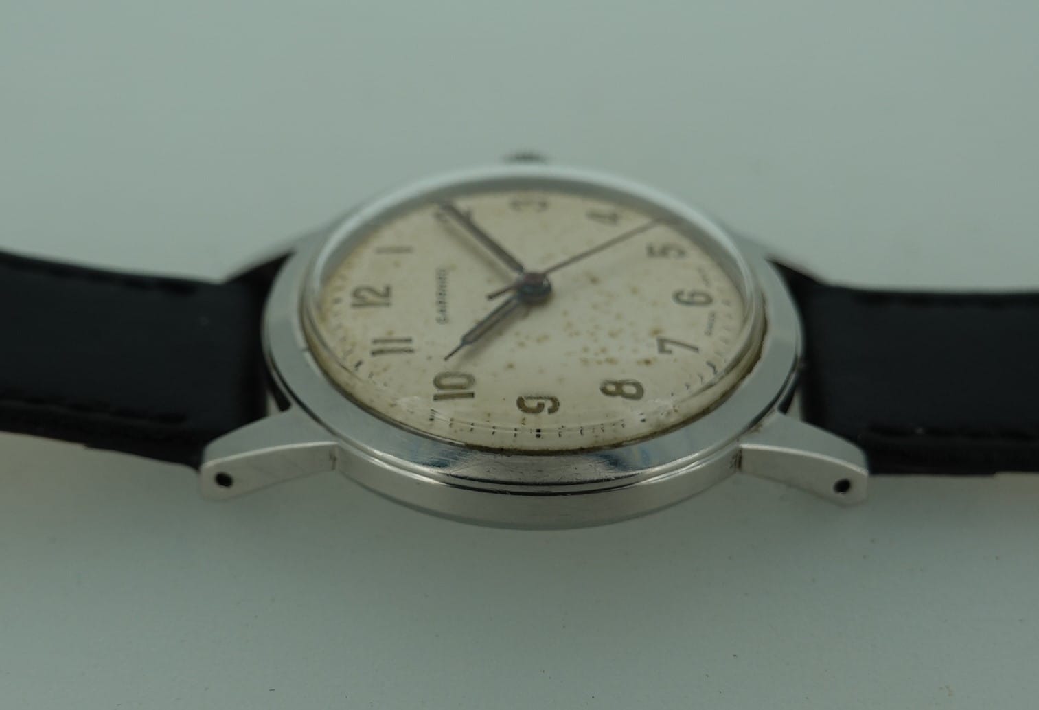Garrard is the longest serving jewellers in the world, and can trace their history back to 1735. Quality as always been high – they were appointed the first official Crown Jeweller in 1843, and even now the engagement ring worn by the Duchess of Cambridge was made by them. This watch is a more standard affair, but the quality is still there. The stainless steel case has a screw down case back to protect the movement. The movement is a Garrard stamped AS1430, which has seventeen jewels and is very clean. This may be because it retains the dust cover that is so often missing. It is running well. The lugs are drilled in order to make strap changes easier. The dial does have some patina of age but is original. The leather strap is new, and could be swapped for a different colour if preferred.