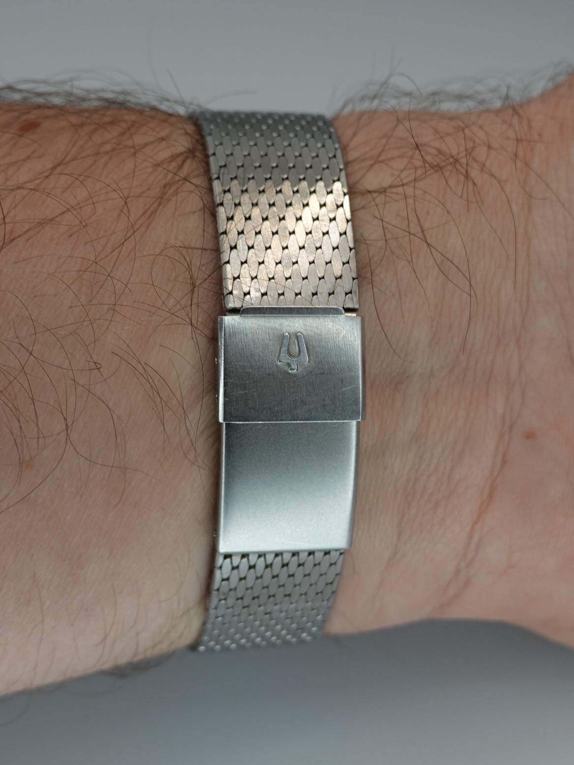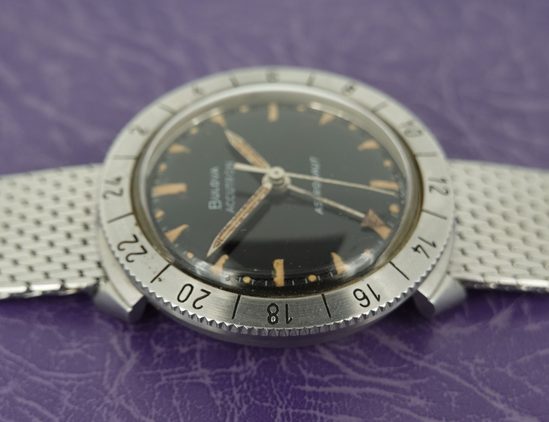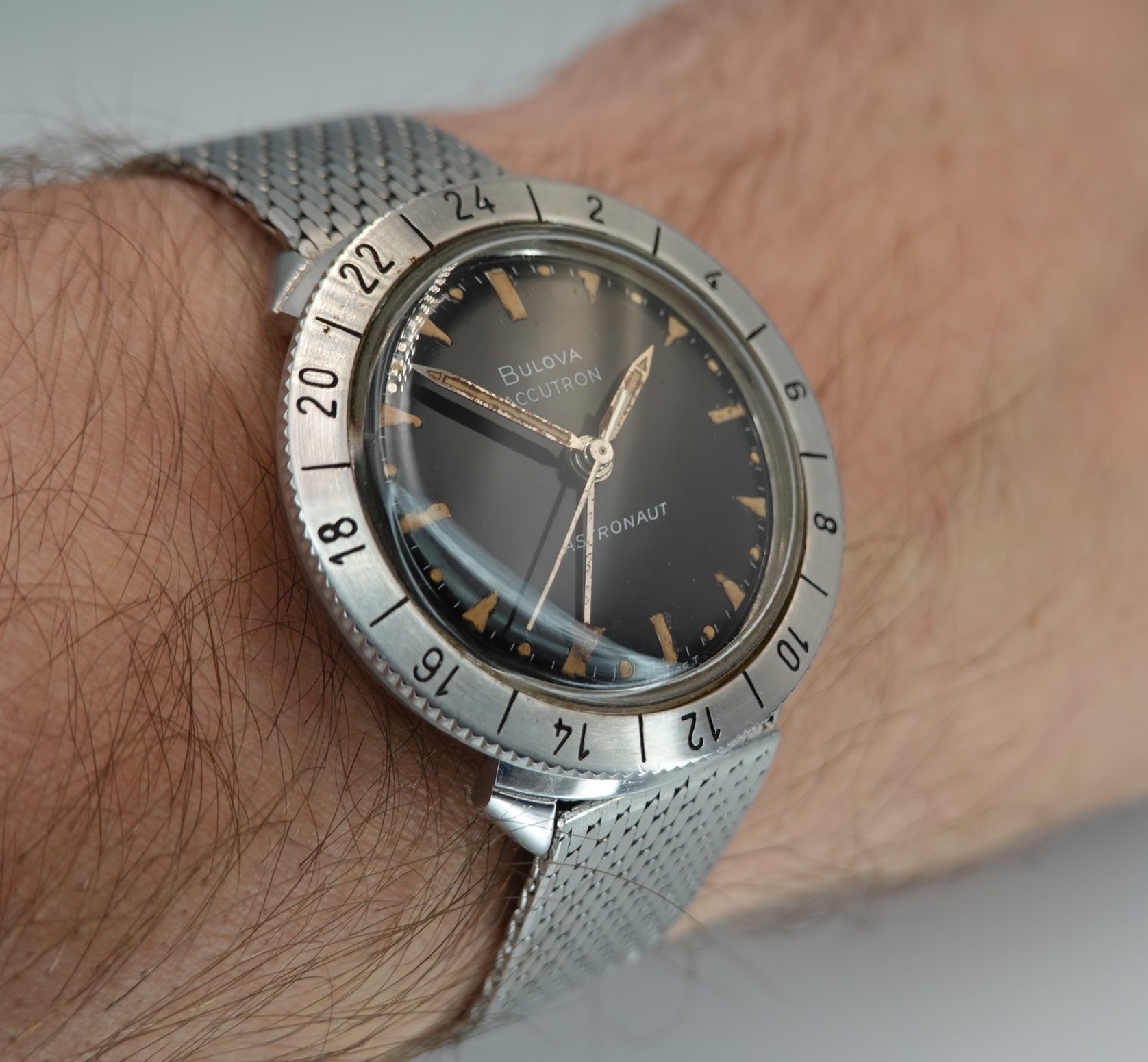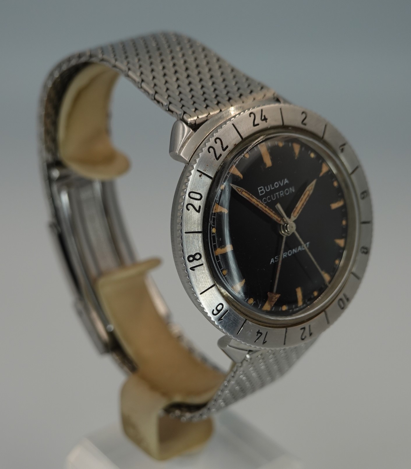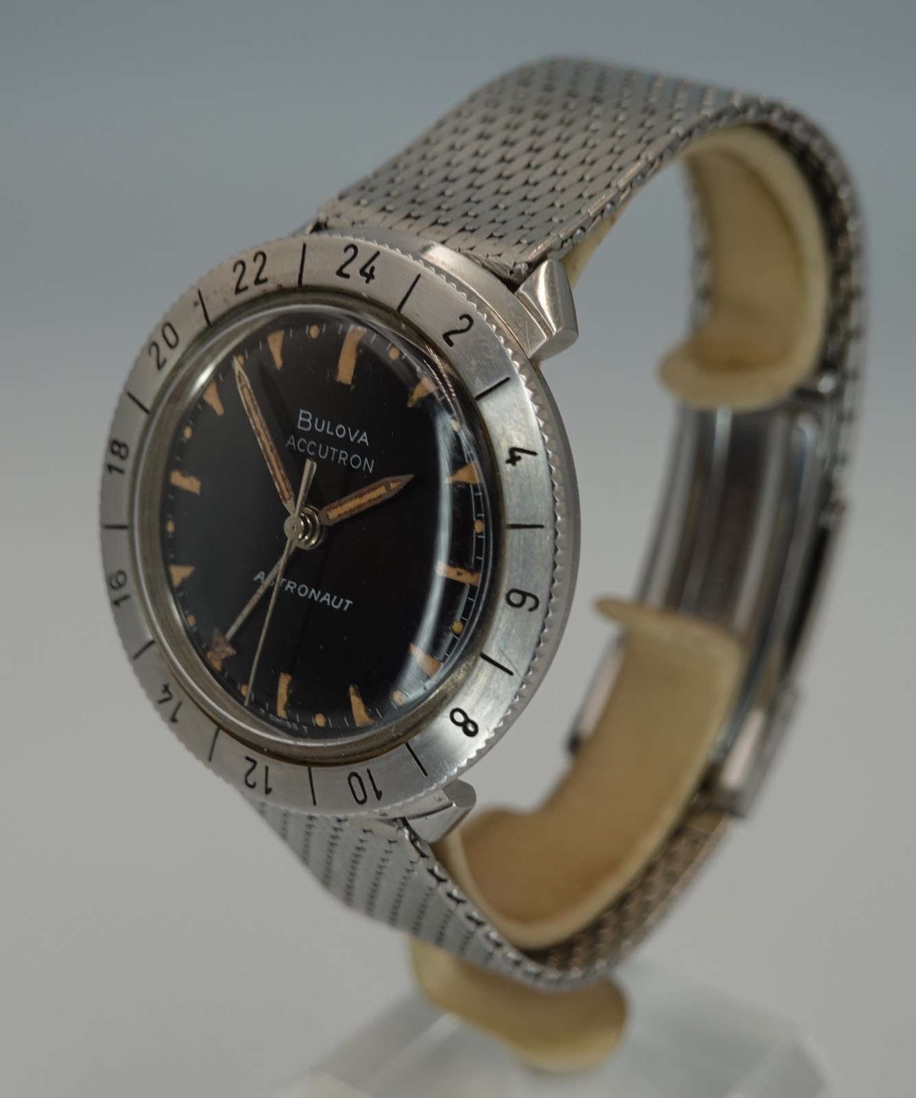 If you want to know more about the A-12 and other cutting edge aircraft this watch was standard equipment for, Hodinkee have done an in depth article you can read here, and it also goes into the Bulova Astronaut watch too. We will focus on our specific example. It has the correct dial for the 1966 watch, with extra lume on the half hour markers (which are hour markers for the 24 hour hand). The tritium lume on the straight hands and of the dial has all faded to a dark cream, which looks fantastic against the black dial. The GMT hand makes more sense for space travel than it does in most places, as you wouldn’t really know if it was morning or evening without it. The 24 hour bezel helps you track a second time zone too, and it turns without any clicks. The 214H movement is all working well and is back set, so no crown to be seen. There is some hand drag on the seconds hand when setting the time, far from uncommon on this movement but doesn’t affect the operation of the watch at all. The hands do have some corrosion but the movement is clean. We will install a brand new battery before sending the watch out to the new owner. The bracelet is by Bulova but is not originally from the GMT Astronaut watch, and it has an aftermarket bracelet extender to make it fit more wrists. The bracelet has been cleaned in our ultrasonic bath. The watch is signed on the dial, case, movement and clasp.