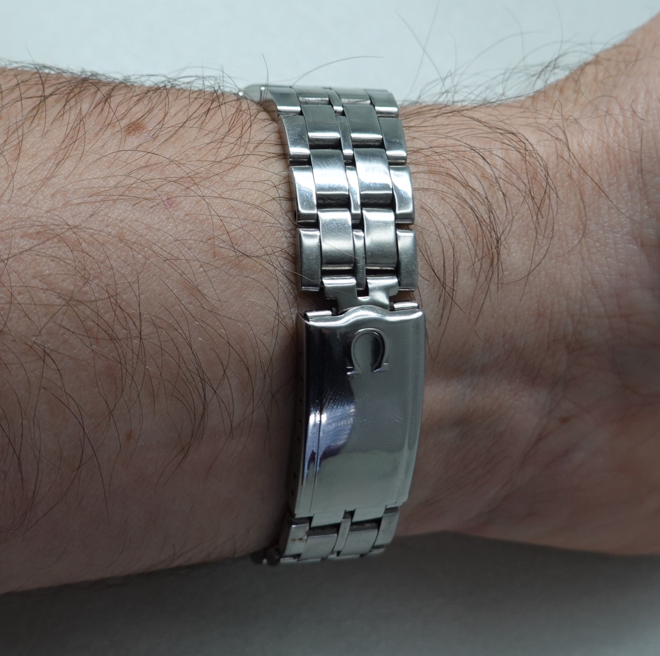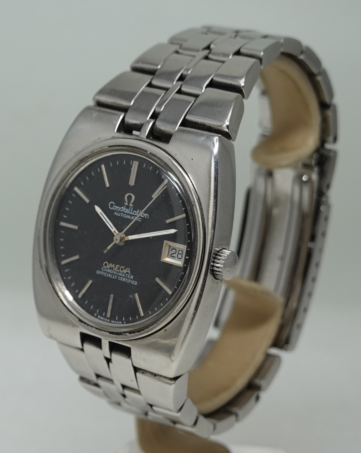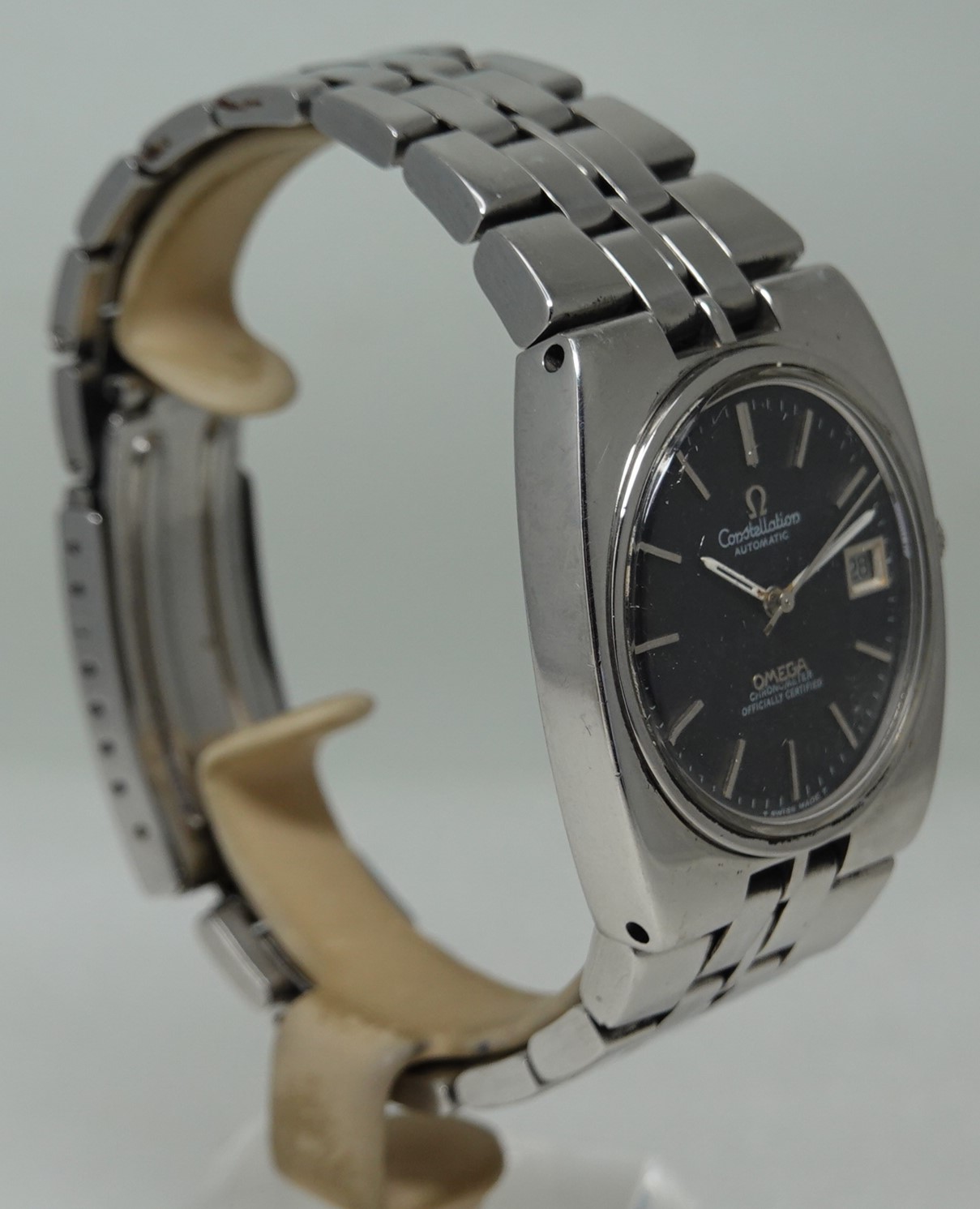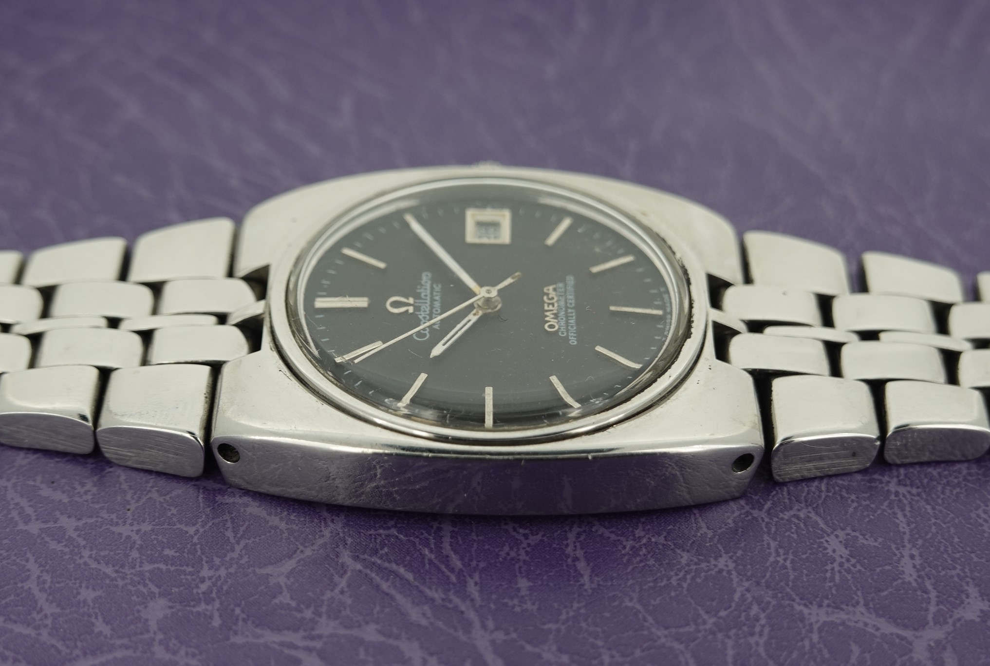 Constellation automatic watches normally carry a premium over other models, but this particular watch has had the case and bracelet polished and this will put some people off. The case and bracelet should be matte finished, and this is shiny – that explains why this is cheaper. But some people will like the polished finish, and this then will be ideal for them. Also the dial has been restored, so is not how it left the factory either. Inside you have the Omega 20 jewel automatic movement that was chronometer rated. and also has quick set date. The bracelet is quite long and our sister website, SpareLinks.com, may have extra links if required. The watch is signed on the dial, case, movement, crystal and clasp.