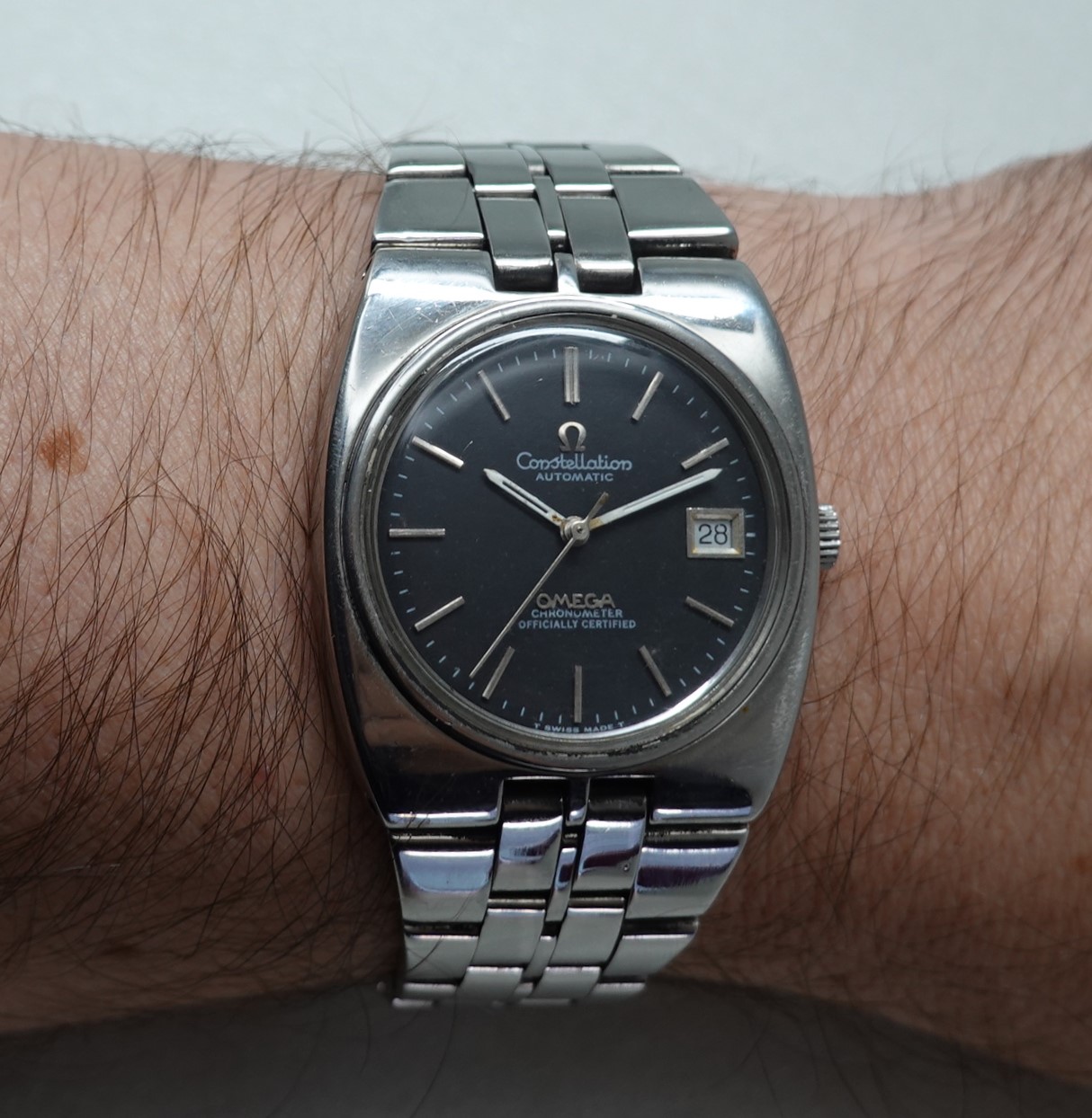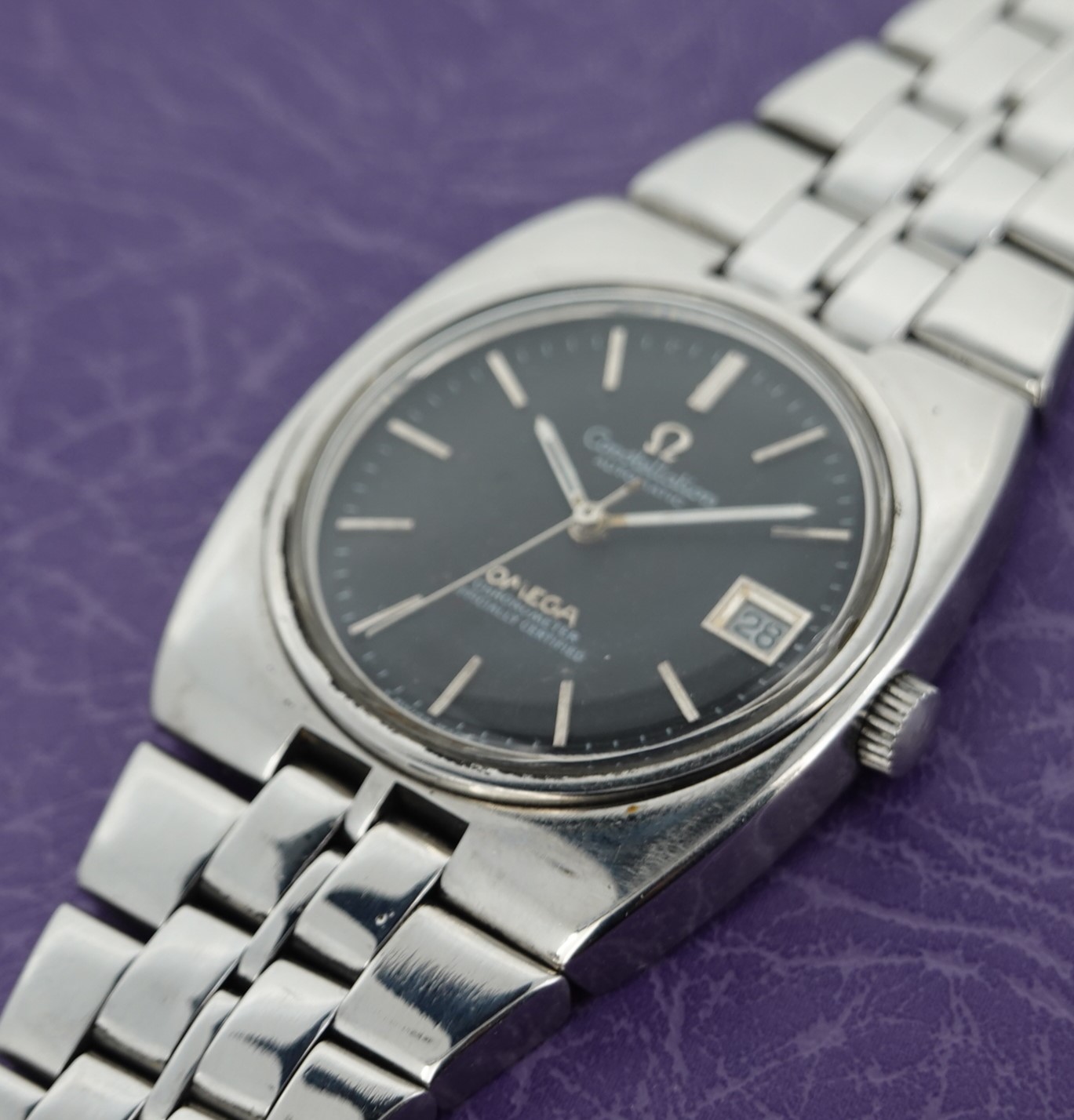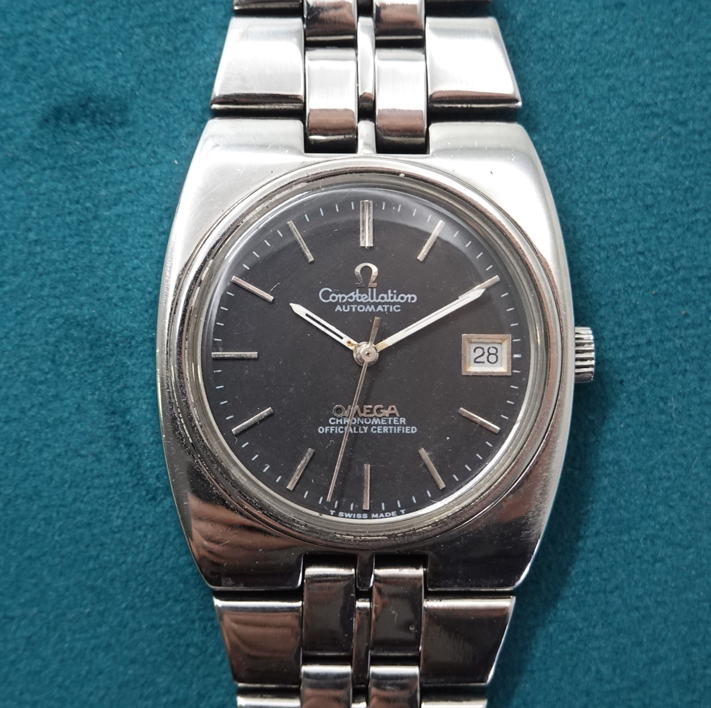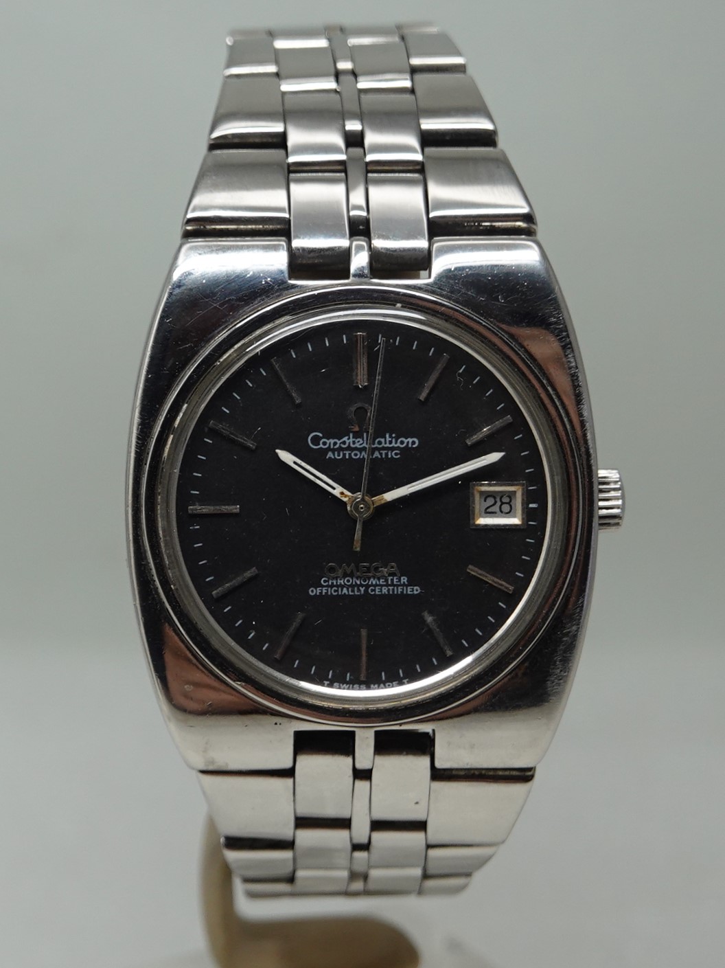 Constellation automatic watches normally carry a premium over other models, but this particular watch has had the case and bracelet polished and this will put some people off. The case and bracelet should be matte finished, and this is shiny – that explains why this is cheaper. But some people will like the polished finish, and this then will be ideal for them. Also the dial has been restored, so is not how it left the factory either. Inside you have the Omega 20 jewel automatic movement that was chronometer rated. and also has quick set date. The bracelet is quite long and our sister website, SpareLinks.com, may have extra links if required. The watch is signed on the dial, case, movement, crystal and clasp.