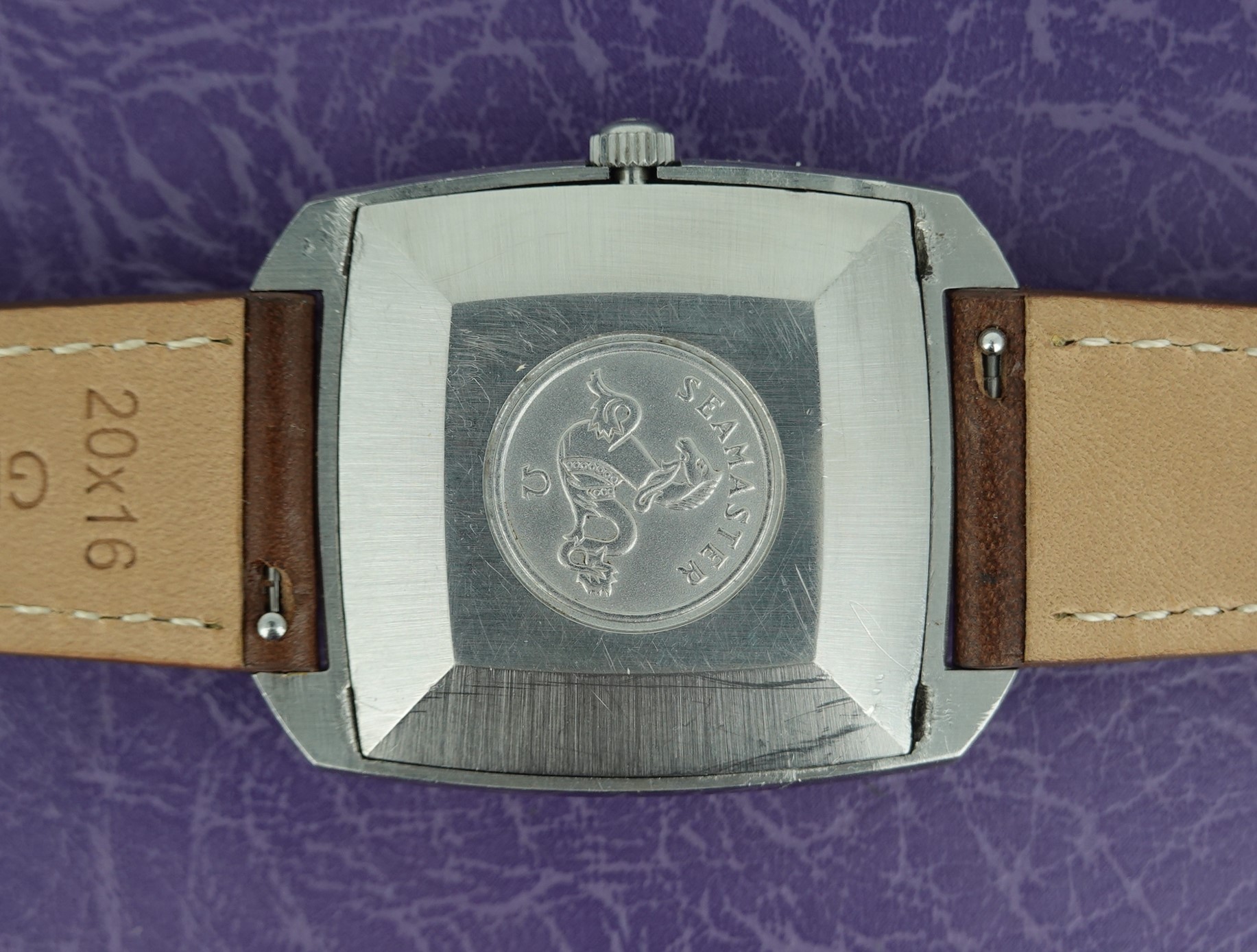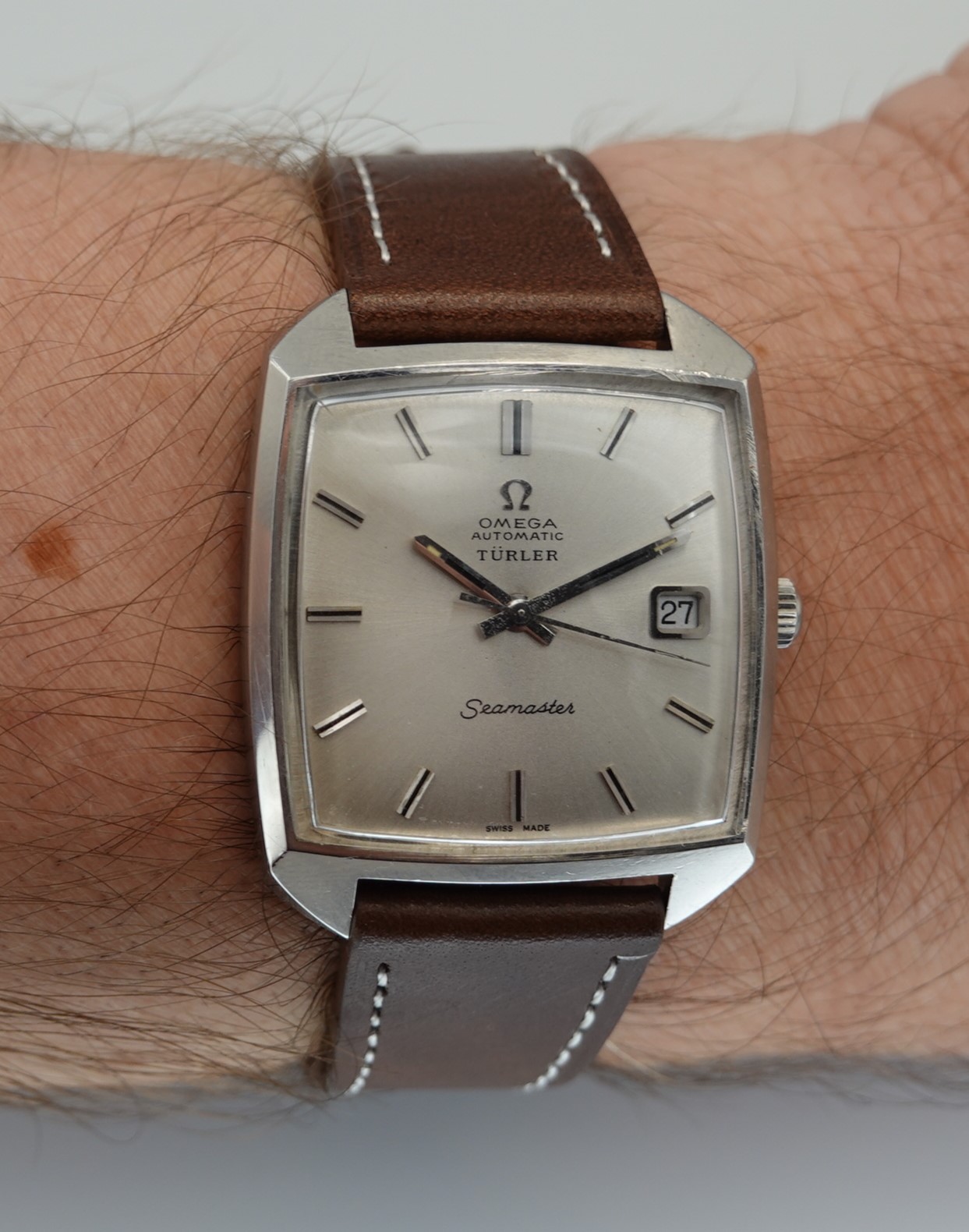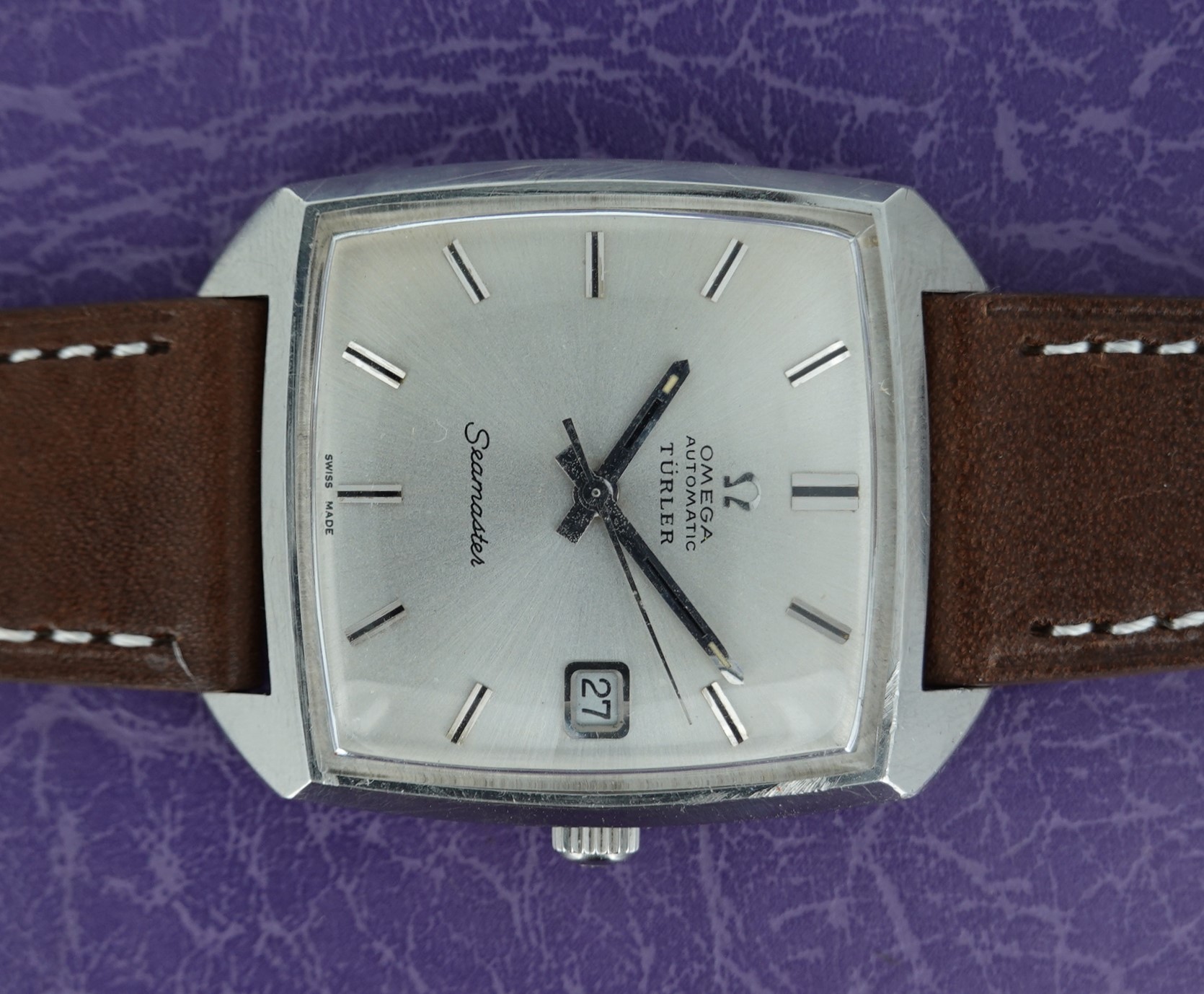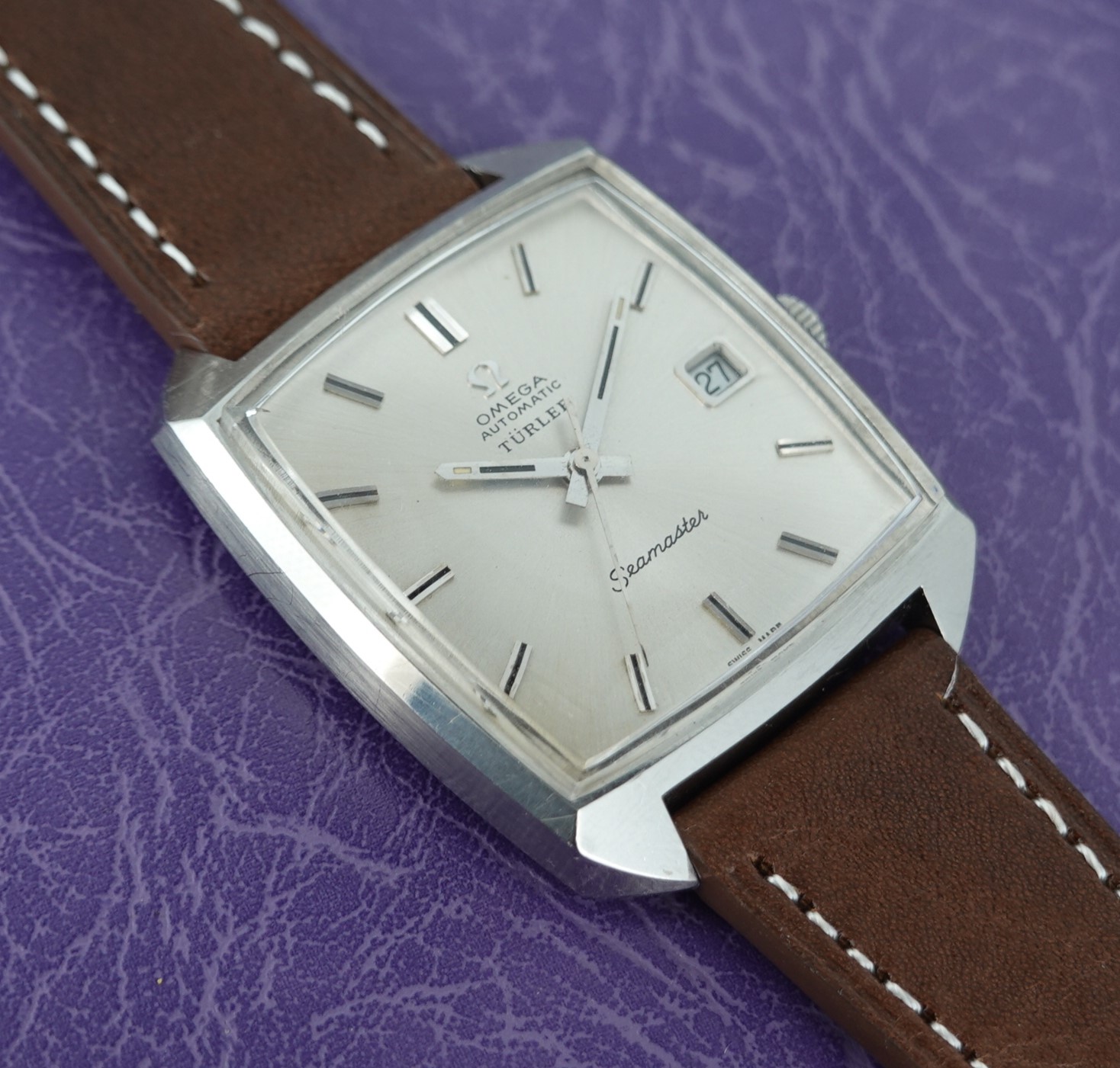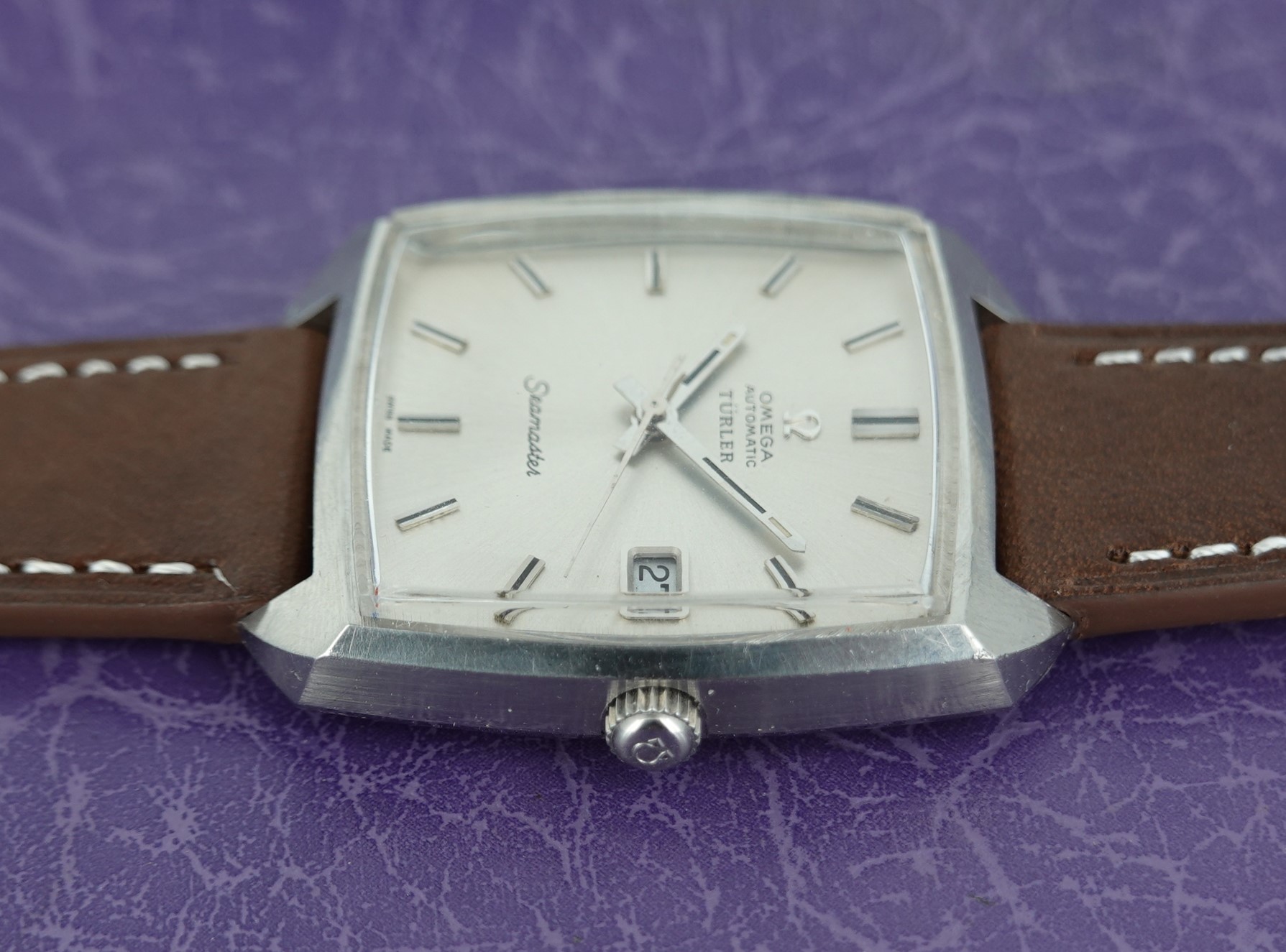 Türler, like other high end retailers such as Tiffany or Meister, would have their name added to the dials of some of the watches they sold and this now makes those watches more collectible – but with this being an Omega, sold in bigger numbers than some brands, it will not add the fortunes that a Tiffany signed Patek or Rolex would demand. But it does add a little, especially once you factor in the rarer case shape that this Seamaster has. The movement Omega chose to use was their calibre 565, a 24 jewel automatic with swan neck fine adjustment that was a staple of the late 1960’s for Omega. It has quick set date, operated by pulling the crown outwards. The case does come apart as designed – sometimes this style of case can seize, not allowing any access to the movement, so always worth checking. The case also has a graze near two worth pointing out. The leather strap is new, and could be swapped for a different colour or material if preferred. The watch is signed on the dial, case, movement and crown.