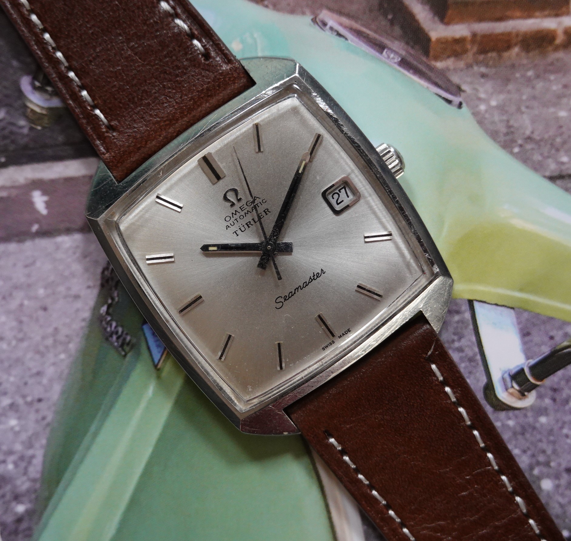 With a square, key-bolt compressor case, this Seamaster has some extra sauce in the co-signed dial from Omega’s retail partner Turler. Model reference 166.0042.