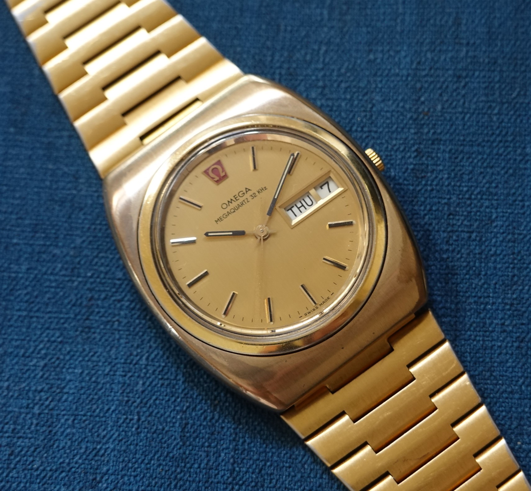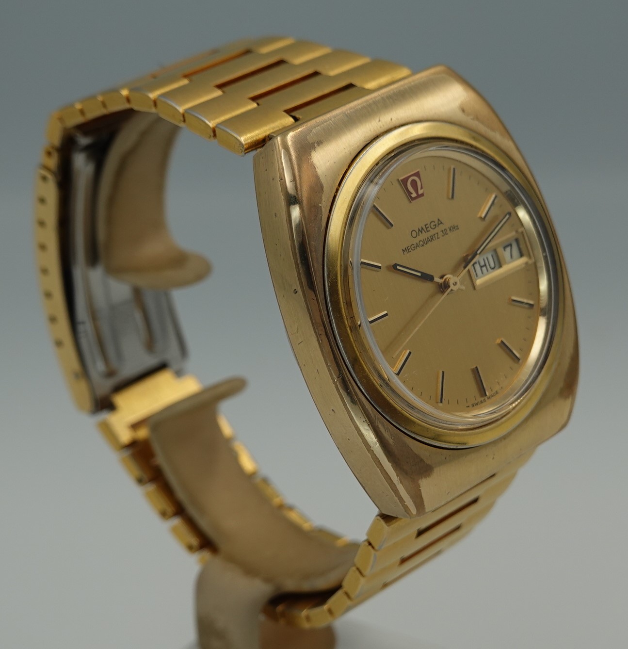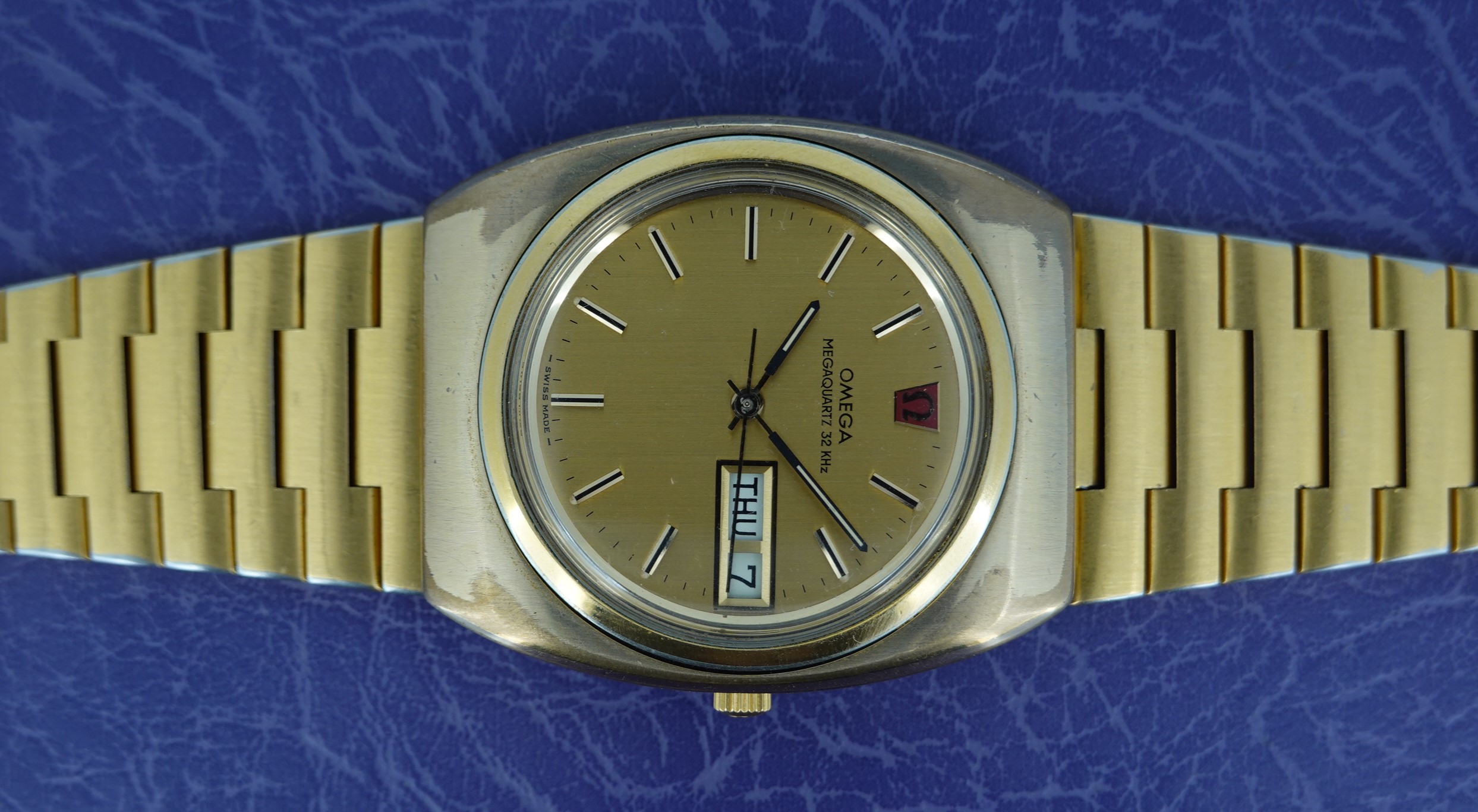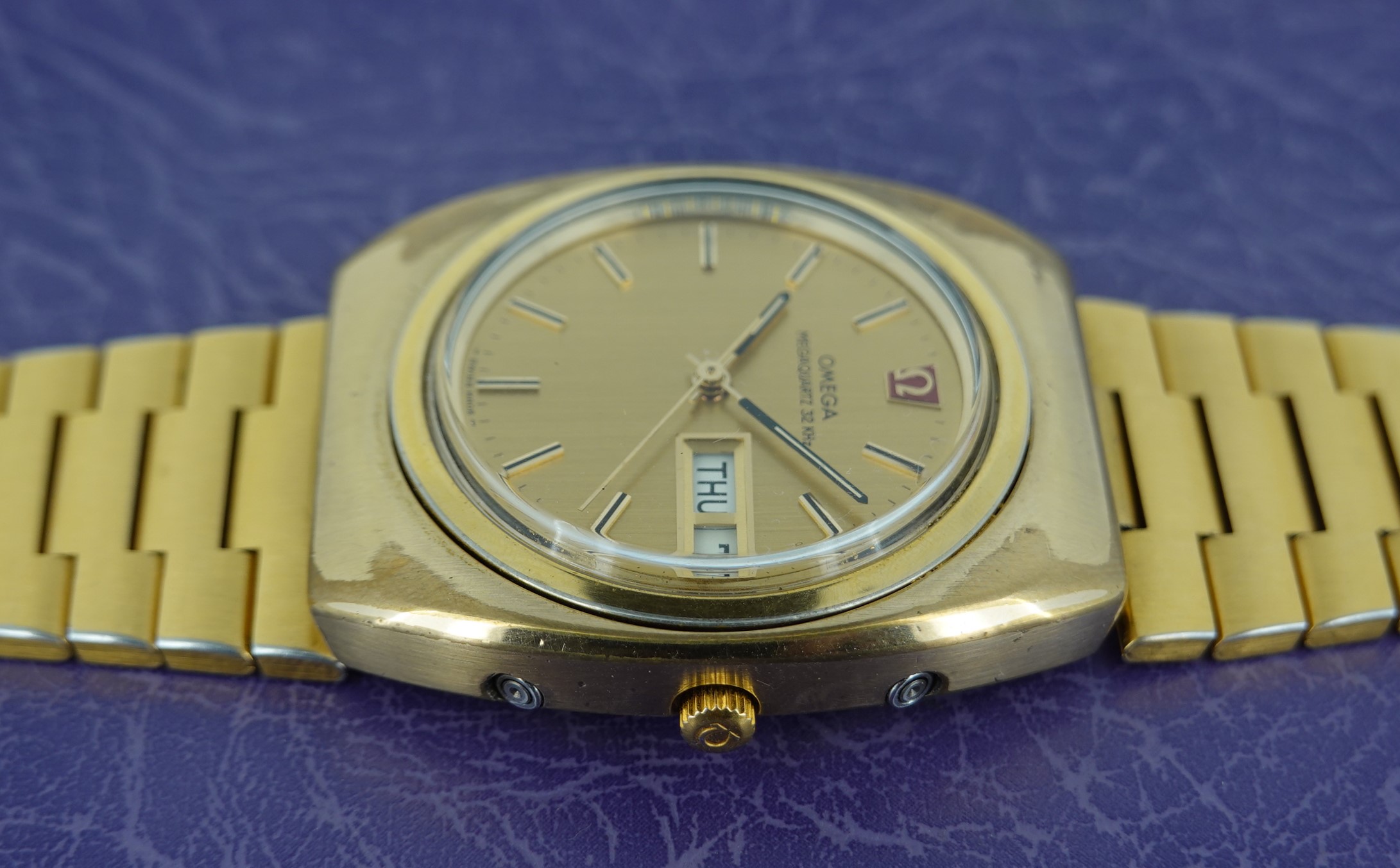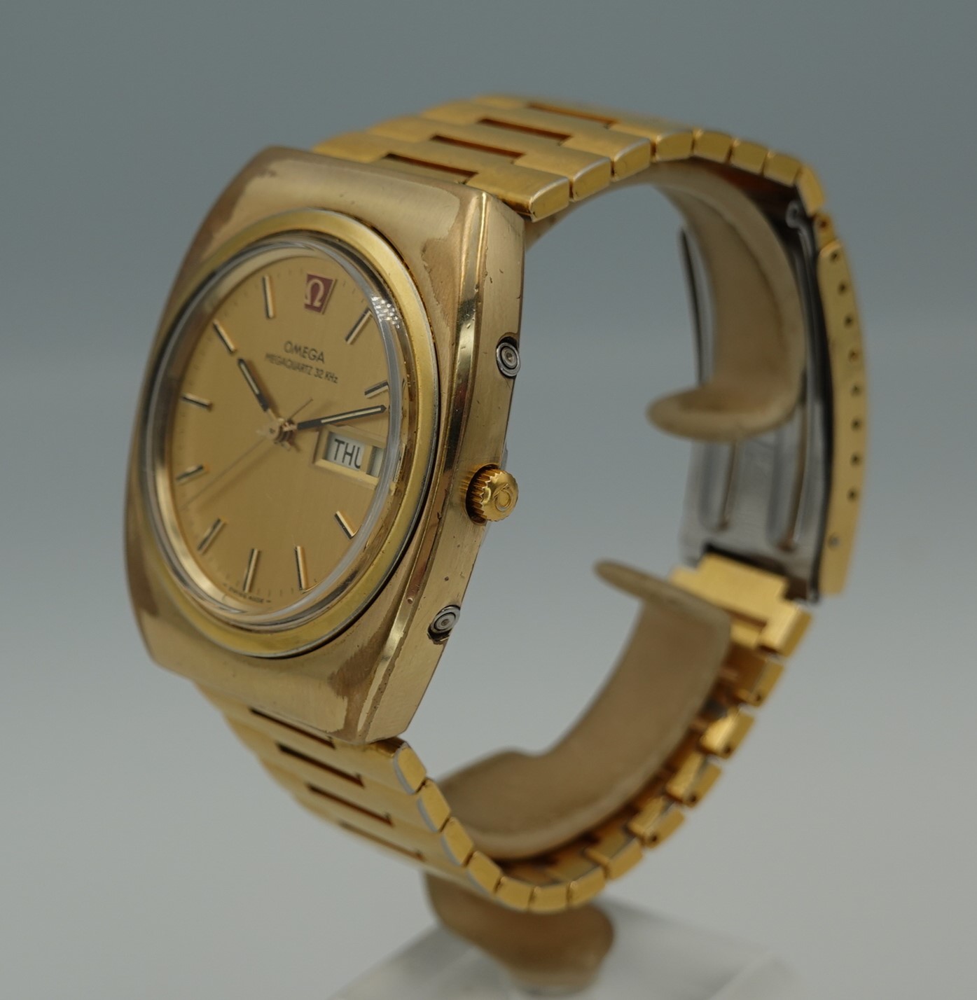 The Megaquartz made a point of telling the customer that this watch runs at 32kHz. This is the norm for almost all quartz watches today, but when this watch launched the earlier quartz watches ran at 8kHz. To almost everyone, this doesn’t matter, but this is why this watch makes the point of 32kHz. We have to remember that quartz was still quite new o the market, having been launched just 8 years before. The movement is Omega’s calibre 1315, an in house design which has eight jewels and a number of extra features. The hour hand can be set independently, which is also how you advance the day and date. If you just need to adjust the date, there is a pusher at 4 for that. If you want to advance or hack the seconds, press the pusher at 2 for that. Everything is working well, and we will install a brand new battery before sending the watch out to the new owner. The case is quite chunky, and does show some signs of wear to the gold plating but on the whole it presents well, especially in natural light outside of our studio. The bracelet also does show some wear, mainly on the back part of the wrist, which is harder for the wearer to see. The bracelet is quite long and our sister website, SpareLinks.com, may have extra links if required. The bracelet has been cleaned in our ultrasonic bath. The dial is good, and the crystal is the original signed item. The watch is signed on the dial, case, movement, crown, crystal and clasp.