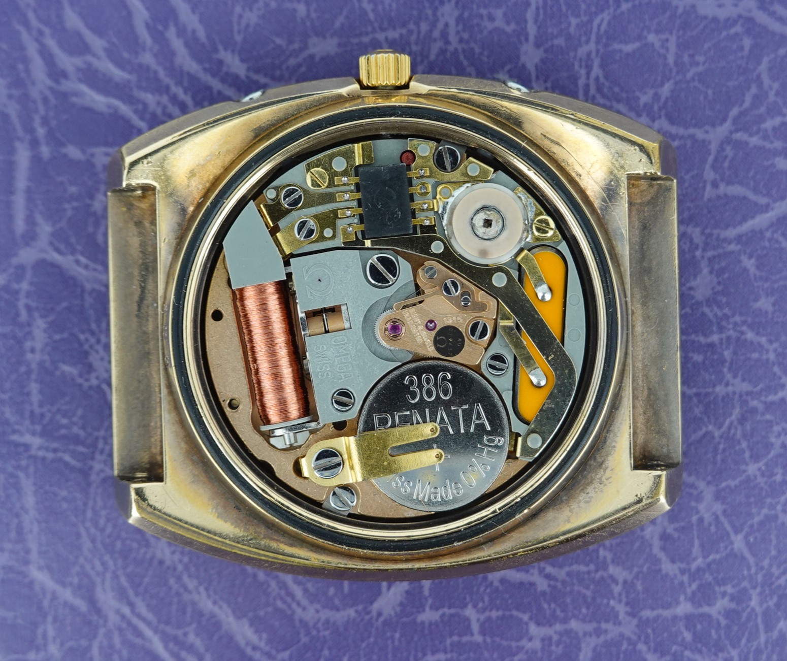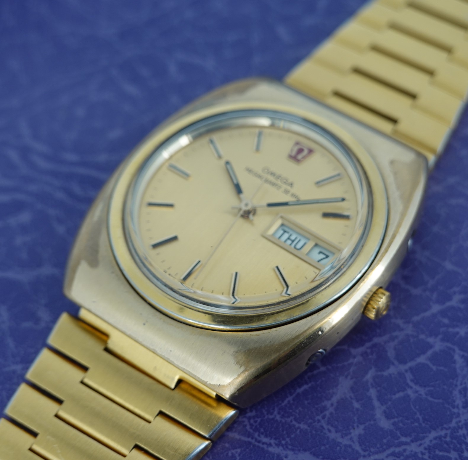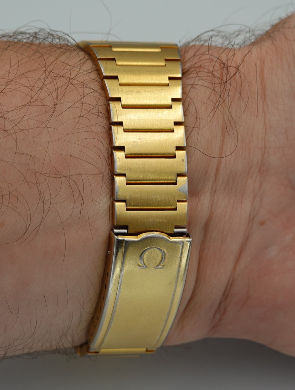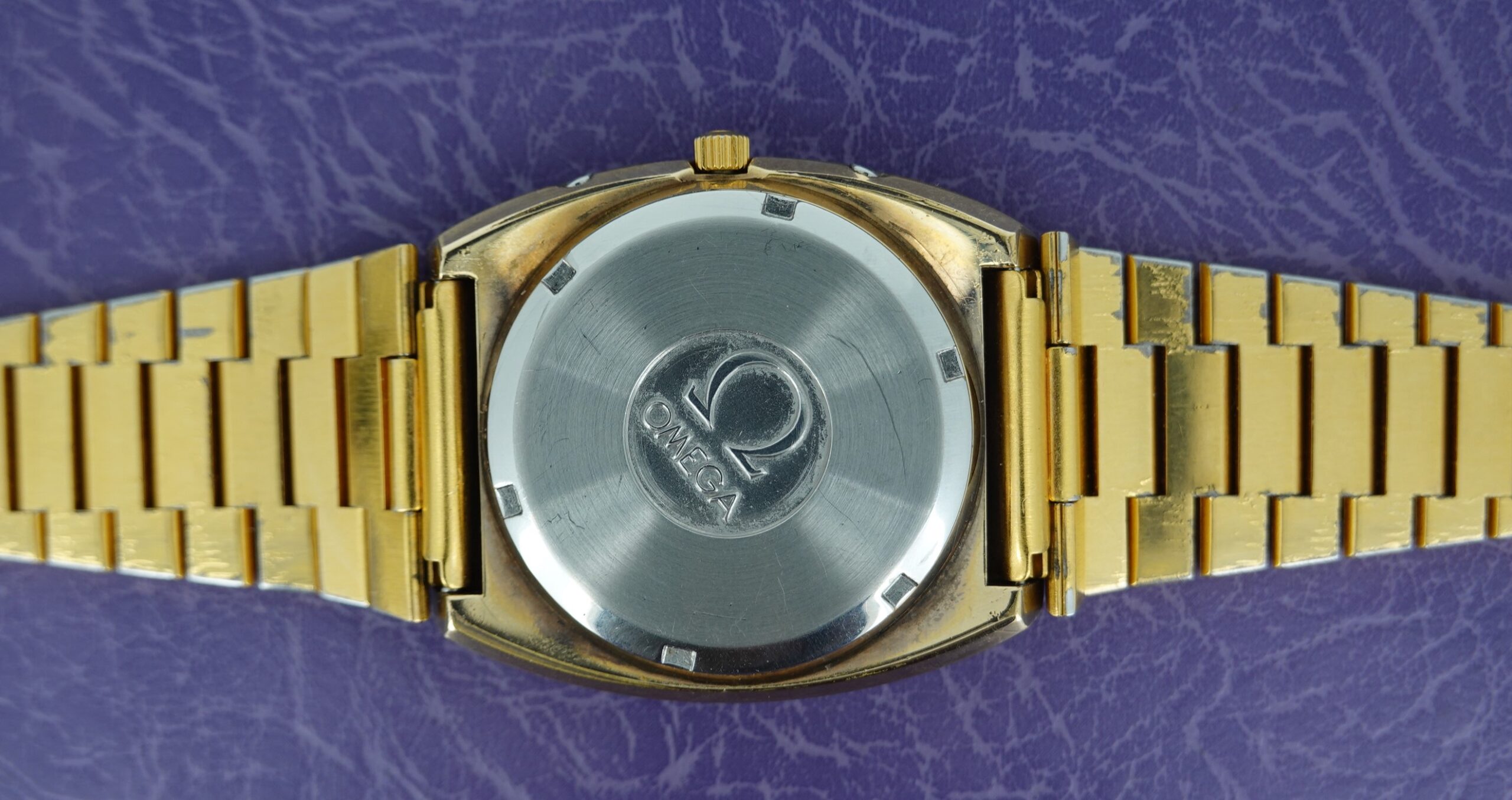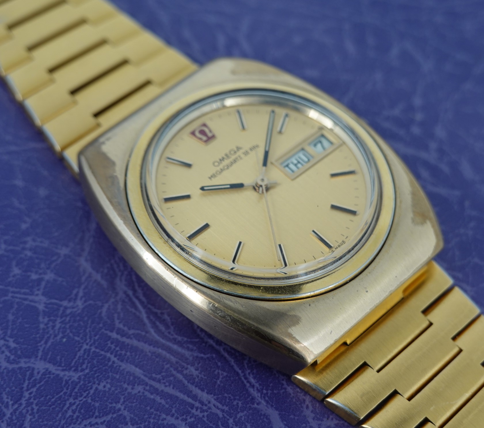 The Megaquartz made a point of telling the customer that this watch runs at 32kHz. This is the norm for almost all quartz watches today, but when this watch launched the earlier quartz watches ran at 8kHz. To almost everyone, this doesn’t matter, but this is why this watch makes the point of 32kHz. We have to remember that quartz was still quite new o the market, having been launched just 8 years before. The movement is Omega’s calibre 1315, an in house design which has eight jewels and a number of extra features. The hour hand can be set independently, which is also how you advance the day and date. If you just need to adjust the date, there is a pusher at 4 for that. If you want to advance or hack the seconds, press the pusher at 2 for that. Everything is working well, and we will install a brand new battery before sending the watch out to the new owner. The case is quite chunky, and does show some signs of wear to the gold plating but on the whole it presents well, especially in natural light outside of our studio. The bracelet also does show some wear, mainly on the back part of the wrist, which is harder for the wearer to see. The bracelet is quite long and our sister website, SpareLinks.com, may have extra links if required. The bracelet has been cleaned in our ultrasonic bath. The dial is good, and the crystal is the original signed item. The watch is signed on the dial, case, movement, crown, crystal and clasp.