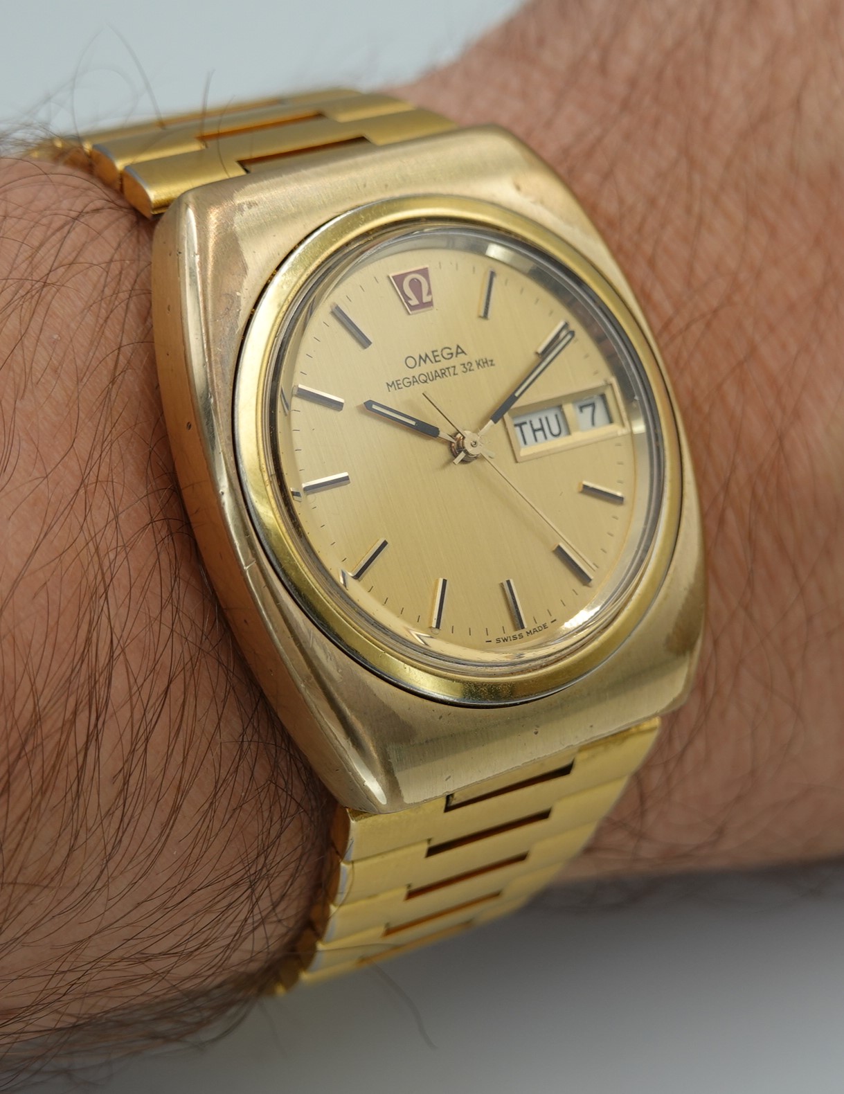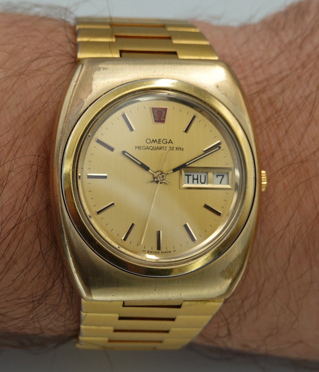 A bold, triple gold Omega Megaquartz 32kHz on the optional bracelet. Model reference 196.0030.