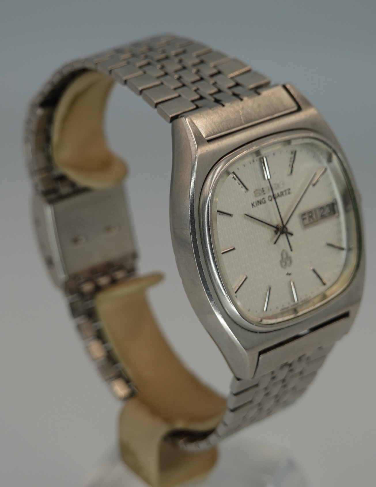 The three best Seiko watches you could buy in 1978 were the Superior (¥180,000), Grand Quartz (¥100,000) and King Quartz, with this example costing ¥60,000. In the same catalogue a mechanical, automatic Seiko chronograph was ¥19,000, so at this point in history Quartz watches were aspirational and expensive next to their old fashioned mechanical cousins. This example has the beveled crystal with is in good order, and unusually patterned dial and quick set day and date. The day can be set to either English or Kanji. We will install a brand new battery before sending the watch out to the new owner. The bracelet is full length and can be adjusted on the KQ signed sliding clasp without the need for special tools. The bracelet has been cleaned in our ultrasonic bath. The watch is signed on the dial, case, movement, crown, clasp.