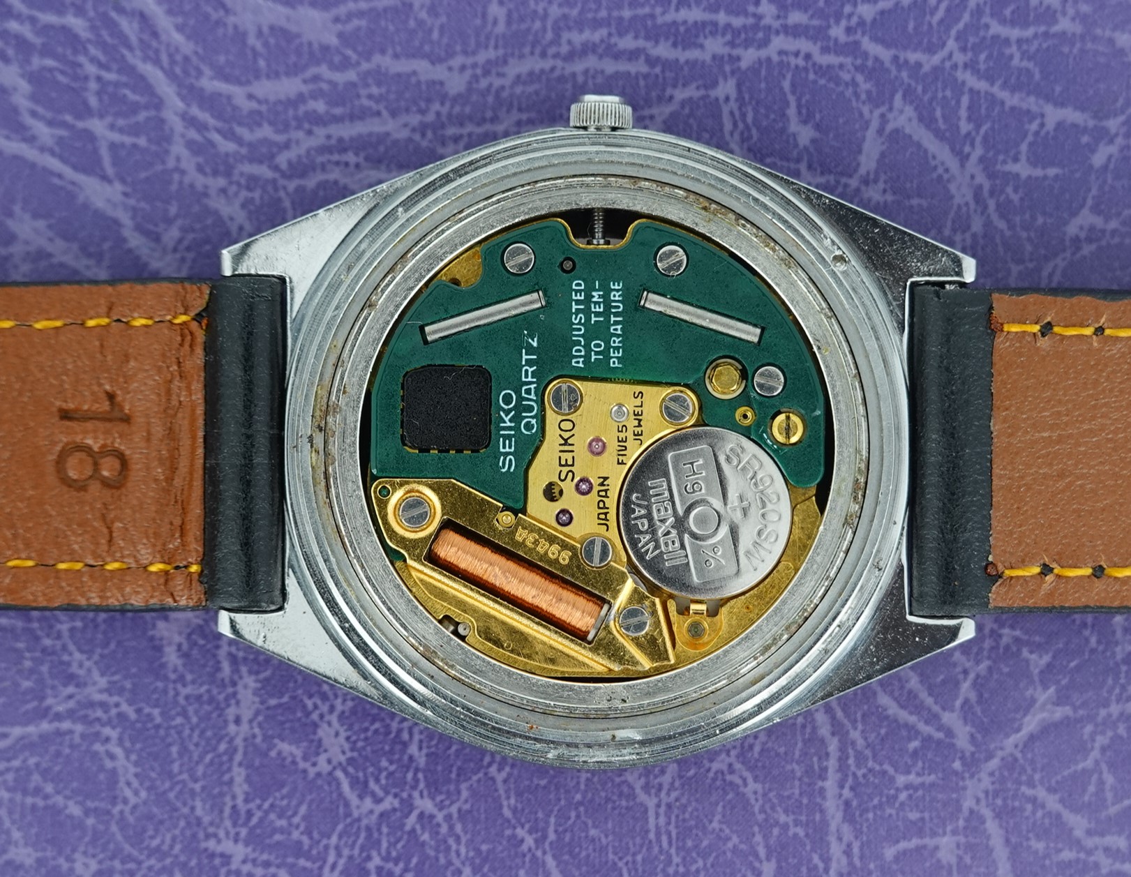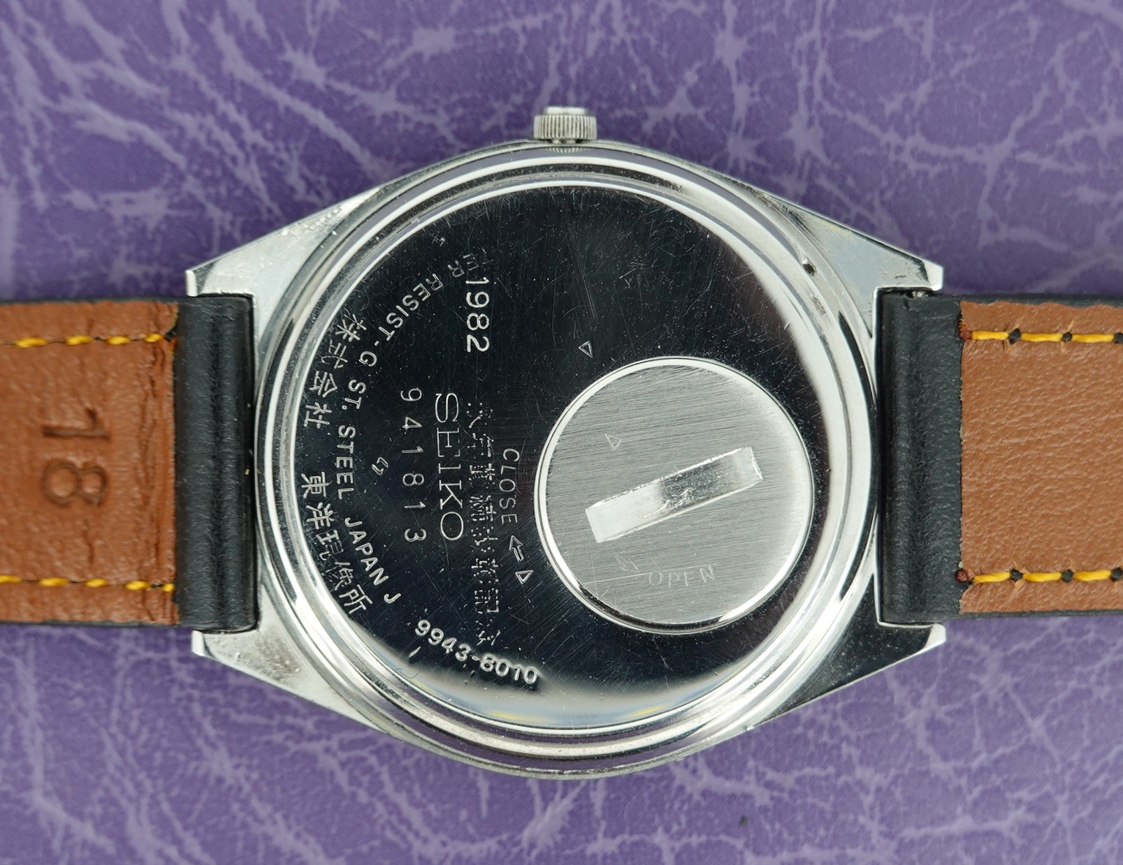 From the serial number on the case back we can accurately date this watch to being made in April 1979. There is another inscription on the case back to show it was gifted in 1982. Both years therefore would be valid for a birth year watch.