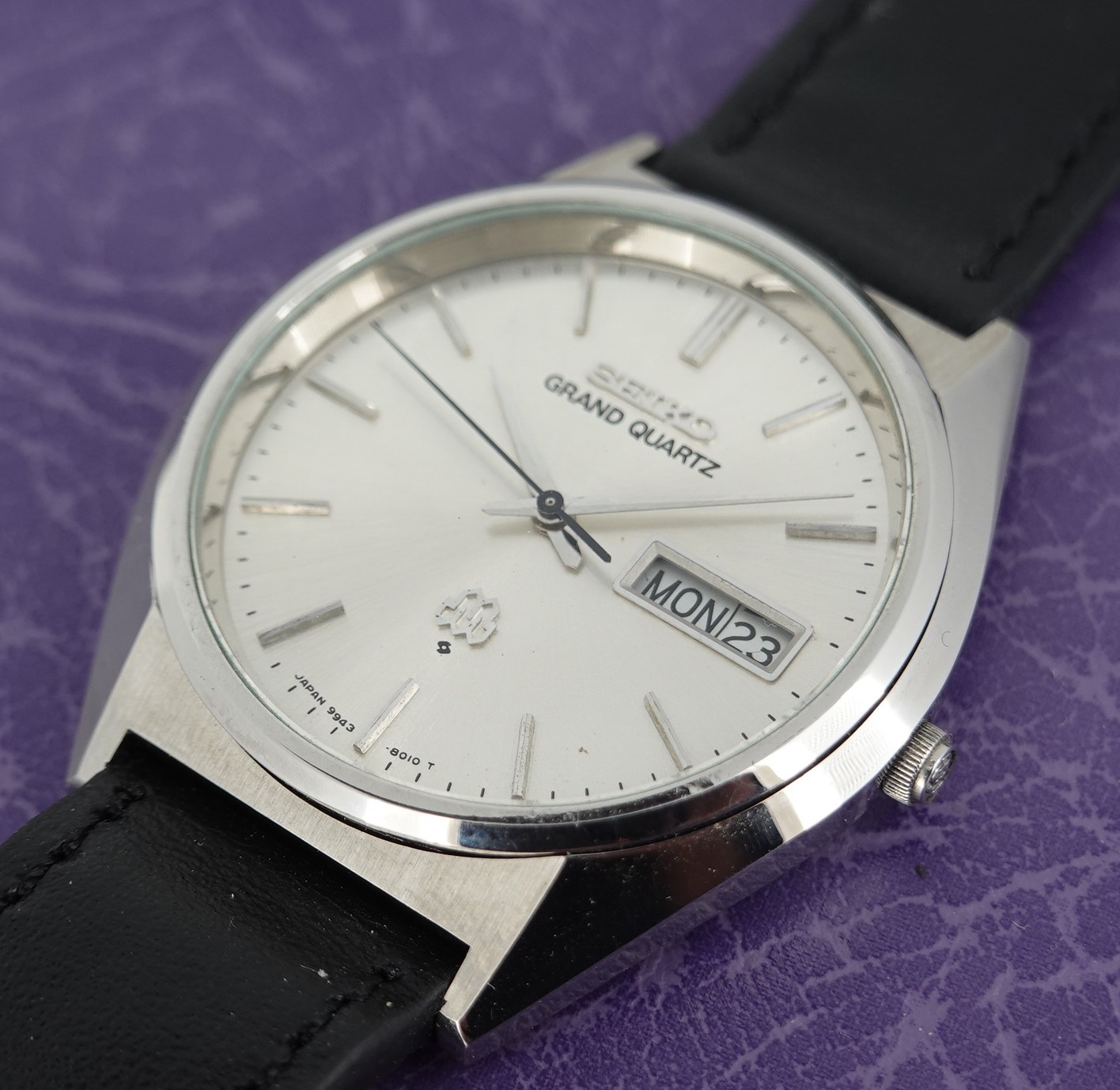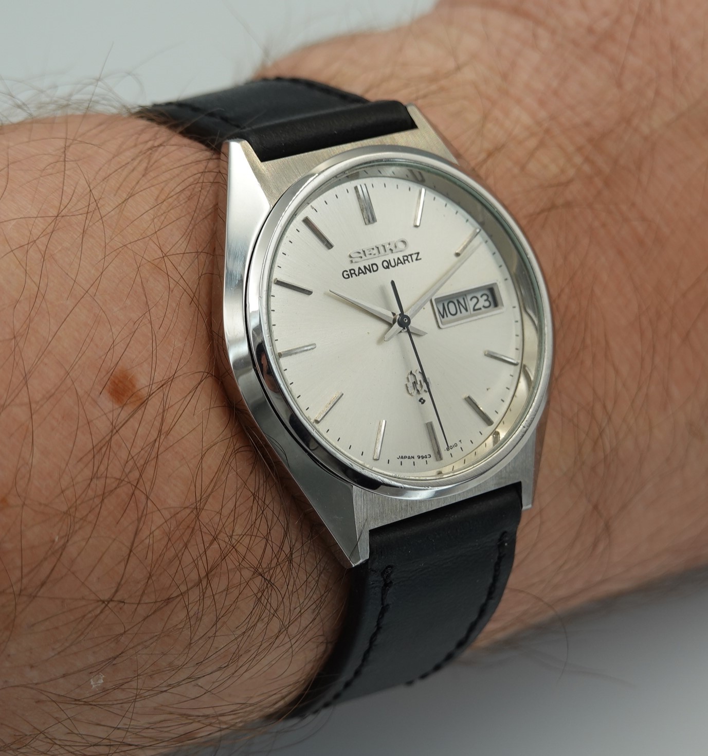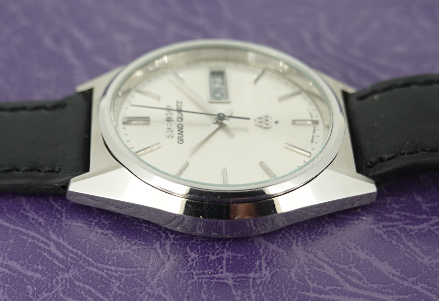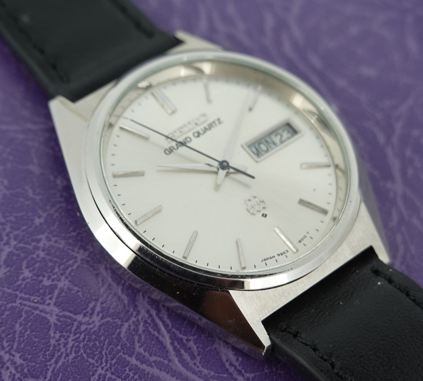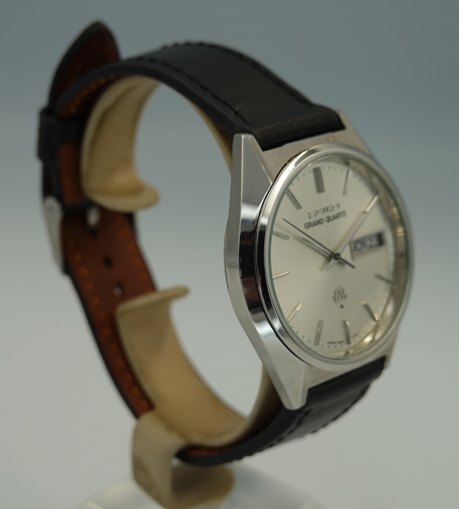 This was one of the cheapest Grand Quartz models in the 1979 catalogue at ¥80,000, mainly due to the fact that this watch never came on a bracelet but instead was always designed to be on a leather strap. Not that it was cheap – you had a wide choice of other Seiko’s in 1979 around ¥30,000, but the Grand Quartz had the highly accurate 9943 movement that promised less than a second per month accuracy when new. This one is running just over that, at 1.24 seconds per month (or 0.04 of one second per day fast), which is remarkable and a testament to the Seiko design and quality. You also get quick set day and date, with the day being available in either English or Kanji. We will install a brand new battery before sending the watch out to the new owner. The case and dial are very good in this example. Because this model never had a bracelet, you have a wider choice of straps available to you including XL versions – ideal if you like the Grand Quartz but find all the bracelets on the smaller side. This leather strap is new, and could be swapped for a different colour or material if preferred. The watch is signed on the dial, case, movement and crown (with the twin quartz logo).