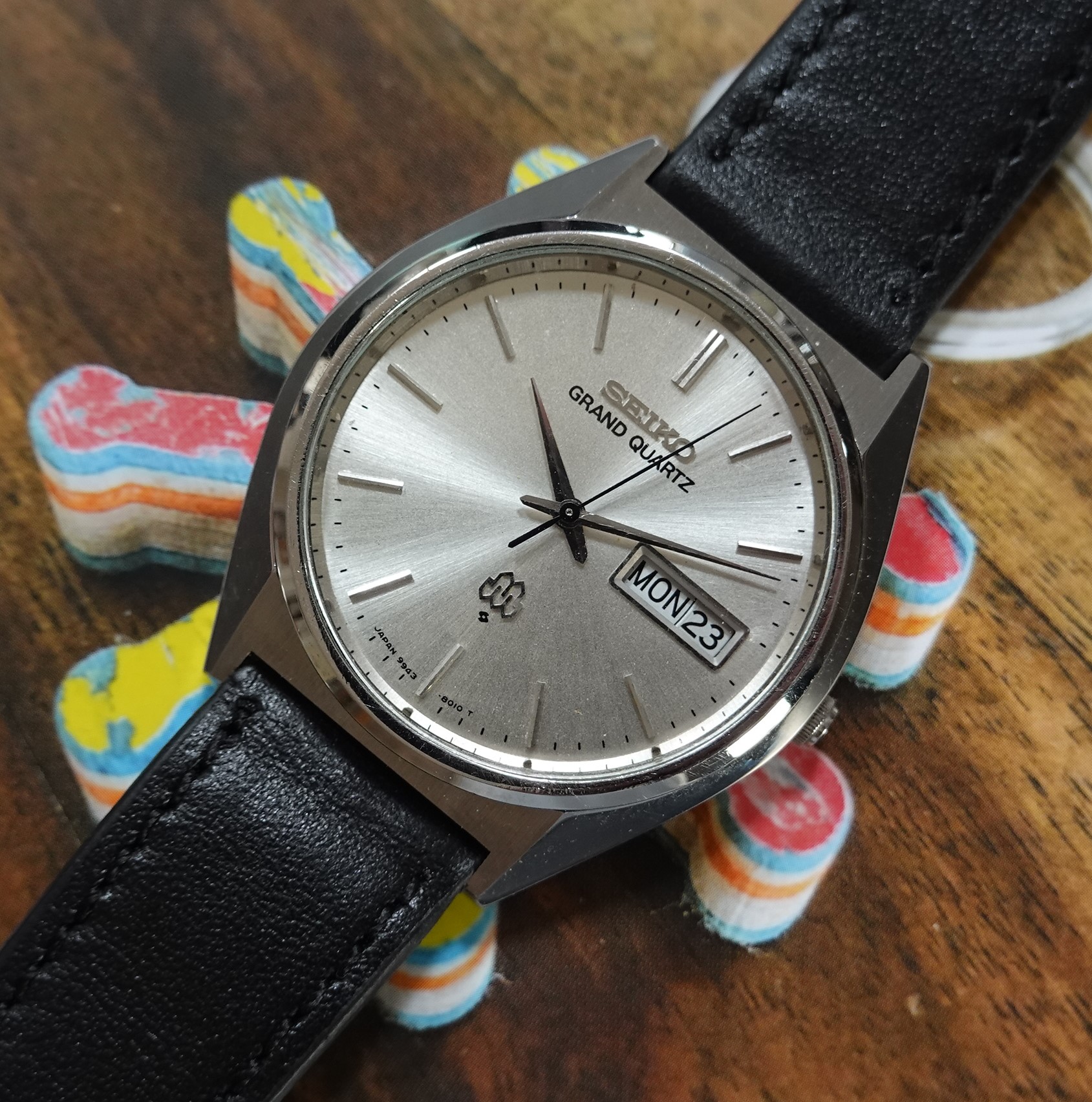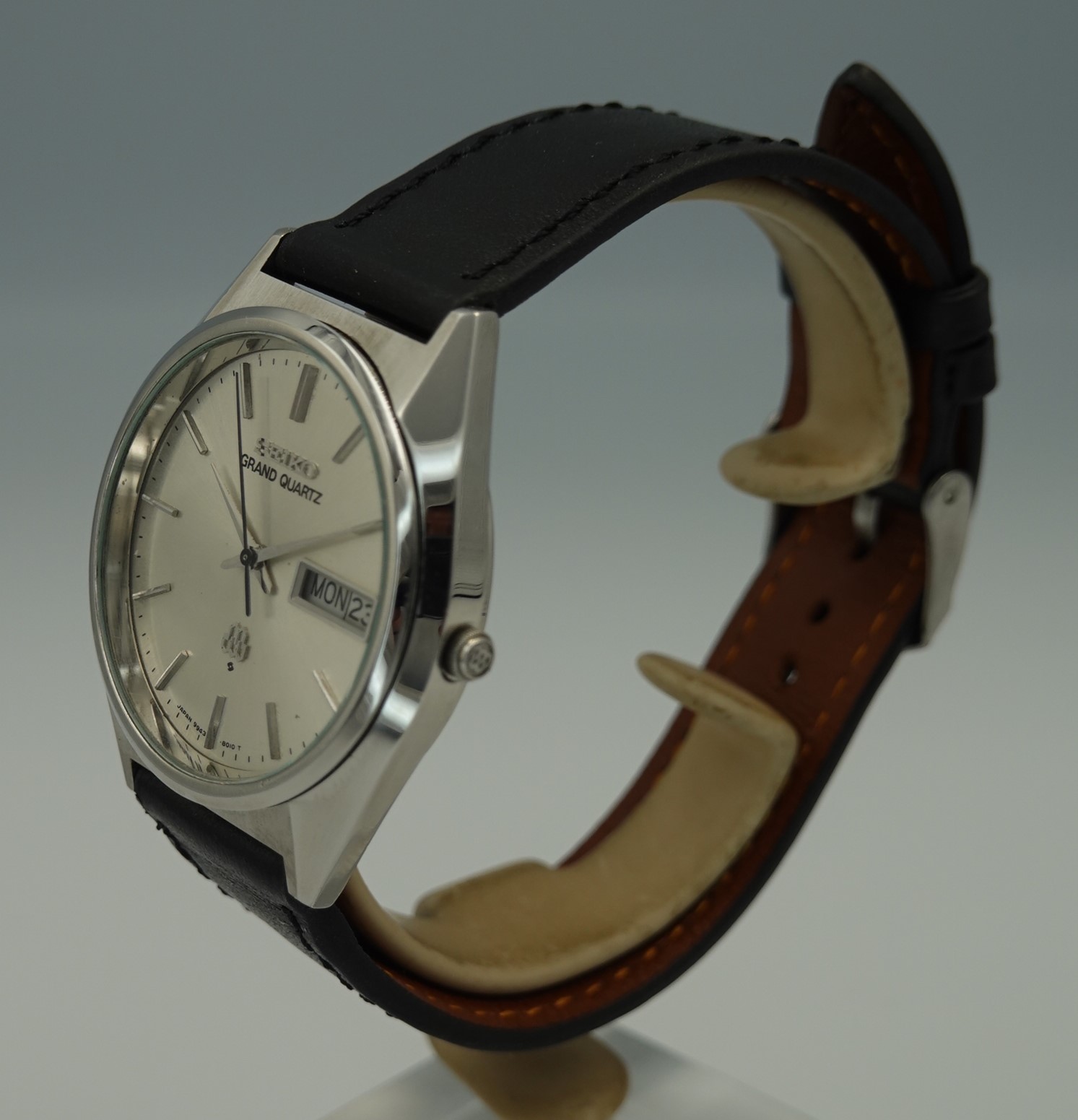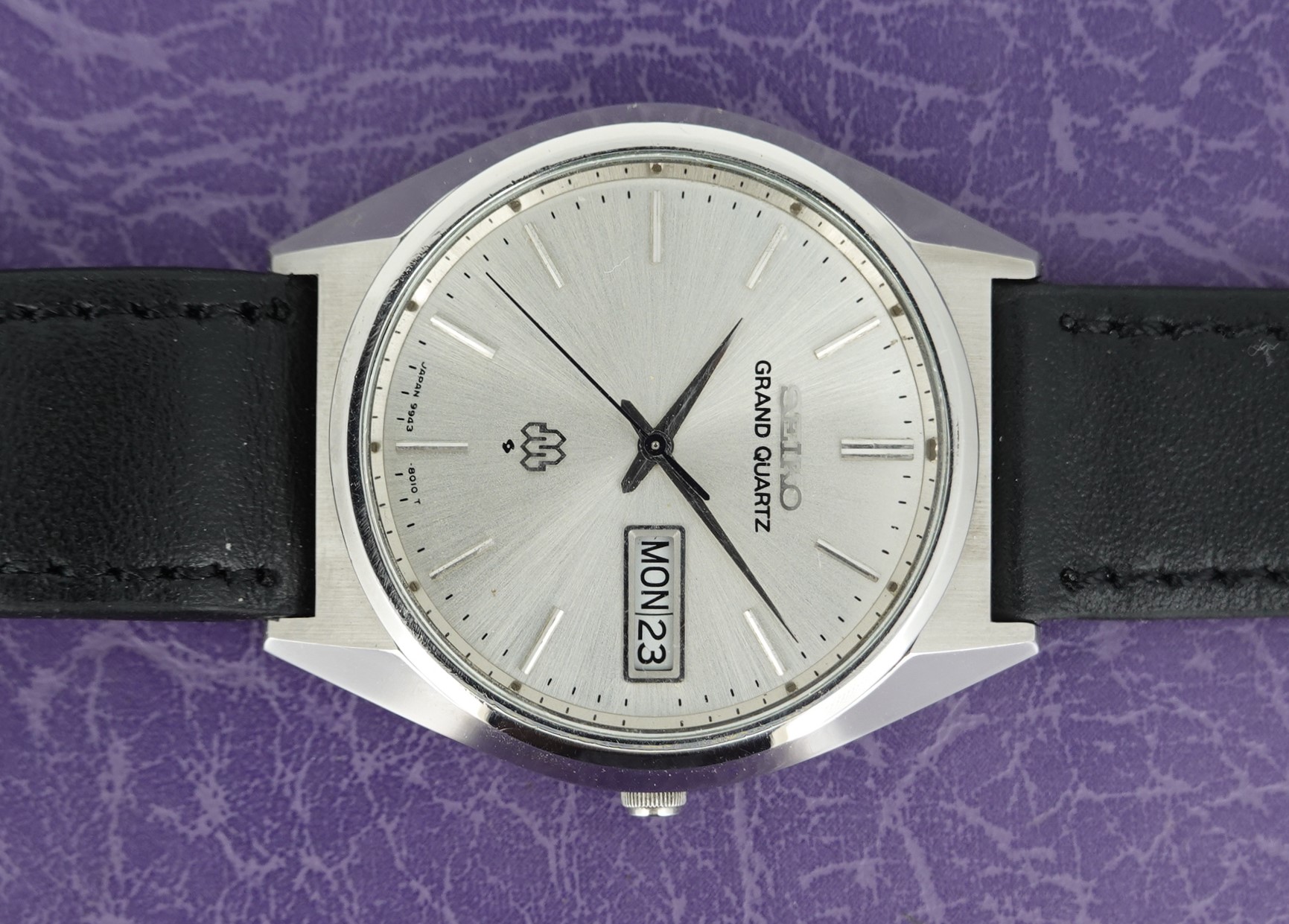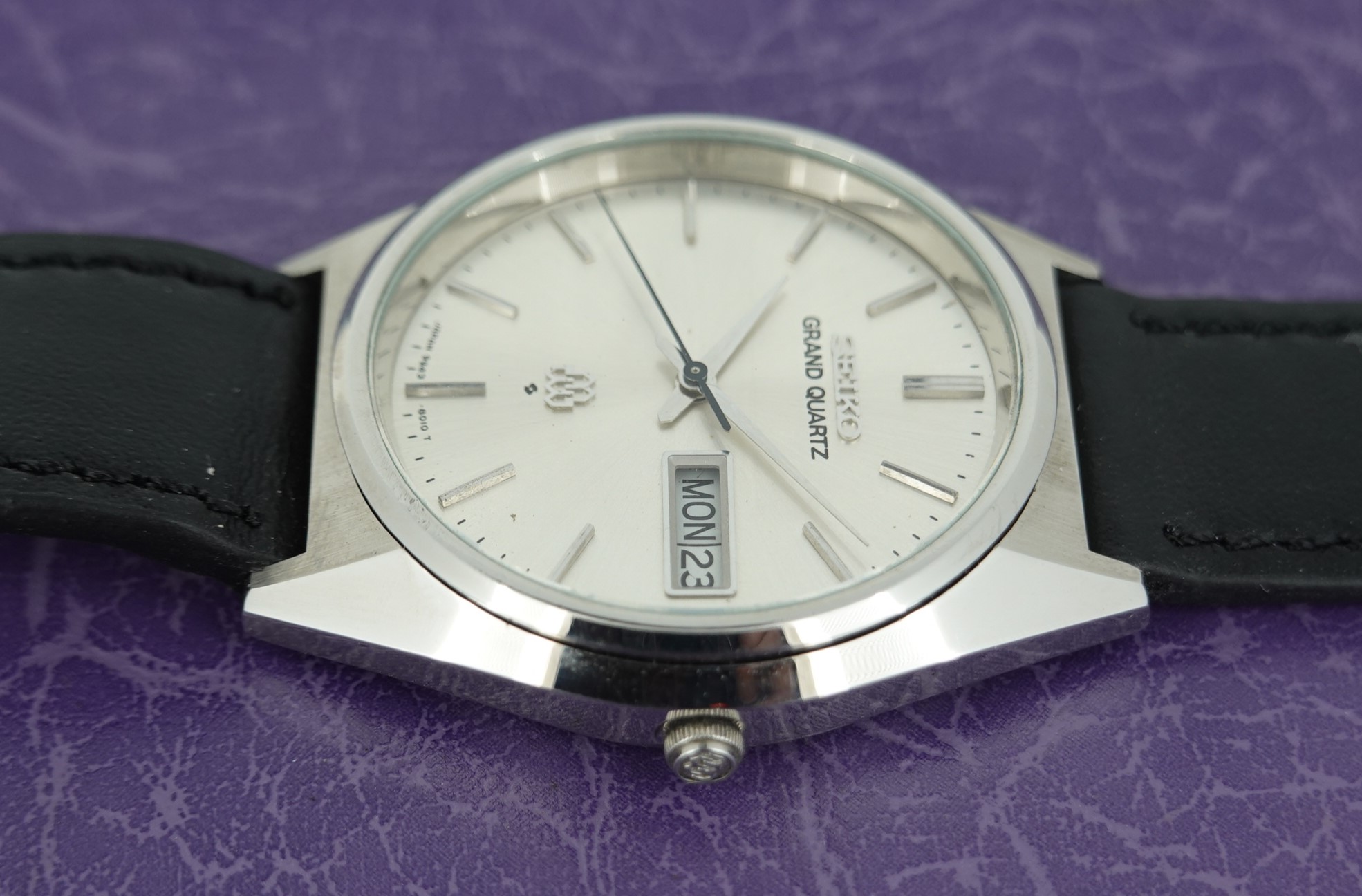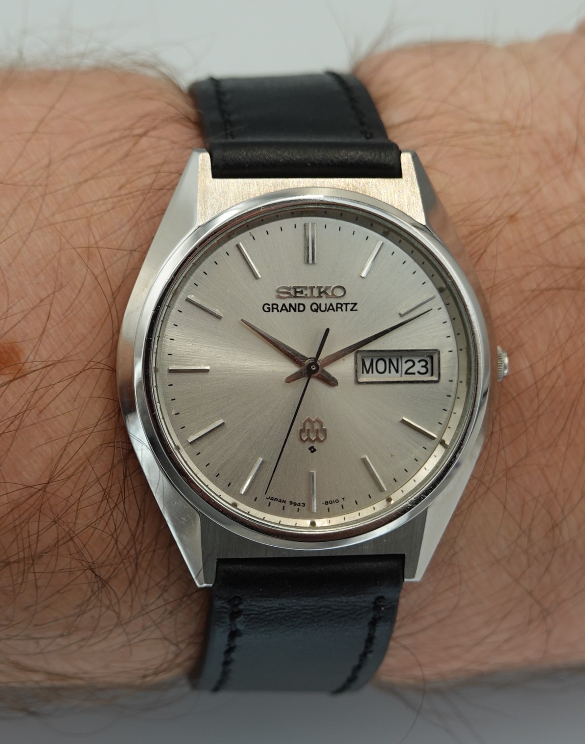This was one of the cheapest Grand Quartz models in the 1979 catalogue at ¥80,000, mainly due to the fact that this watch never came on a bracelet but instead was always designed to be on a leather strap. Not that it was cheap – you had a wide choice of other Seiko’s in 1979 around ¥30,000, but the Grand Quartz had the highly accurate 9943 movement that promised less than a second per month accuracy when new. This one is running just over that, at 1.24 seconds per month (or 0.04 of one second per day fast), which is remarkable and a testament to the Seiko design and quality. You also get quick set day and date, with the day being available in either English or Kanji. We will install a brand new battery before sending the watch out to the new owner. The case and dial are very good in this example. Because this model never had a bracelet, you have a wider choice of straps available to you including XL versions – ideal if you like the Grand Quartz but find all the bracelets on the smaller side. This leather strap is new, and could be swapped for a different colour or material if preferred. The watch is signed on the dial, case, movement and crown (with the twin quartz logo).