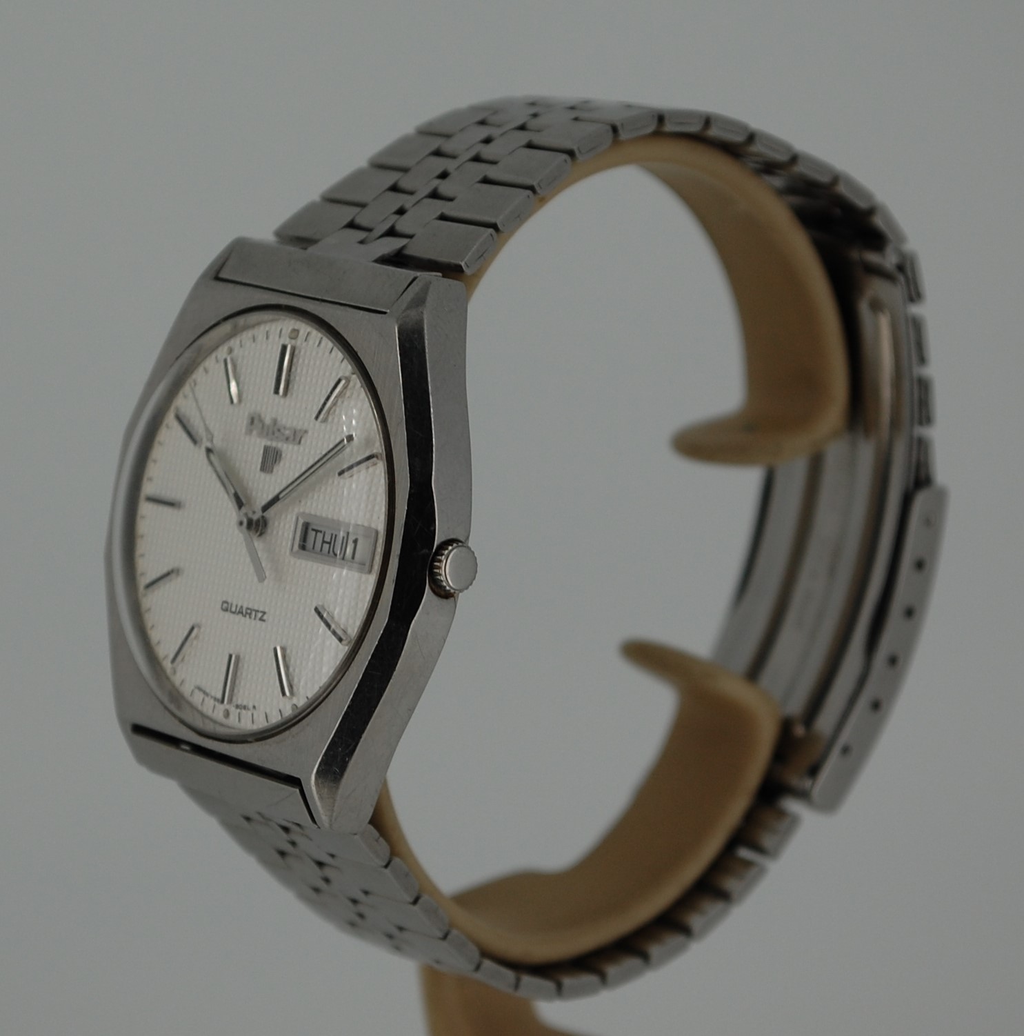 This watch has a fantastic dial, with a mesh pattern dial which is not unlike the appearance of the tapisserie dial in a Royal Oak. Comparing any watch at this price to one many thousands of pounds more in price is always a bit tricky, as you then have to say why this is cheaper. But at this point Pulsar were using stainless steel cases (later they were often chrome) and bracelets, and the folded bracelet is also stainless steel and full length. We have cleaned the bracelet in our ultrasonic bath, and hand cleaned the case and acrylic crystal. You have quick set day and date, and the day can be in English or French. We have just fitted a new battery so this is a well sorted Pulsar watch, and an excellent alternative to a Seiko of the same period.
