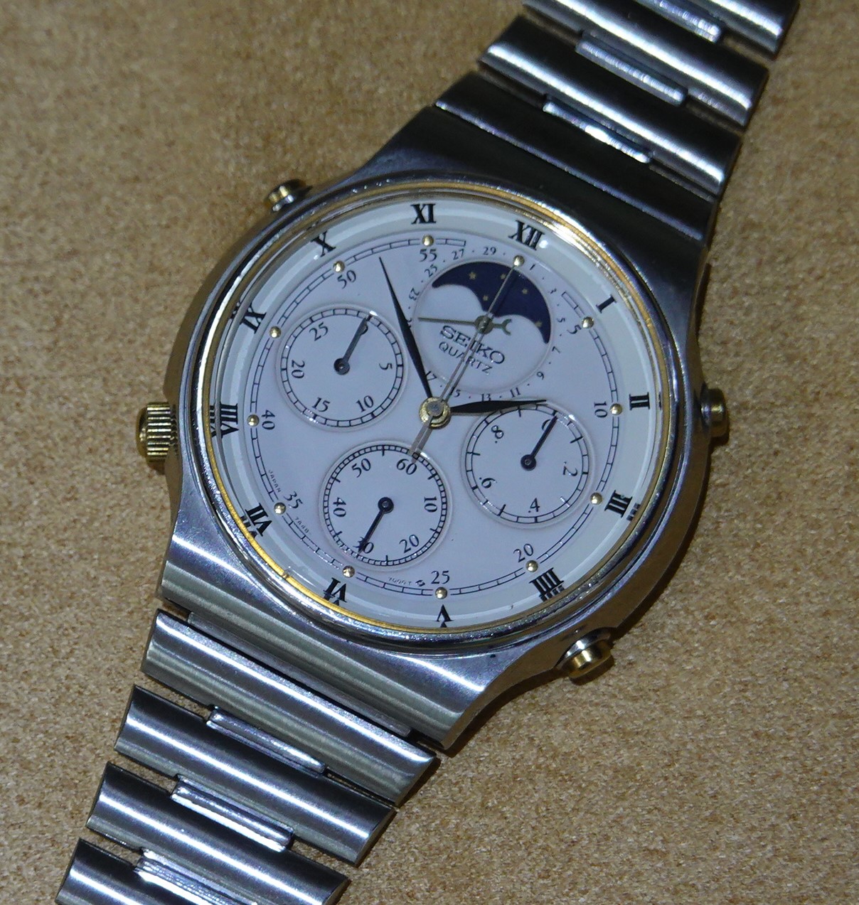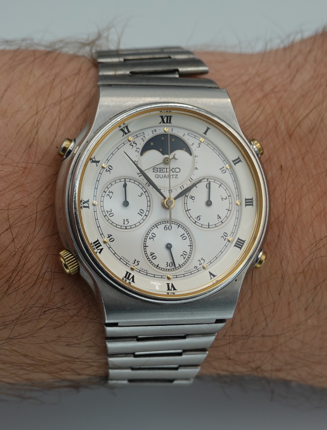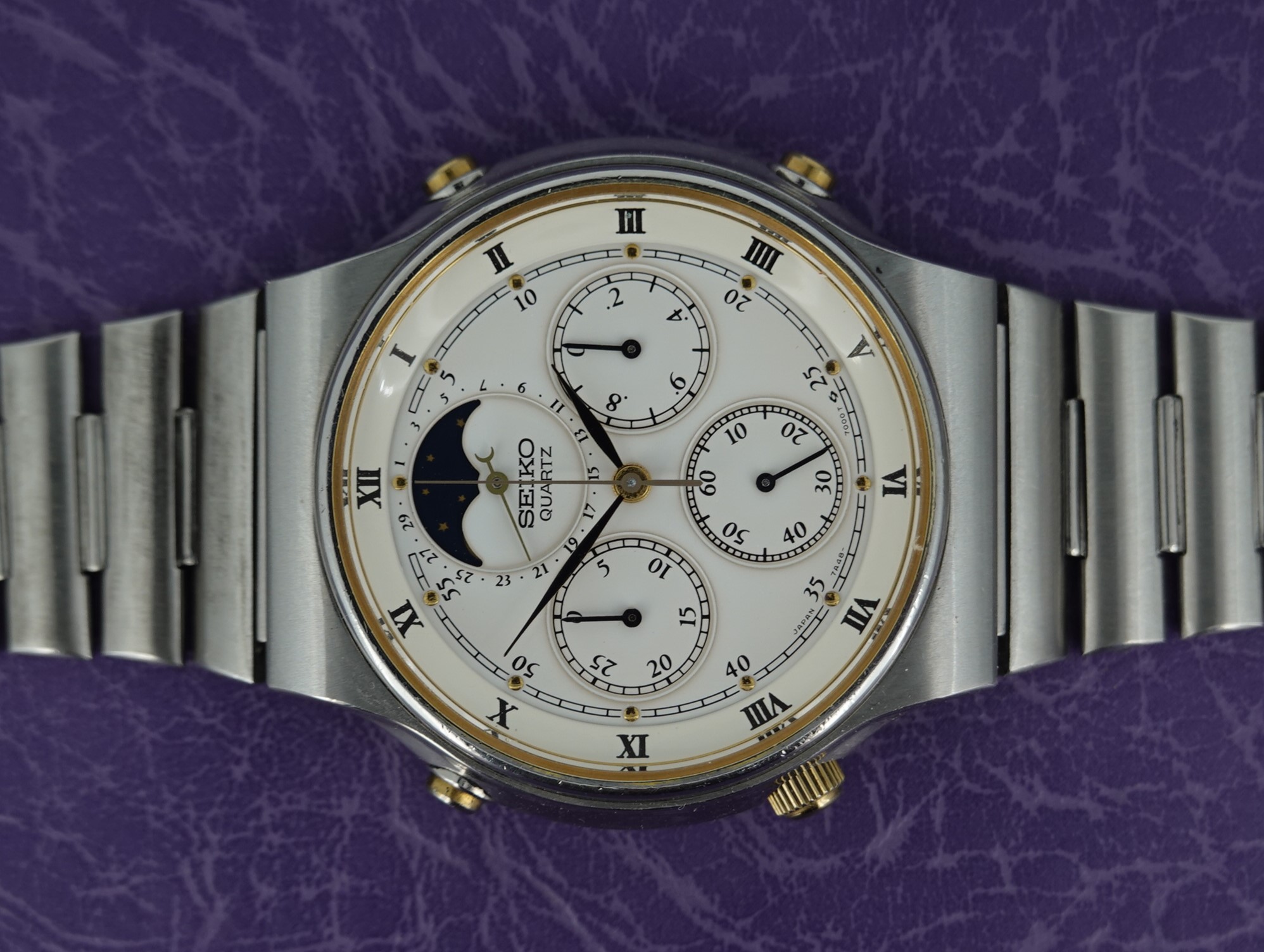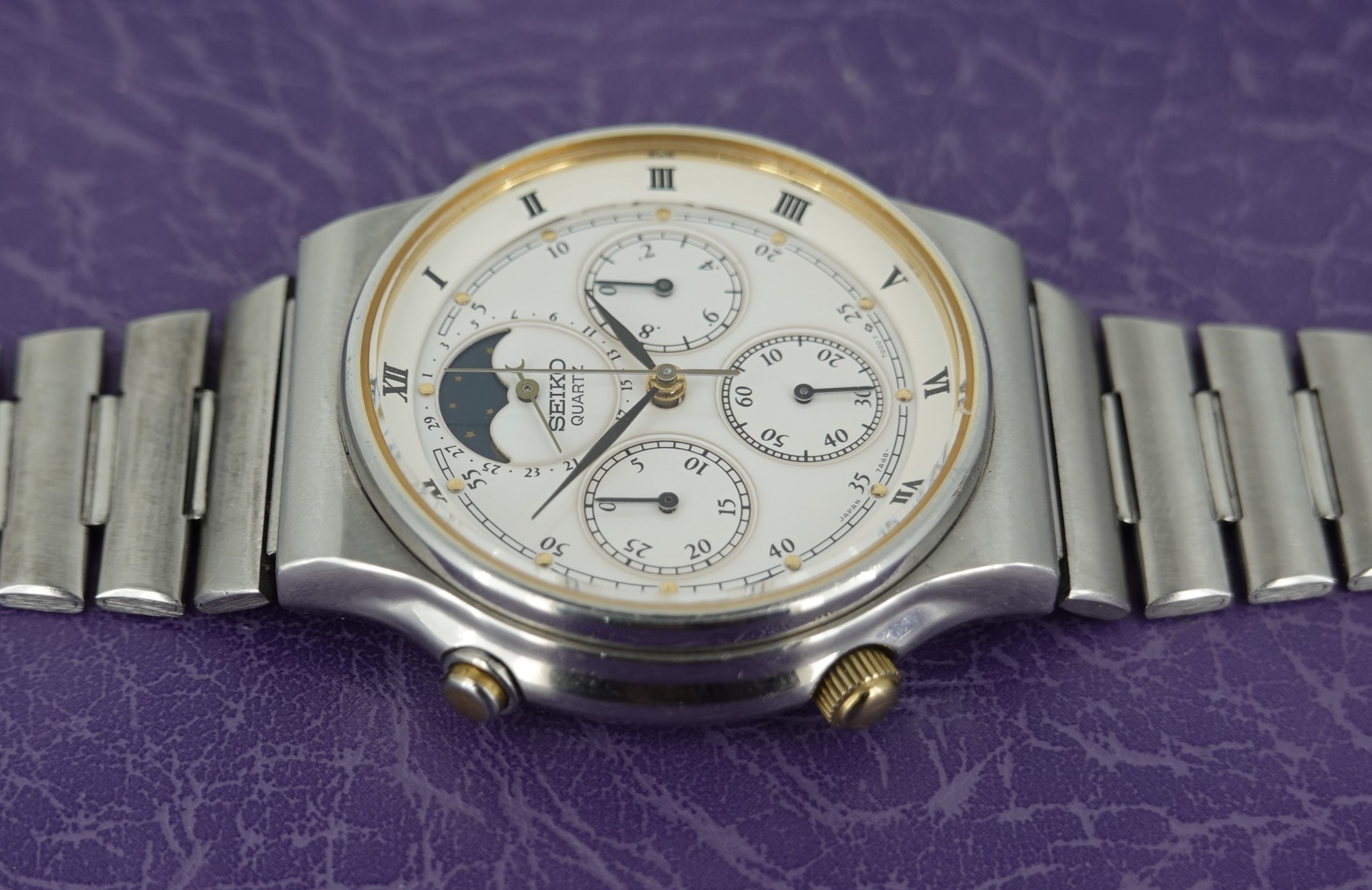 The 7A** range of watches from Seiko are always popular. Much larger than most watches of their day, they also pack a top quality quartz movement that is completely serviceable. The 7A28 was the first analogue watch to show 1/10th of a second on the chronograph, the 7A38 added a day and date window to that and the top of the range was the 7A48 which had a date hand and a full, 29 1/2 day moonphase at 12.