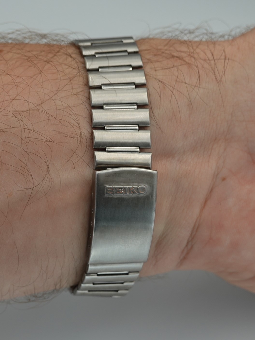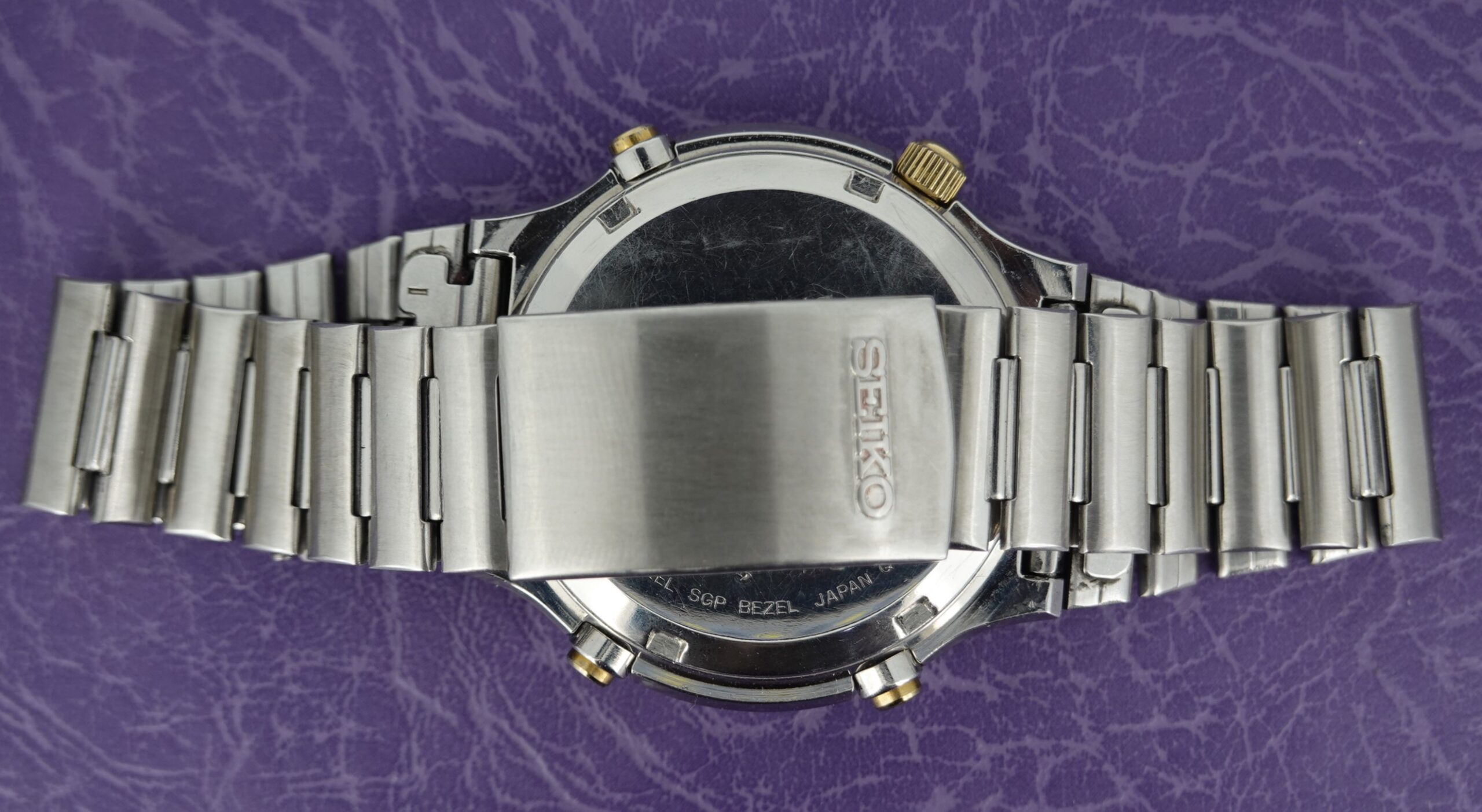 One of the reasons that make the 7A series popular is the size. With the majority of watches from this period being rectangular, small by modern standards, slim and gold plated, these are a simple choice if you prefer a larger watch. There is a hint of gold – the inner bezel, the crown and pushers, and the applied hour markers – but the vast majority of the watch is stainless steel including all the bracelet (earlier models had plated centre links, which can show wear). Everything is working correctly and we will install a brand new battery before sending the watch out to the new owner. The bracelet is full length and our sister website, SpareLinks.com, may have extra links if required. The bracelet has been cleaned in our ultrasonic bath. The watch is signed on the dial, case, movement and clasp.