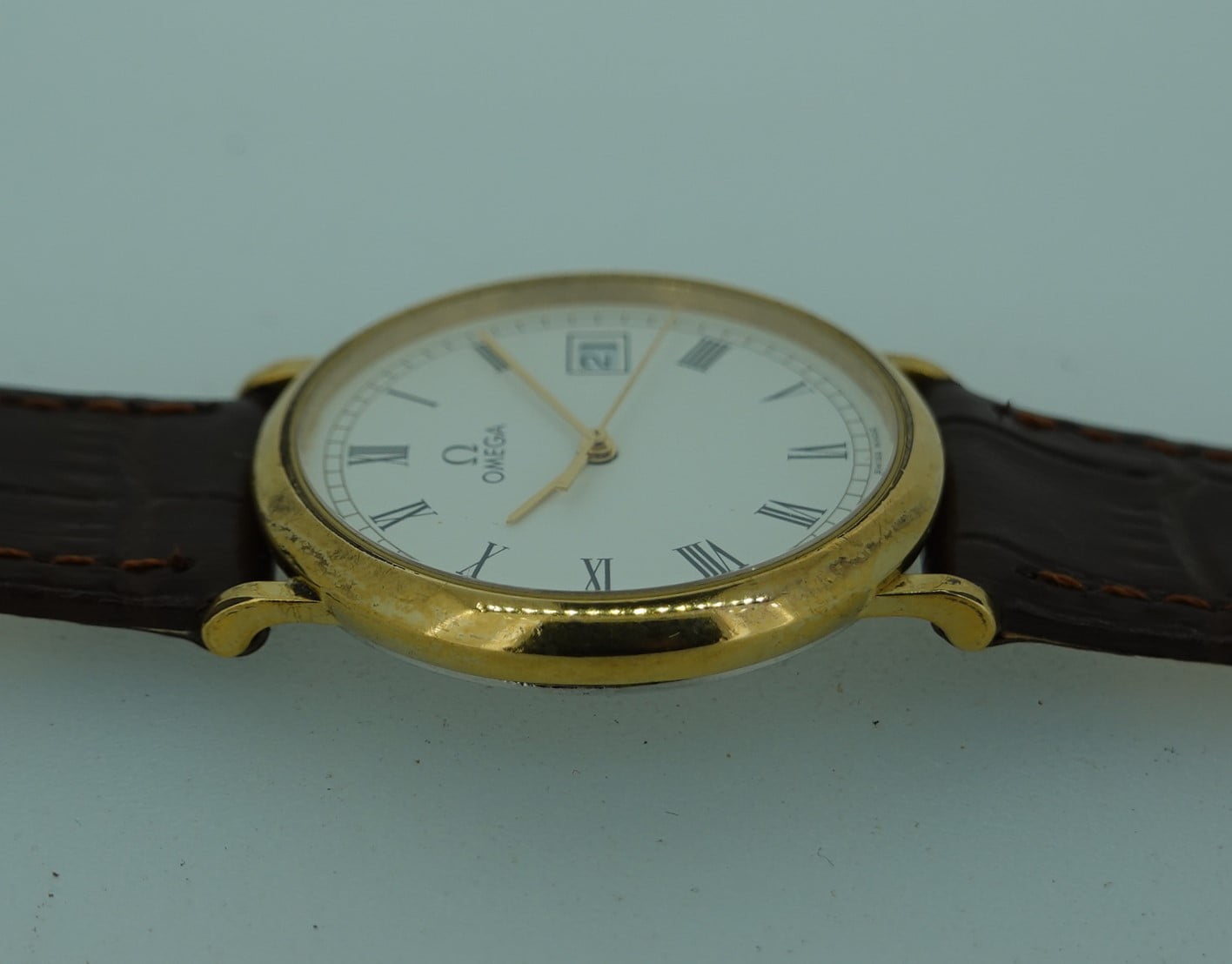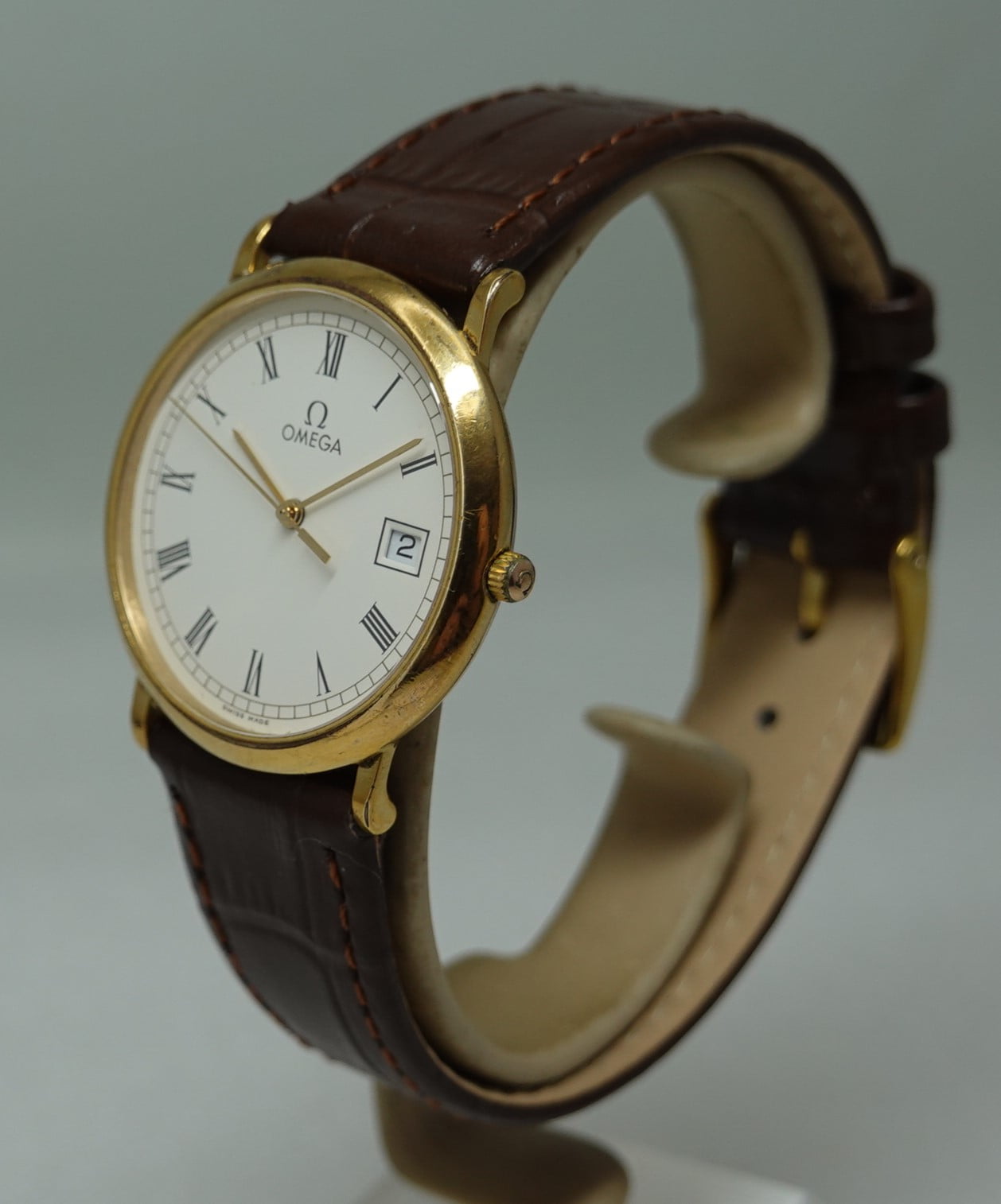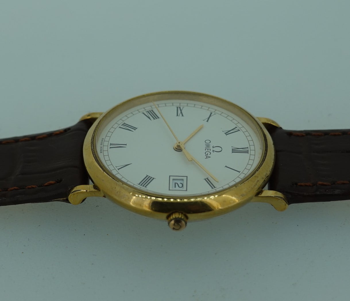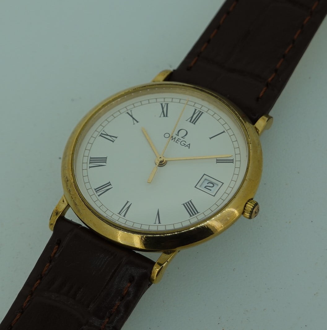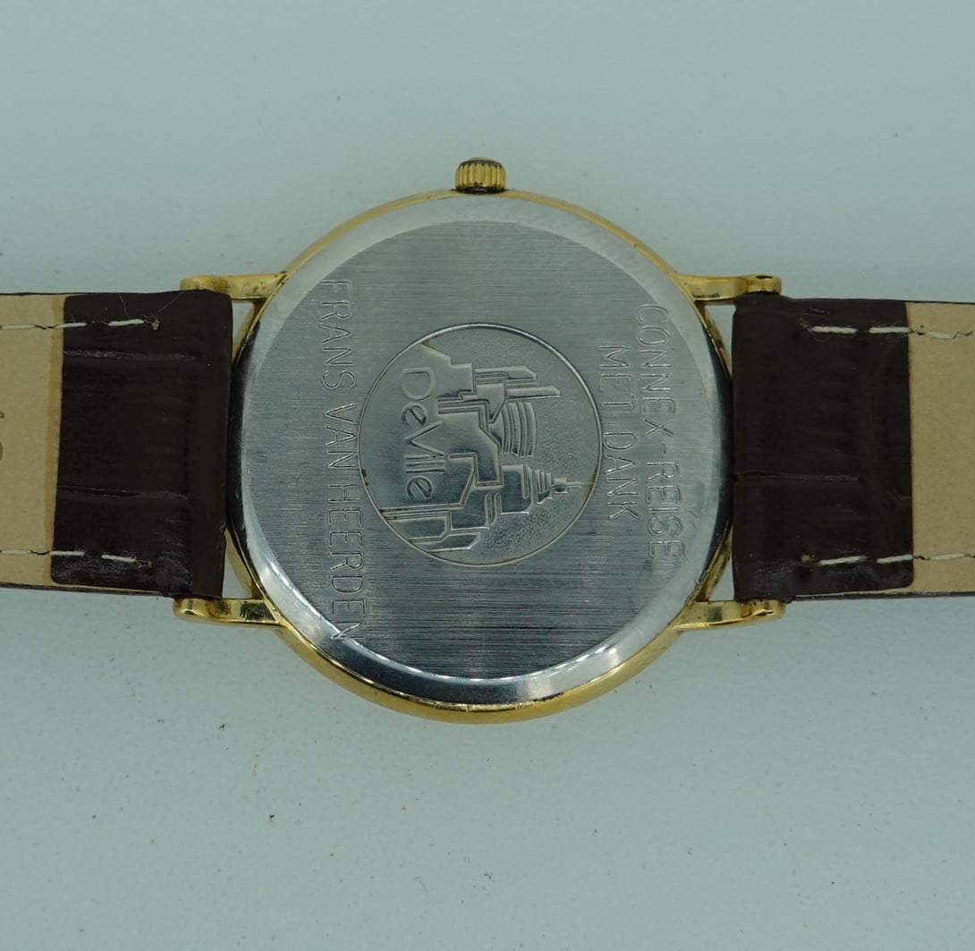 Whilst the dial doesn’t say De Ville on this example, you can cross reference the model on Omega’s own website, and that is where the Ile De France name first appears too.  The movement is Omega’s 1430, which was heavily based on the ETA 255 series – both ETA and Omega were owned by swatch by this point.  The movement is working perfectly, including the quick set date, and we will install a brand new battery before sending the watch out to the new owner.   The case gold plating has some wear, and the case back has a Dutch engraving to it.  The leather strap is new, and could be swapped for a different colour if preferred.