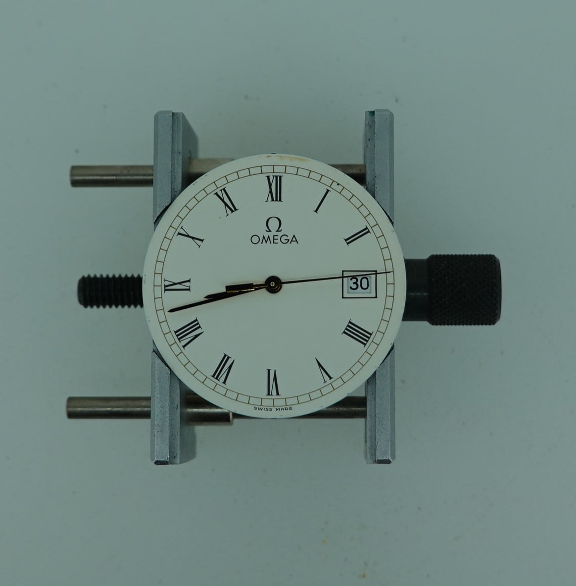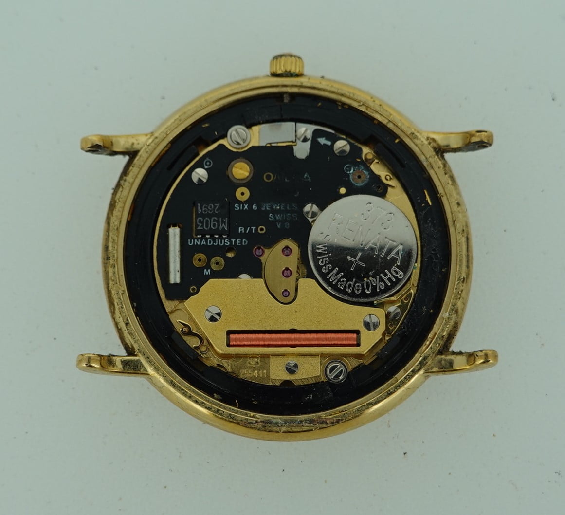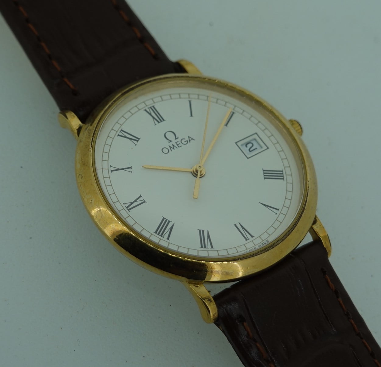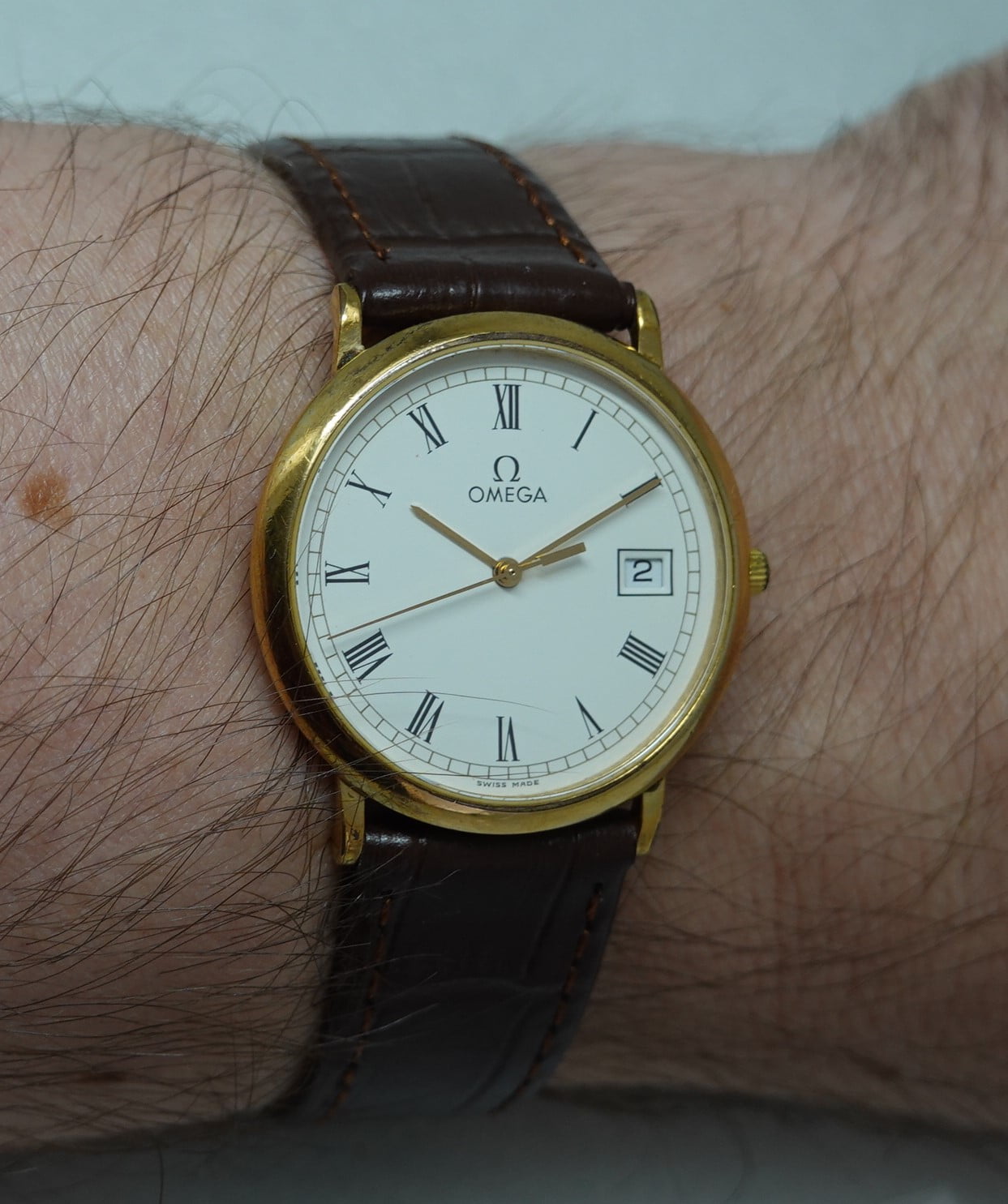 Whilst the dial doesn’t say De Ville on this example, you can cross reference the model on Omega’s own website, and that is where the Ile De France name first appears too.  The movement is Omega’s 1430, which was heavily based on the ETA 255 series – both ETA and Omega were owned by swatch by this point.  The movement is working perfectly, including the quick set date, and we will install a brand new battery before sending the watch out to the new owner.   The case gold plating has some wear, and the case back has a Dutch engraving to it.  The leather strap is new, and could be swapped for a different colour if preferred.