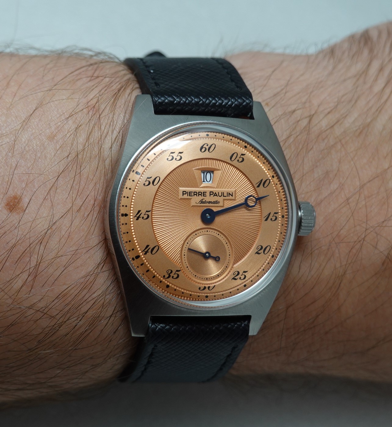 These are £90-105 on various different sites new, so while this one is not a massive saving it does save a bit (and potential import duty too if you are in the UK). But look what you get – a hand winding Seagull ST17 movement with sub seconds and a proper jump hour movement – the time always sits in the centre of the aperture and doesn’t drag round like some jump hours. The case is all steel, with a screw down case back – we haven’t photographed the movement to keep any warranty in tact. It really is amazing how they do it for so little, and then make it look so good too – those Breguet numerals and hour hand are a good touch. The watch has only been worn a few times and is like new. Merkur, who make Pierre Paulin watches, should be scaring a number of microbrands who would charge three or four times this price.