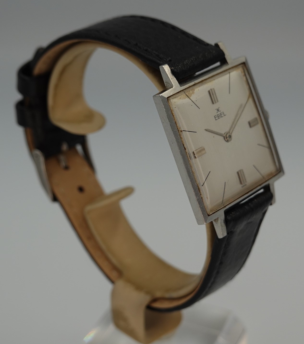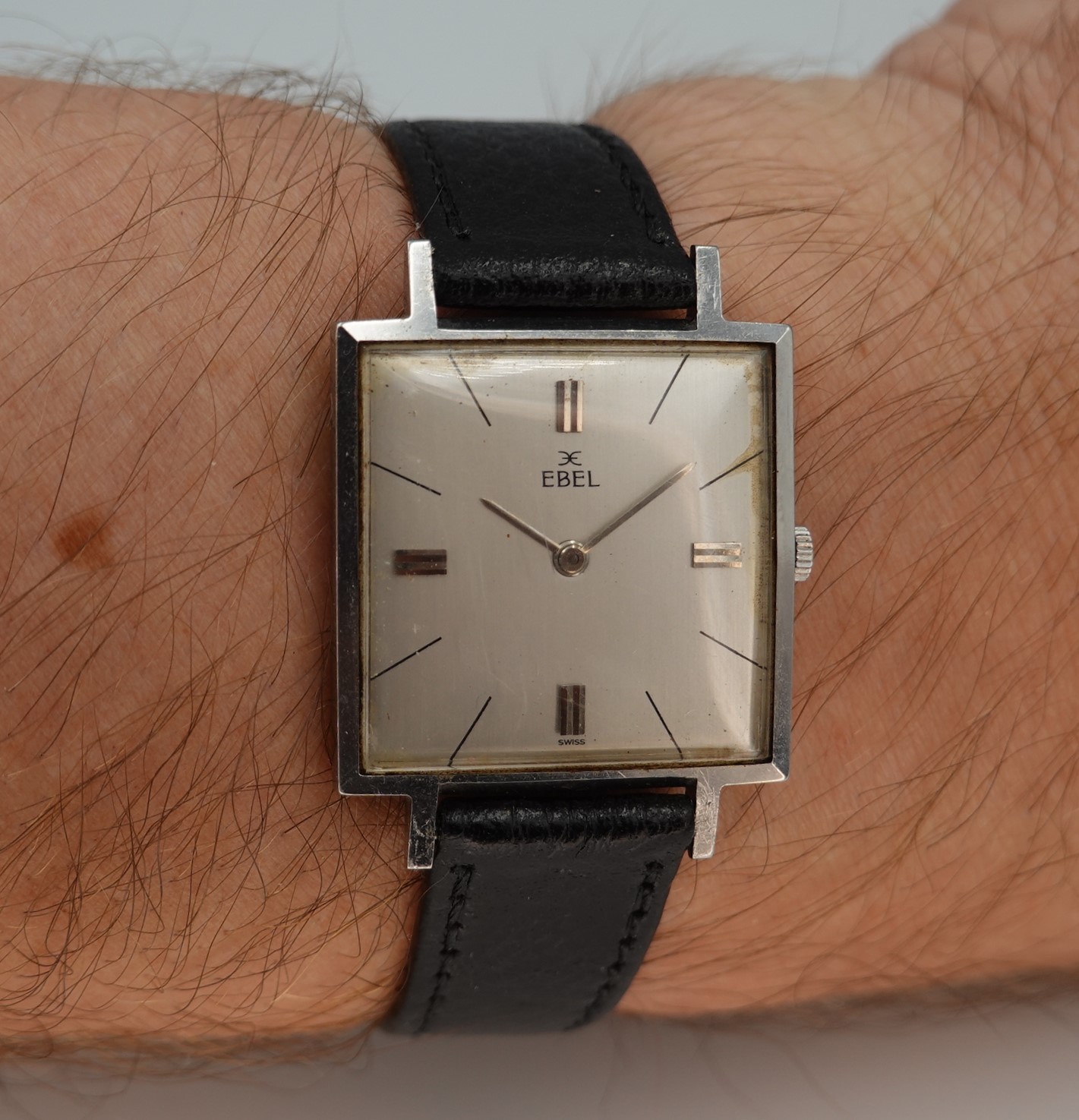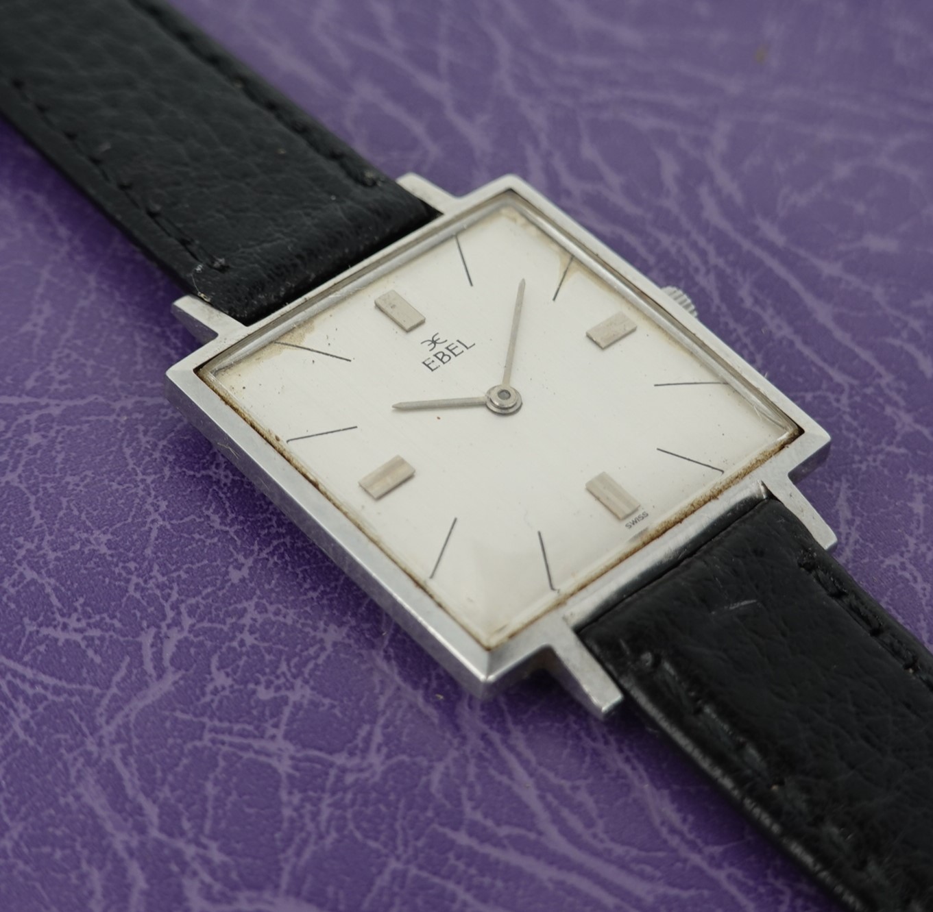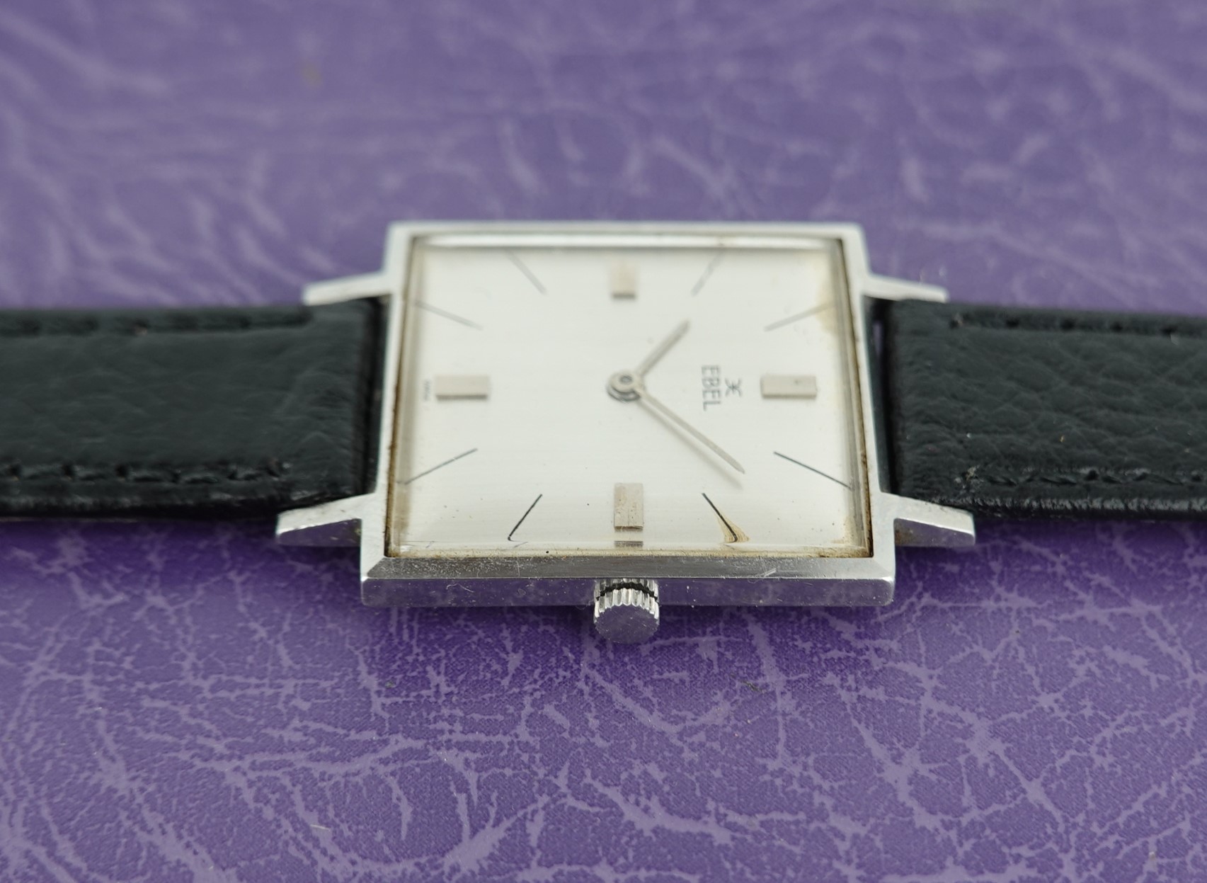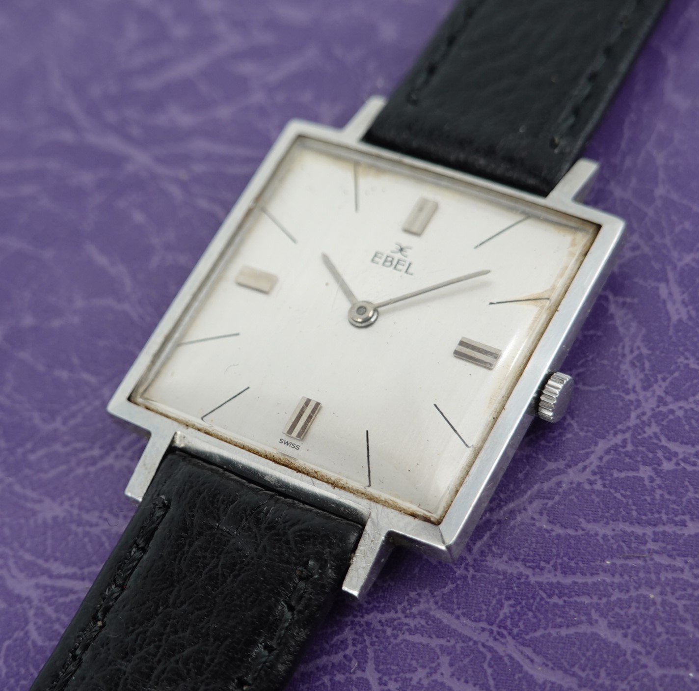 The vast majority of dress watches are round, but Ebel produced this square version for those who want something different. The stainless steel case is quite slim, and sits comfortably against the wrist. The serial number and model reference do look to have been stamped upside down on the case, which is a novelty. The dial is not perfect by any means, with patina around the edges, shwon in the photos and visible when the watch is cased up and on the wrist but the price reflects this. The movement is labeled an Ebel 97, which is based on the AS1575. Ebel doesn’t seemed to have redesigned anything on the 17 jewel manual wind movement, just finished some parts a little better. The leather strap is new, and could be swapped for a different colour or material if preferred. The watch is signed on the dial, case and movement.