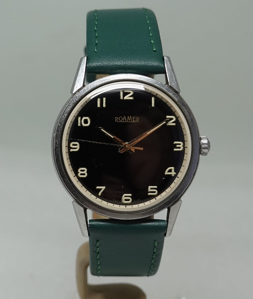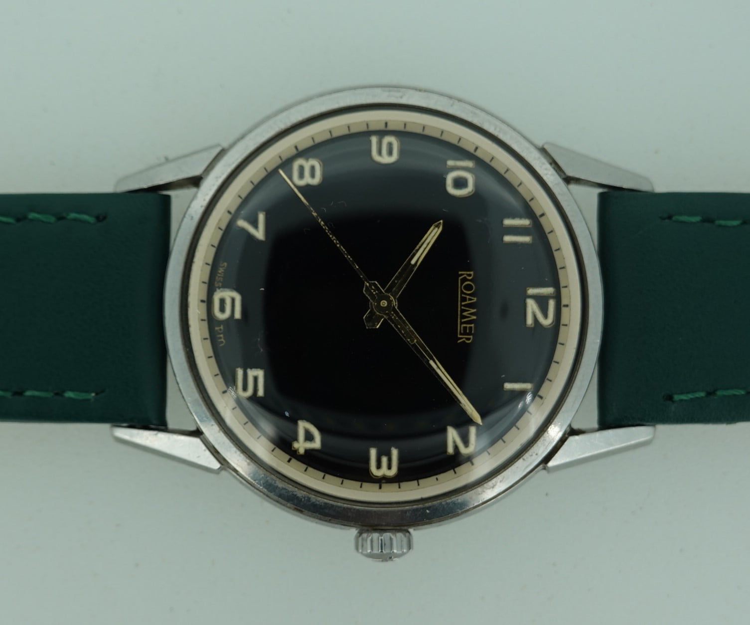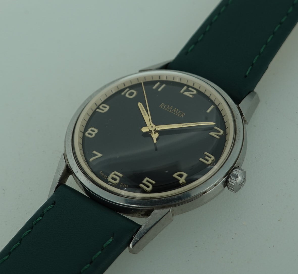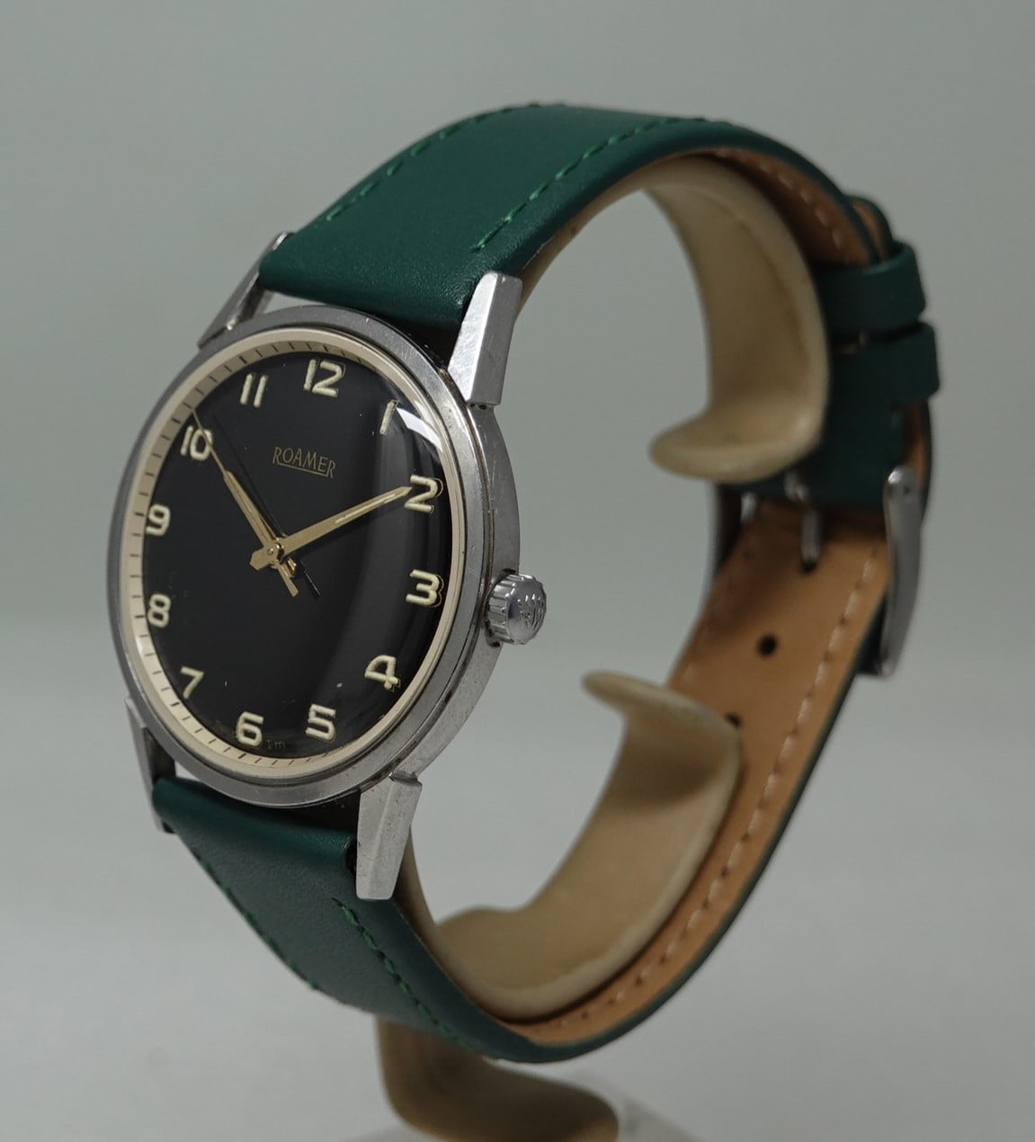 It’s harder to find black dial vintage watches, but this Roamer is an attractive piece.  Model reference 136414.