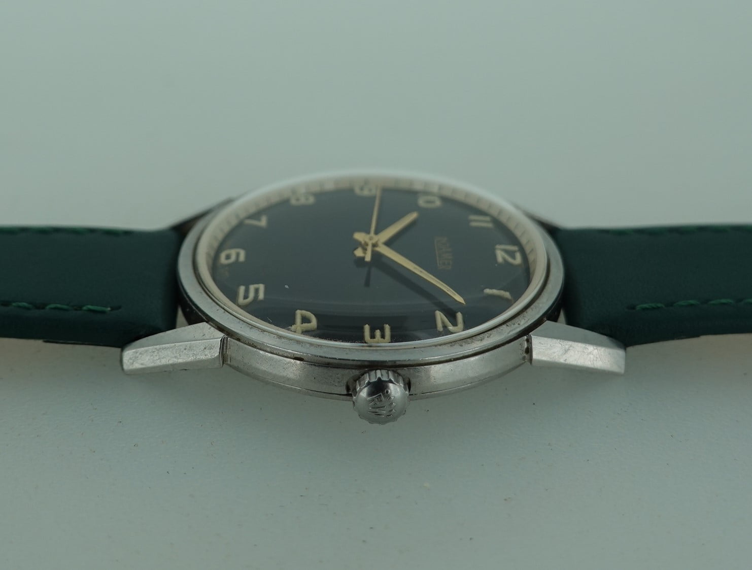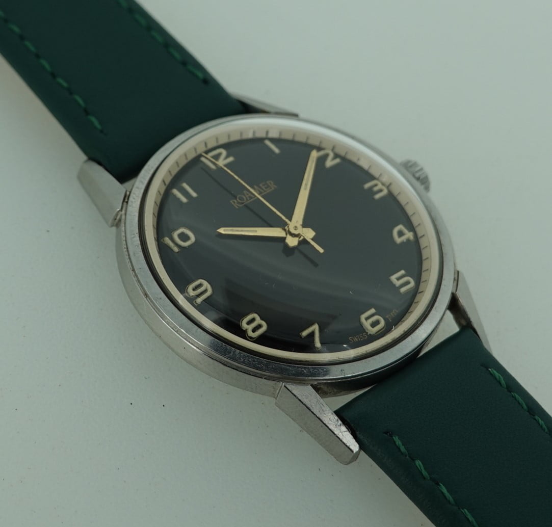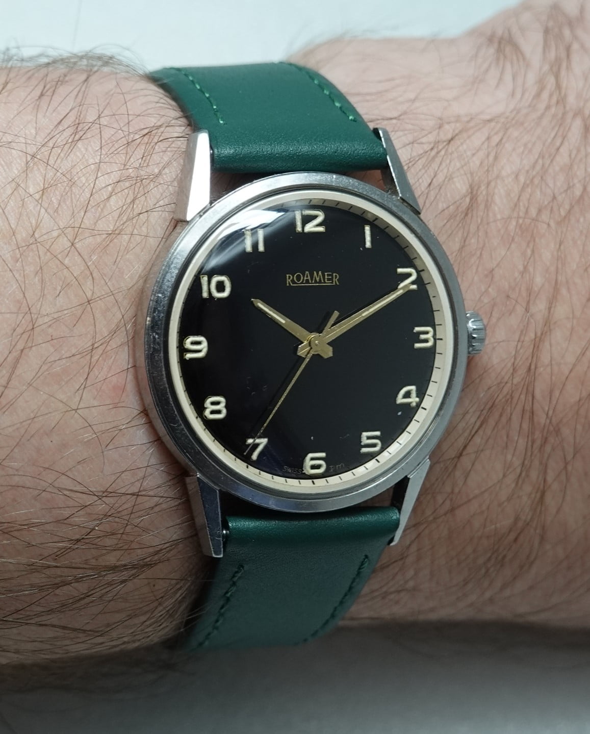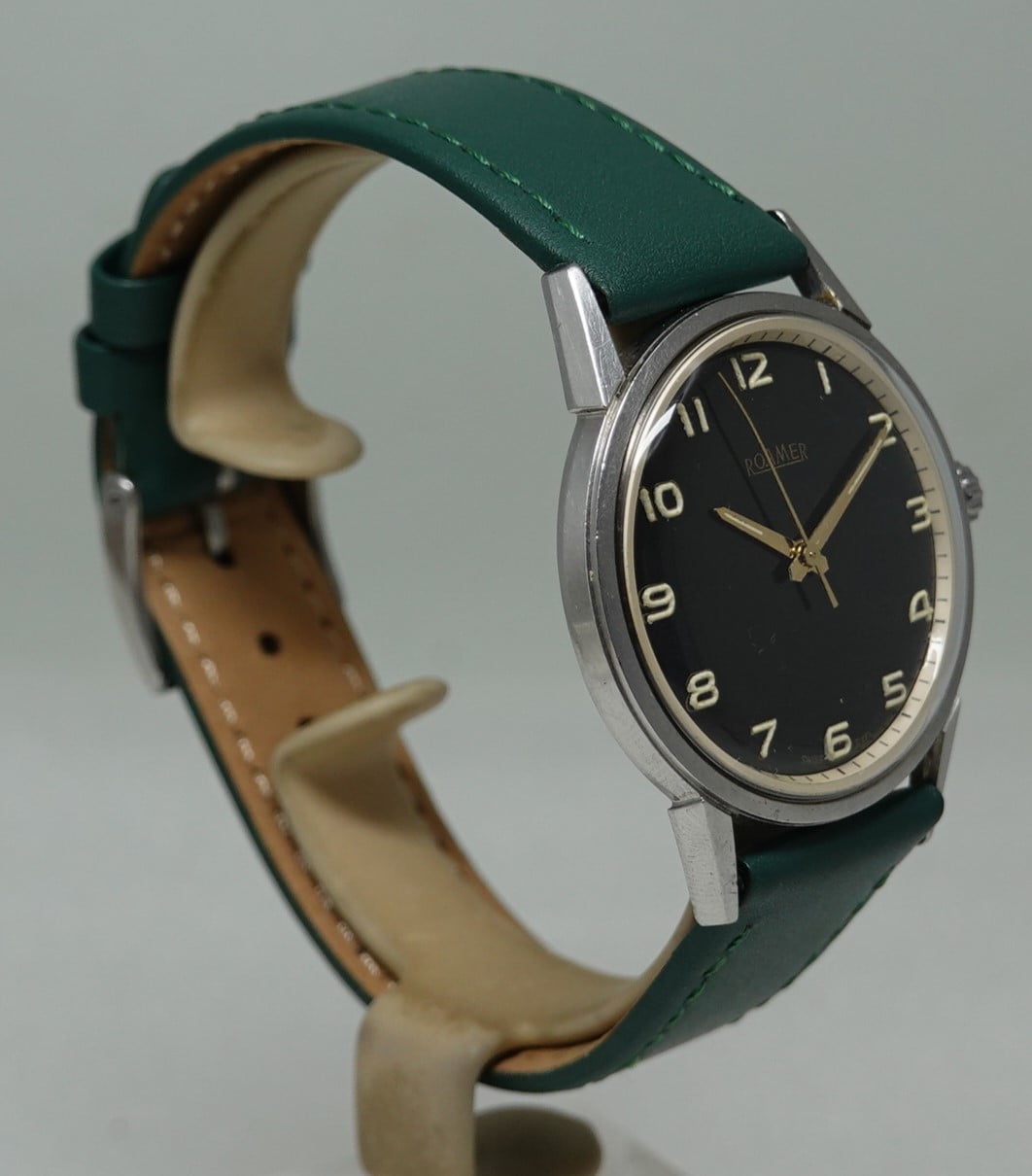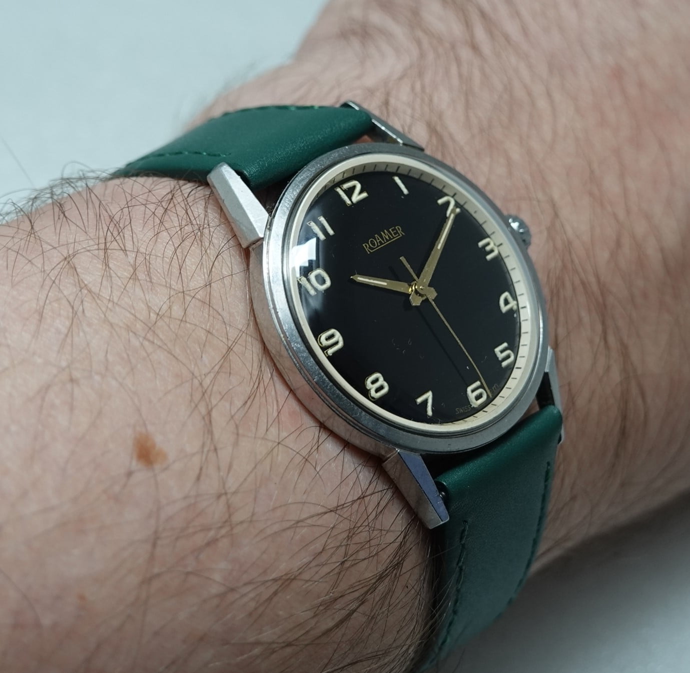 It’s harder to find black dial vintage watches, but this Roamer is an attractive piece.  Model reference 136414.