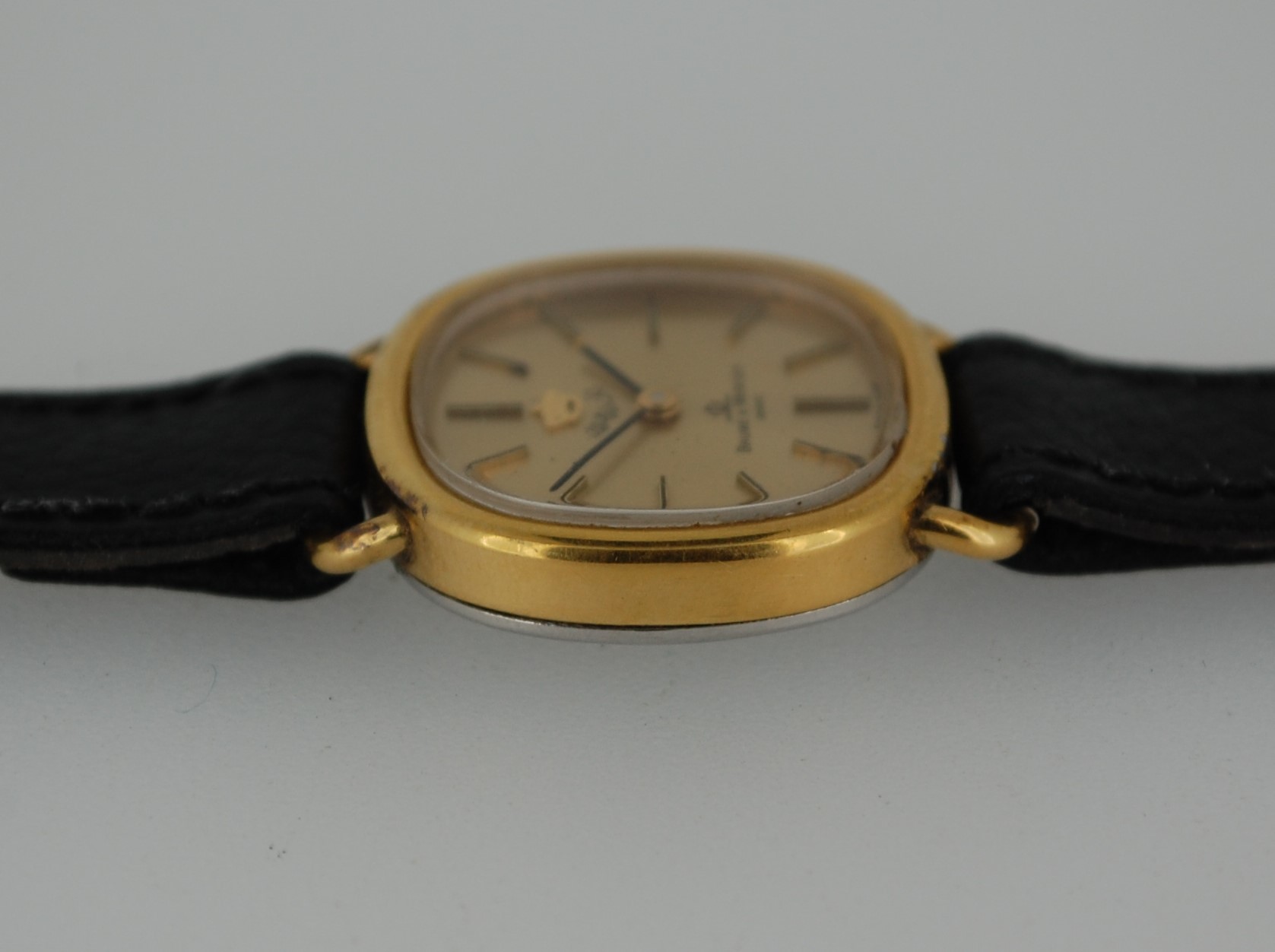 Baume & Mercier were not the only watchmaker that produced movements with various crests of royal families on the dial – a quick image search brings up these watches from Omega, Breitling, Longines and even Vacheron Constantin. The overall condition of the watch is good, with just some wear to the 20 micron gold plating between the bottom lugs preventing us from describing it as very good. The dial, with the crest and signed Baume & Mercier at 6, is very good. The movement is a manual wind ETA 2512, but this seventeen jewel movement was made especially for Baume & Mercier and their name appears on the bridge of the movement. It is all running nicely, set and wound via the crown with a stone set into it The leather strap is new, and could be swapped for a different colour if preferred.