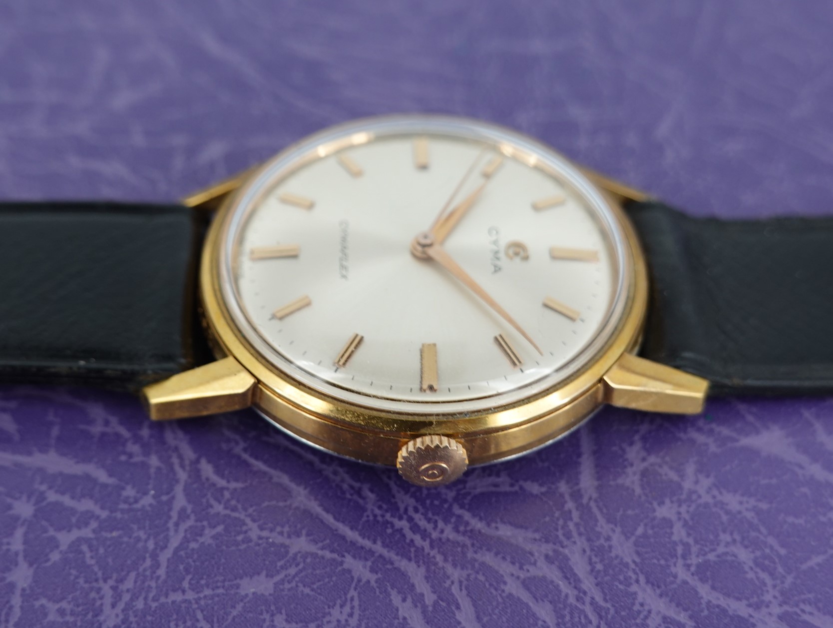 This watch is New Old Stock (NOS), and as such has never been sold and has probably only been worn for our photography. There may be small marks from being stored, but otherwise the condition is as good as you are likely to find. The shop price tag is still attached, and back in 1975 this was £35.00. This is one of the best quality watches we have had this week – It is 6x signed, and has an in house R486 movement with the Cymaflex shock absorbing system that was developed by Cyma themselves. You have a screw down case back with just a couple of marks – they was very tight and took some loosening. The leather strap is the original, and has the correct gold plated buckle too. The watch is signed on the dial, case, movement, crown, buckle and strap.