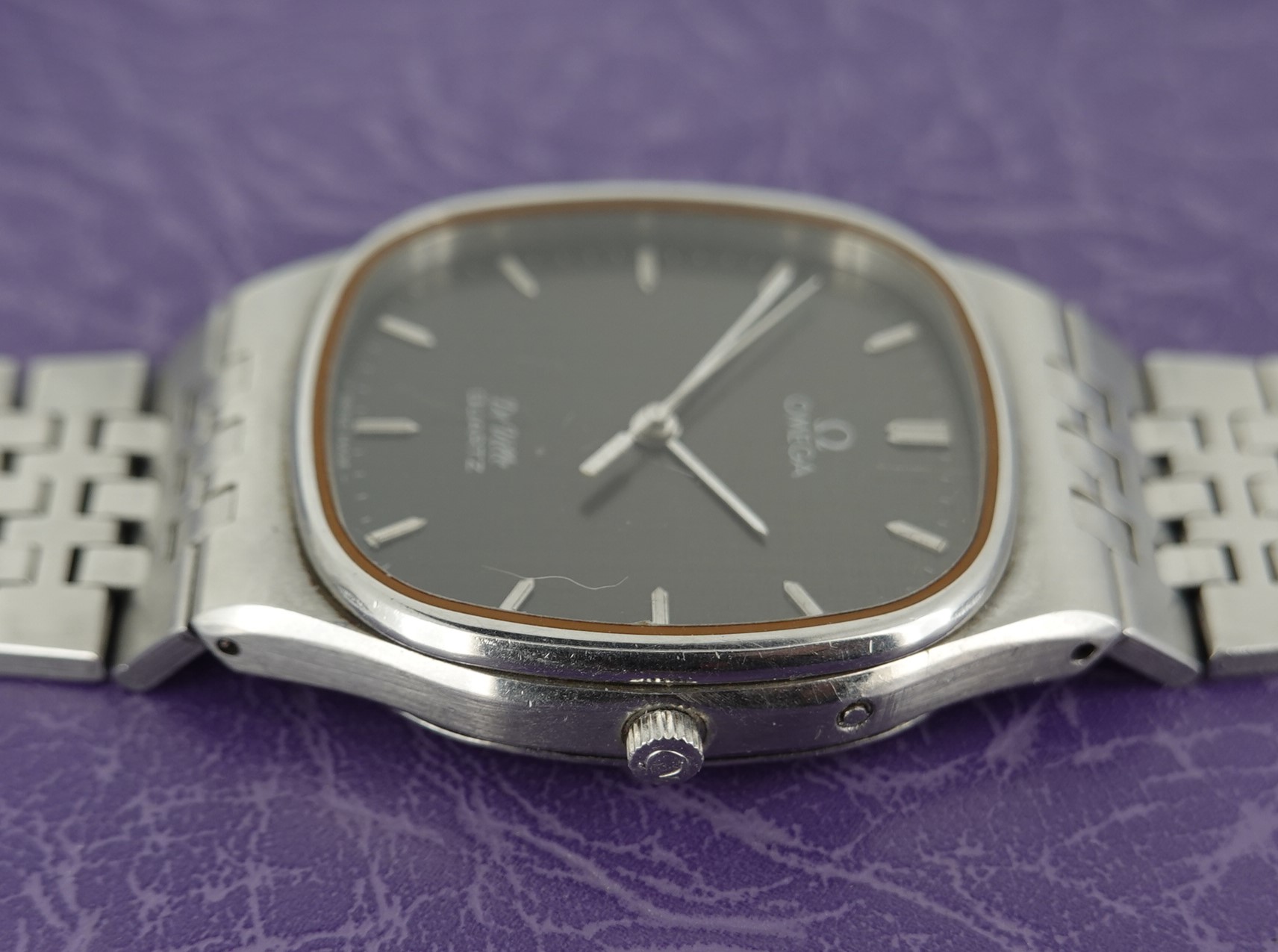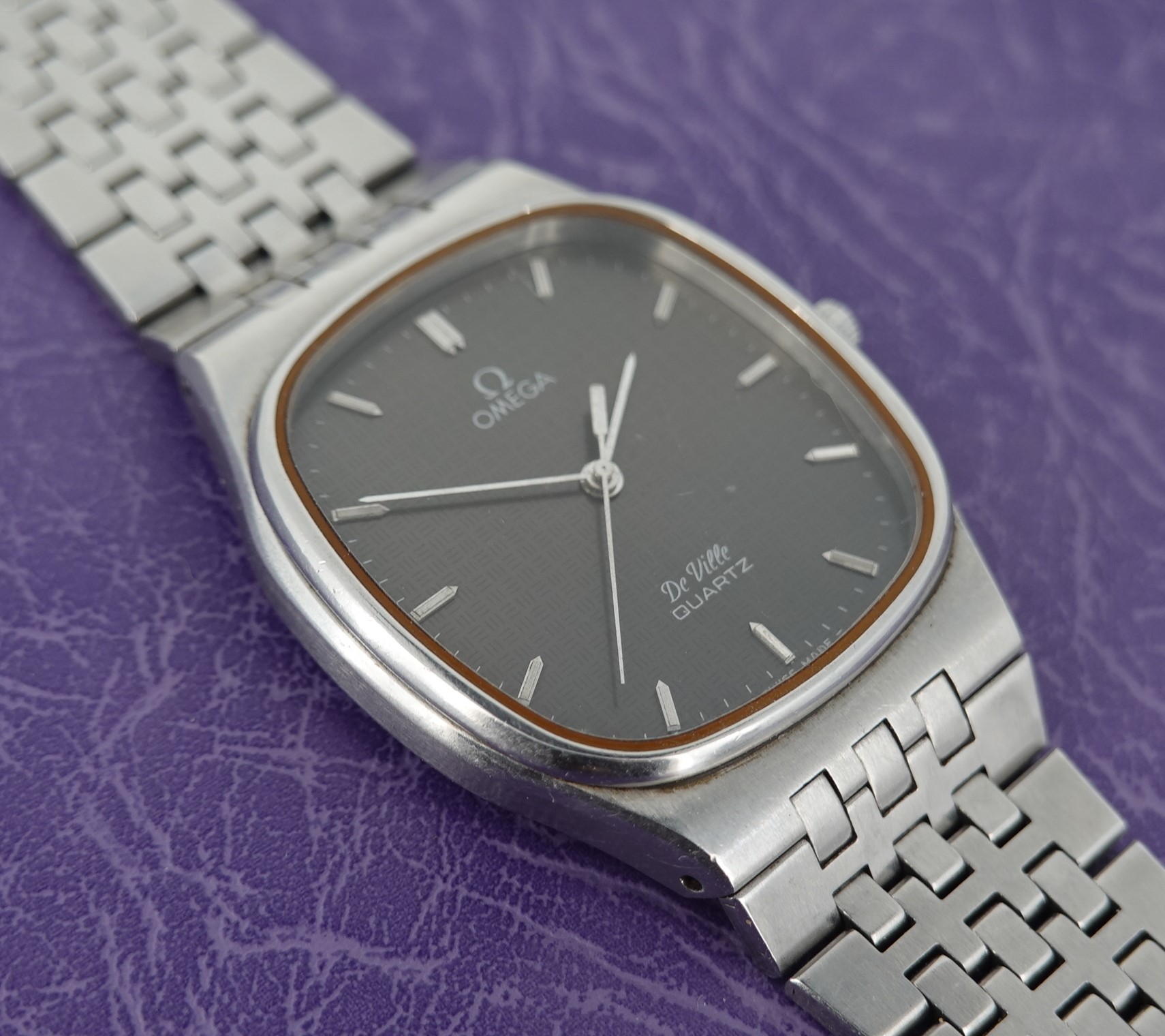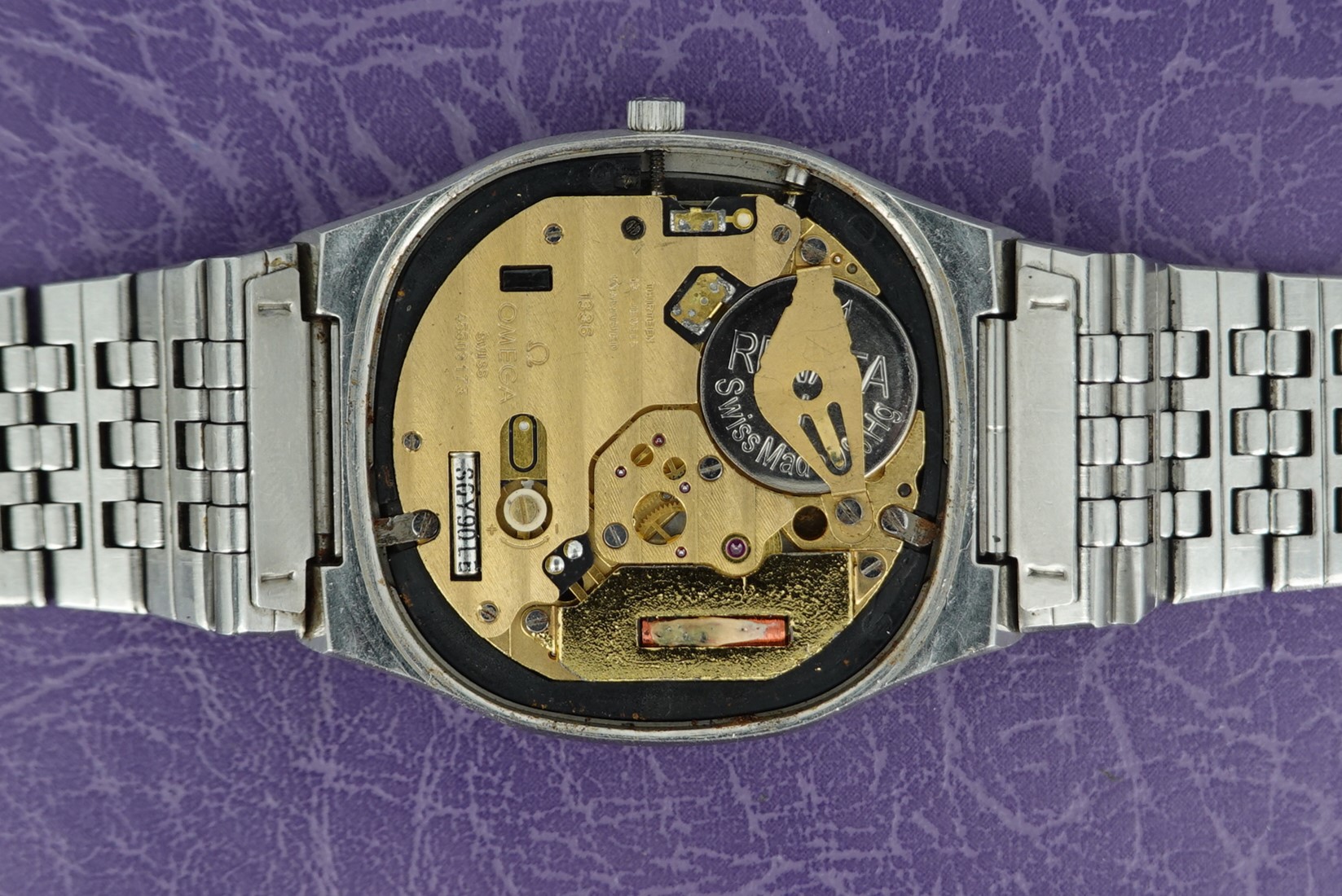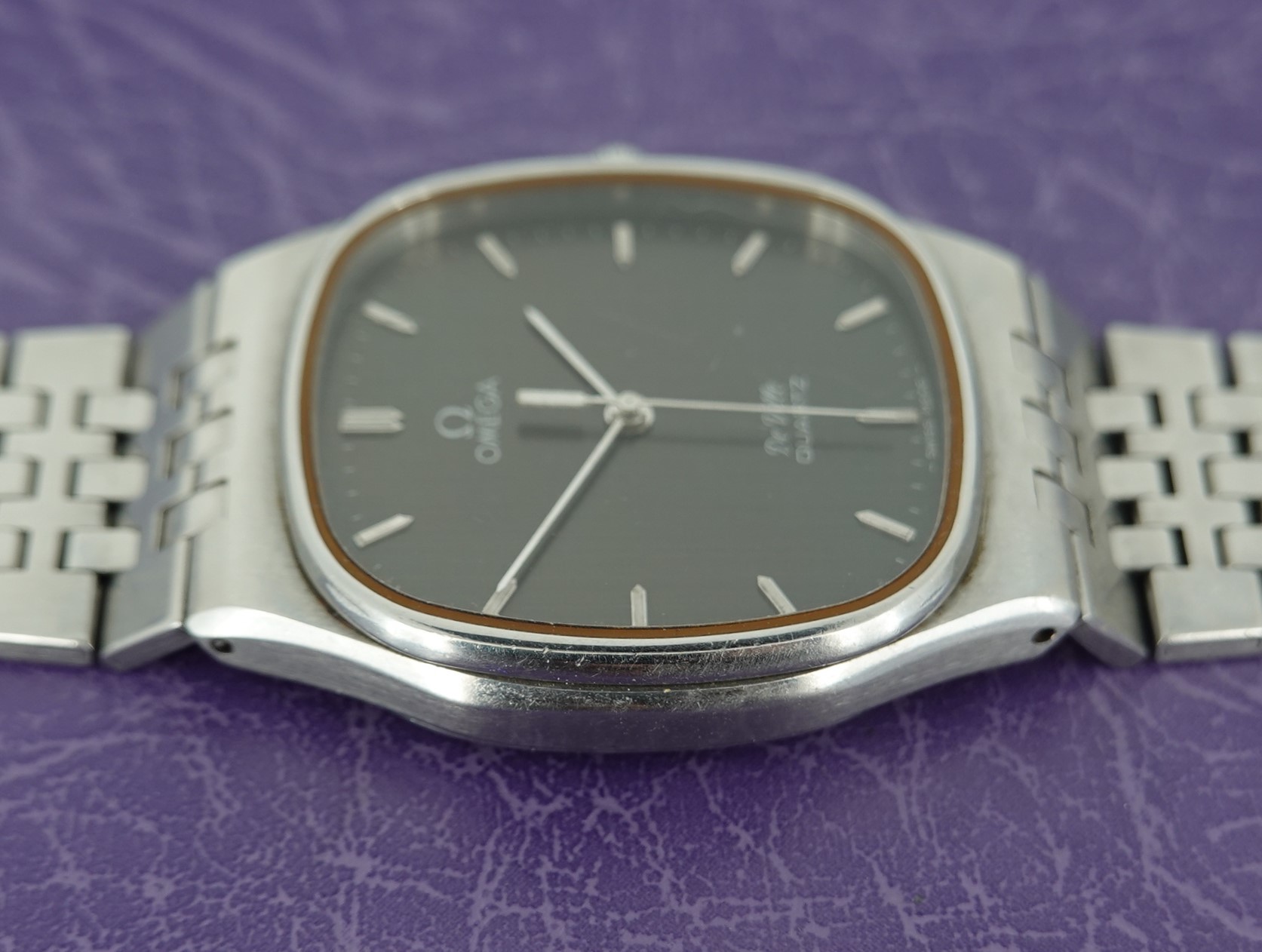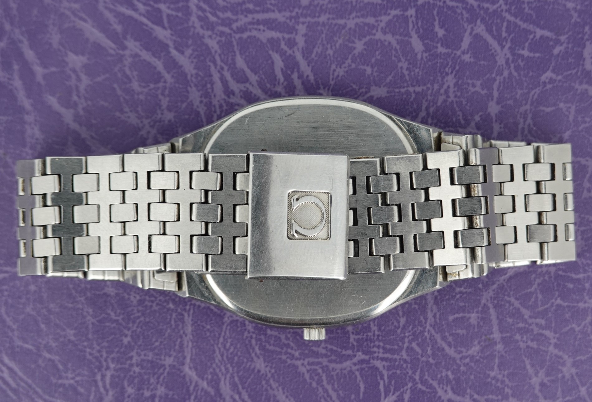 This watch has Omega’s calibre 1336 quartz movement inside, and it is from a time before Omega started using generic quartz ETA movements. So the movement has all metal bridges, polished with Côtes de Genève striping, which you just do not see in their later watches when costs were being overseen quite carefully. The other quirk or extravagance this has is a pusher at 2 to stop or advance the seconds hand, for precise time setting. And precise is exactly the correct description – we have adjusted this watch via the trimmer to record absolutely perfect timekeeping of 0.0 seconds discrepancy per month! We will install a brand new battery before sending the watch out to the new owner. The case is unpolished so will show some light marks, and the glass on this watch does have multiple scratches. The bracelet has been shortened in the past and our sister website, SpareLinks.com, may have extra links if required. Please check the bracelet will fit your wrist before ordering, as we can not fit a leather strap to this case design. The watch is signed on the dial, case, movement, crown and clasp.