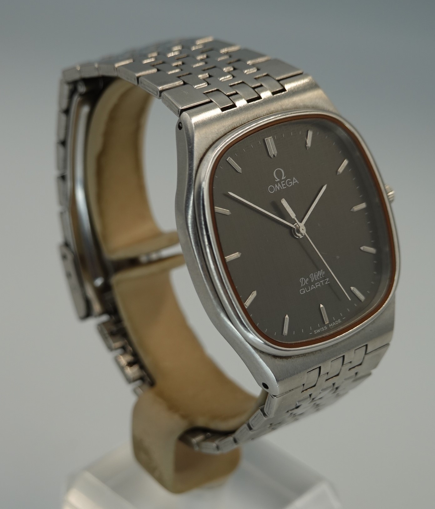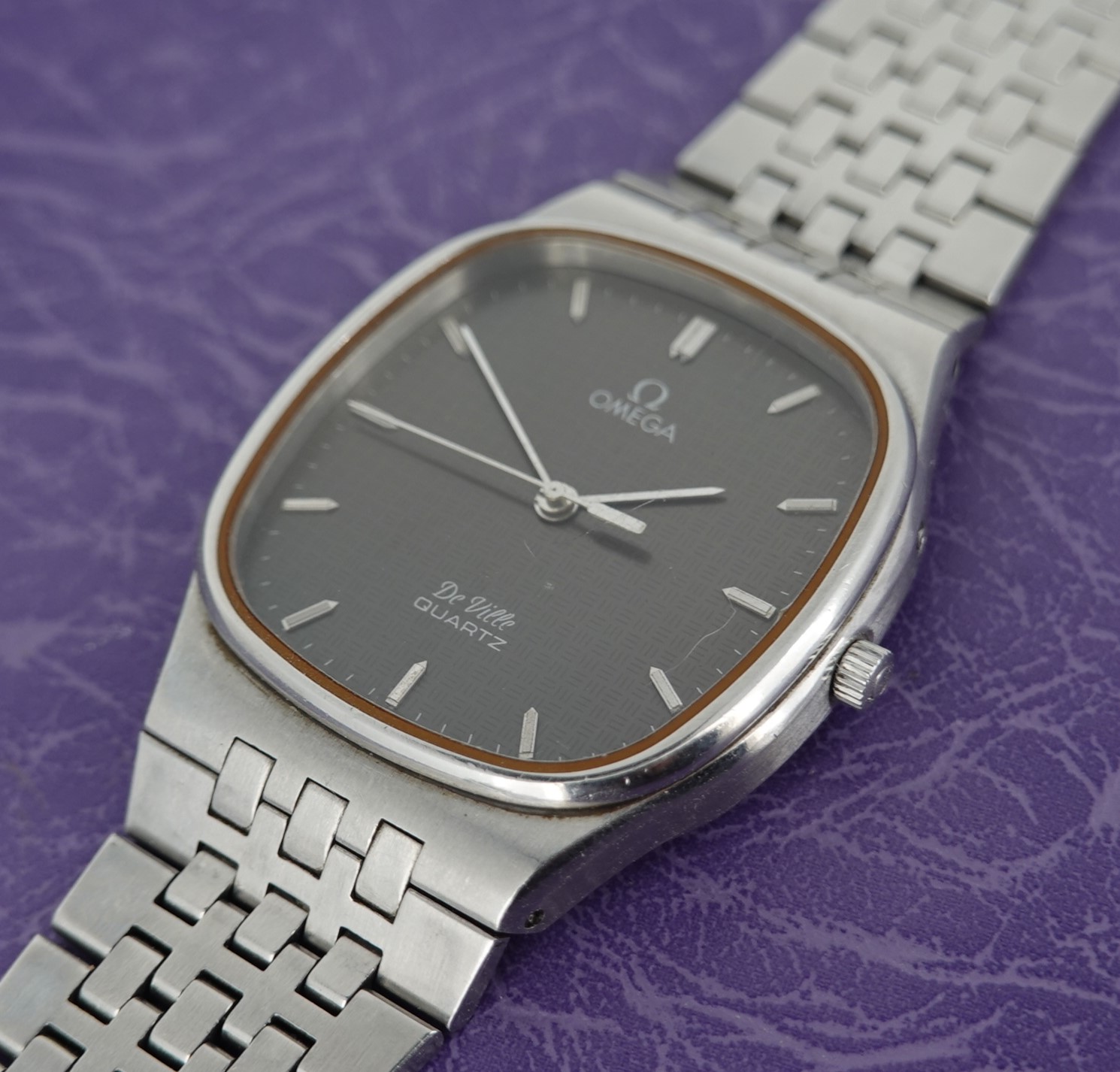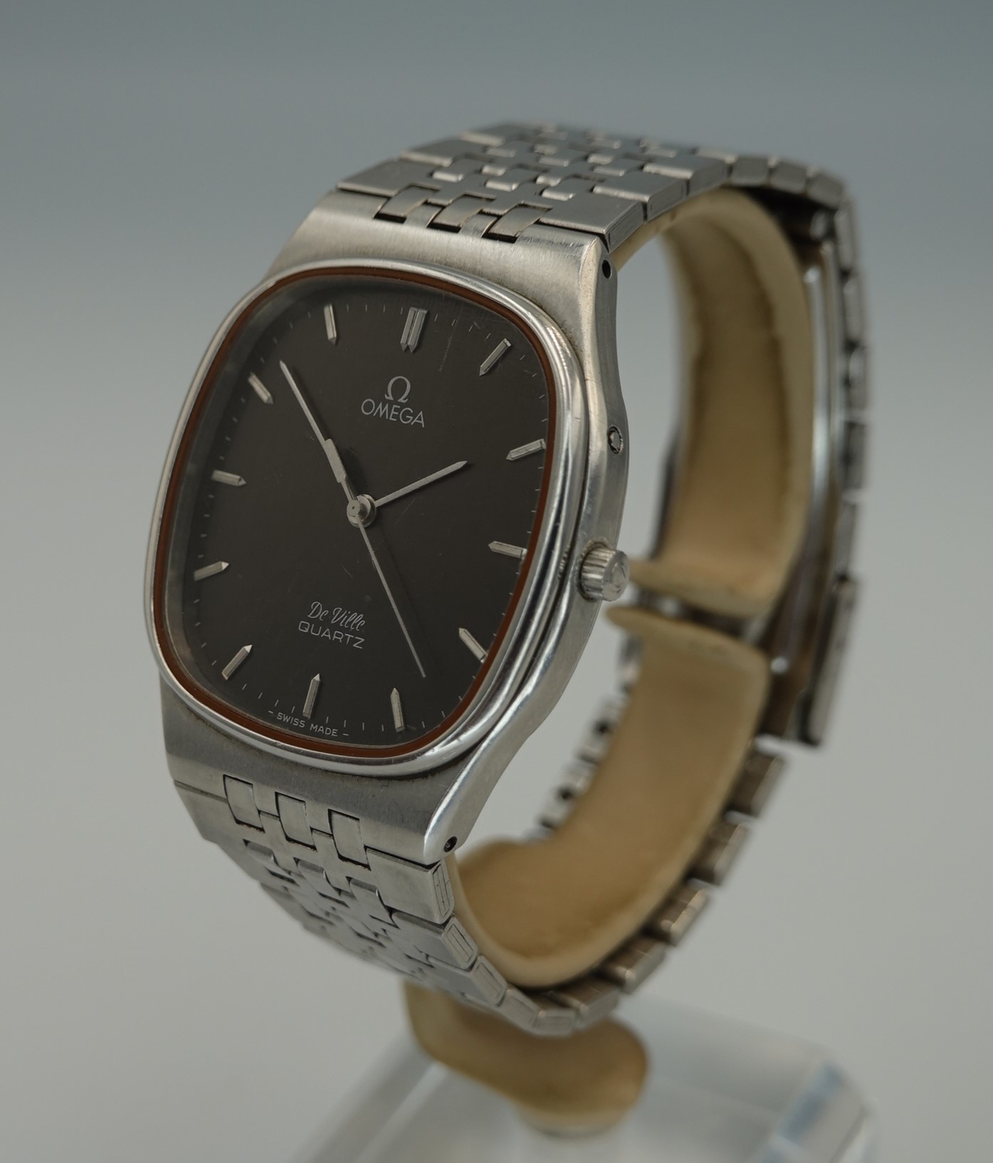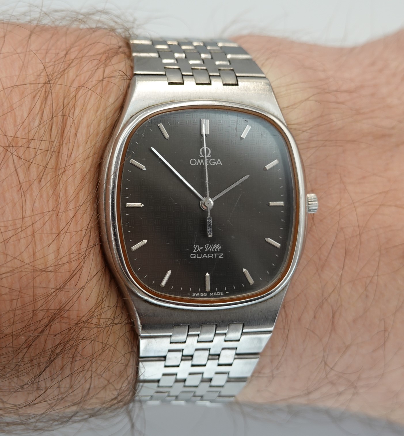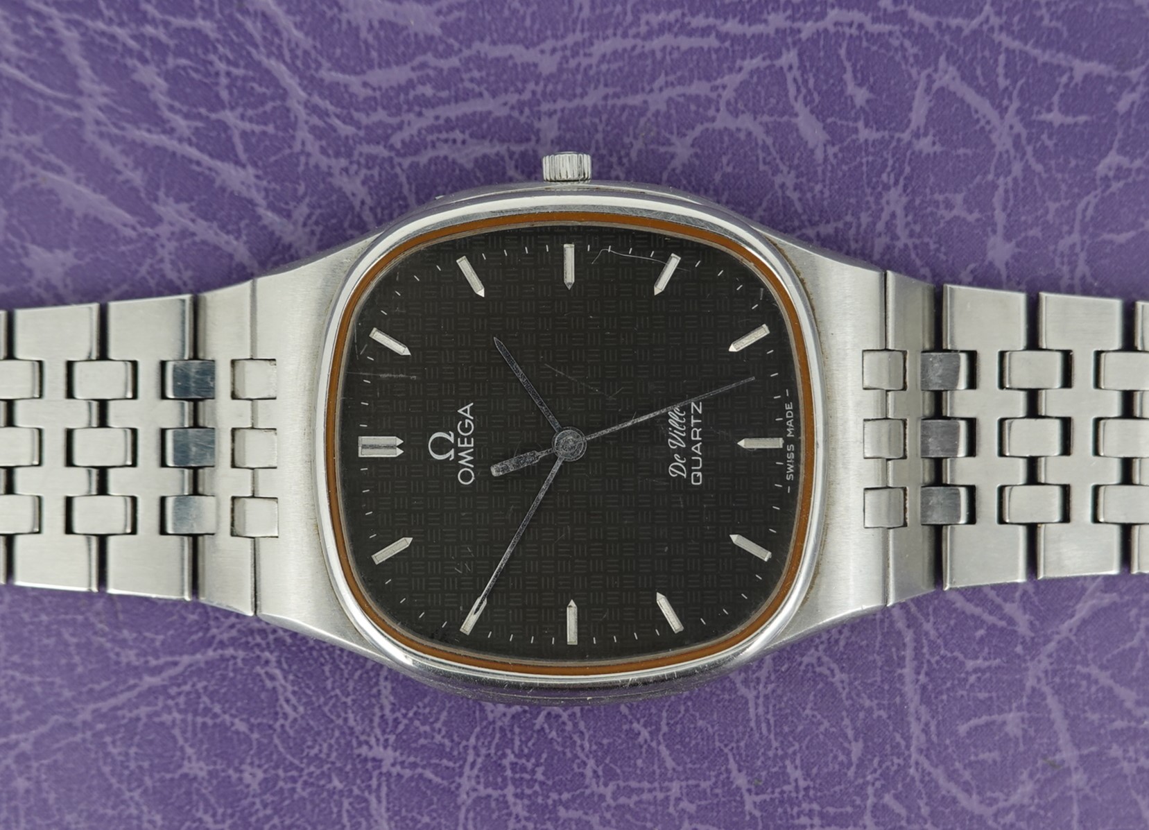 This watch has Omega’s calibre 1336 quartz movement inside, and it is from a time before Omega started using generic quartz ETA movements. So the movement has all metal bridges, polished with Côtes de Genève striping, which you just do not see in their later watches when costs were being overseen quite carefully. The other quirk or extravagance this has is a pusher at 2 to stop or advance the seconds hand, for precise time setting. And precise is exactly the correct description – we have adjusted this watch via the trimmer to record absolutely perfect timekeeping of 0.0 seconds discrepancy per month! We will install a brand new battery before sending the watch out to the new owner. The case is unpolished so will show some light marks, and the glass on this watch does have multiple scratches. The bracelet has been shortened in the past and our sister website, SpareLinks.com, may have extra links if required. Please check the bracelet will fit your wrist before ordering, as we can not fit a leather strap to this case design. The watch is signed on the dial, case, movement, crown and clasp.