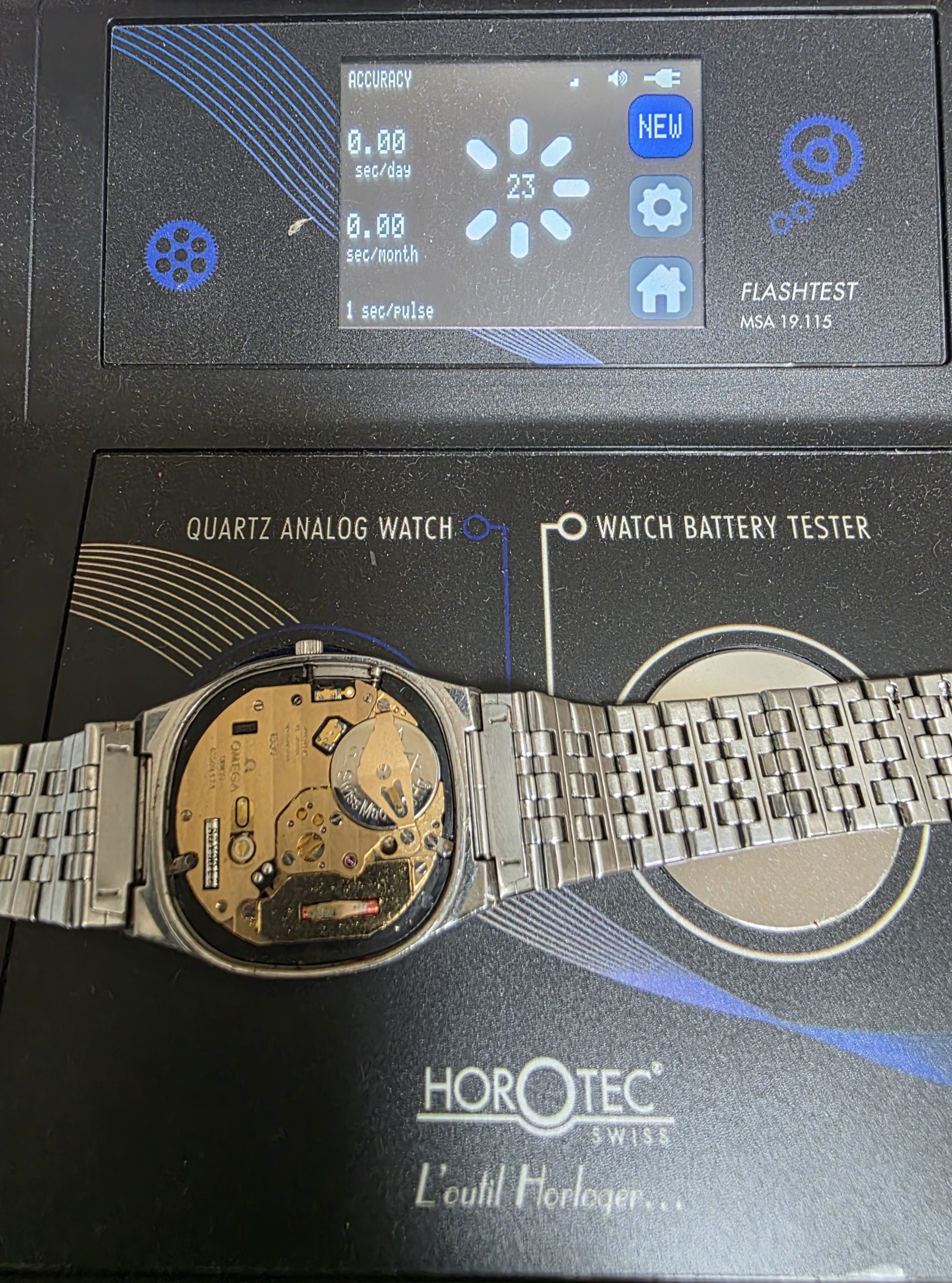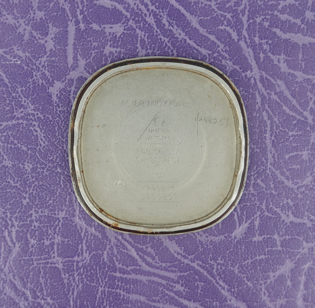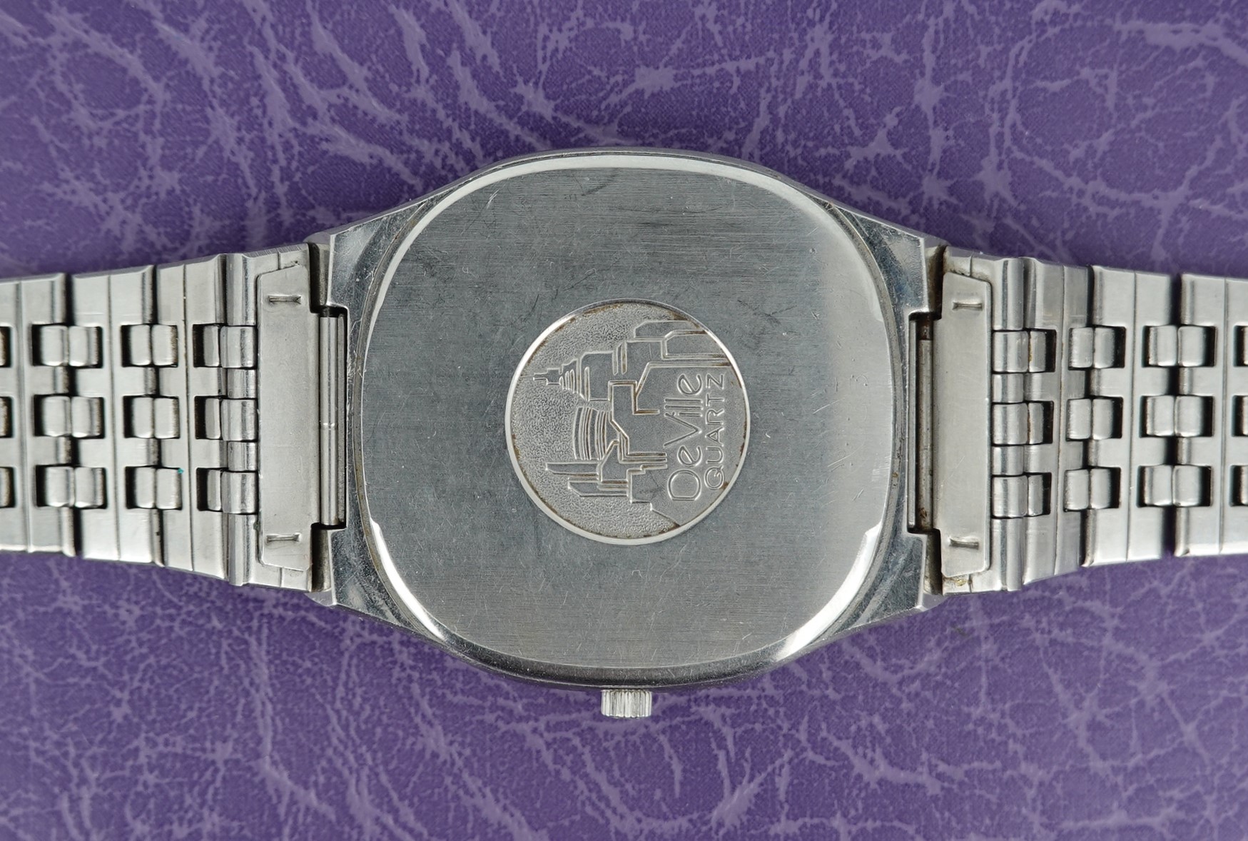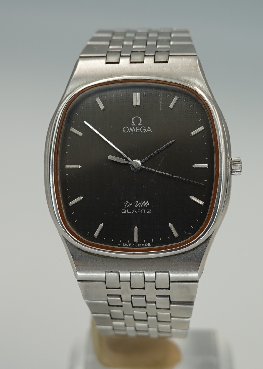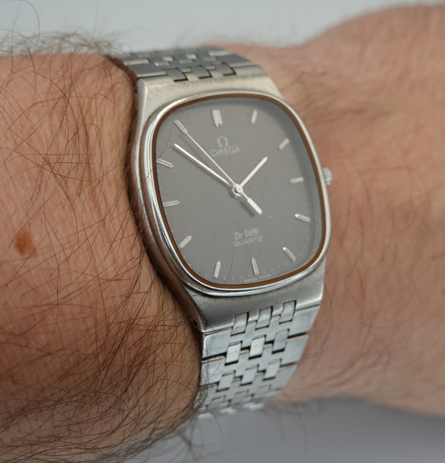 This watch has Omega’s calibre 1336 quartz movement inside, and it is from a time before Omega started using generic quartz ETA movements. So the movement has all metal bridges, polished with Côtes de Genève striping, which you just do not see in their later watches when costs were being overseen quite carefully. The other quirk or extravagance this has is a pusher at 2 to stop or advance the seconds hand, for precise time setting. And precise is exactly the correct description – we have adjusted this watch via the trimmer to record absolutely perfect timekeeping of 0.0 seconds discrepancy per month! We will install a brand new battery before sending the watch out to the new owner. The case is unpolished so will show some light marks, and the glass on this watch does have multiple scratches. The bracelet has been shortened in the past and our sister website, SpareLinks.com, may have extra links if required. Please check the bracelet will fit your wrist before ordering, as we can not fit a leather strap to this case design. The watch is signed on the dial, case, movement, crown and clasp.