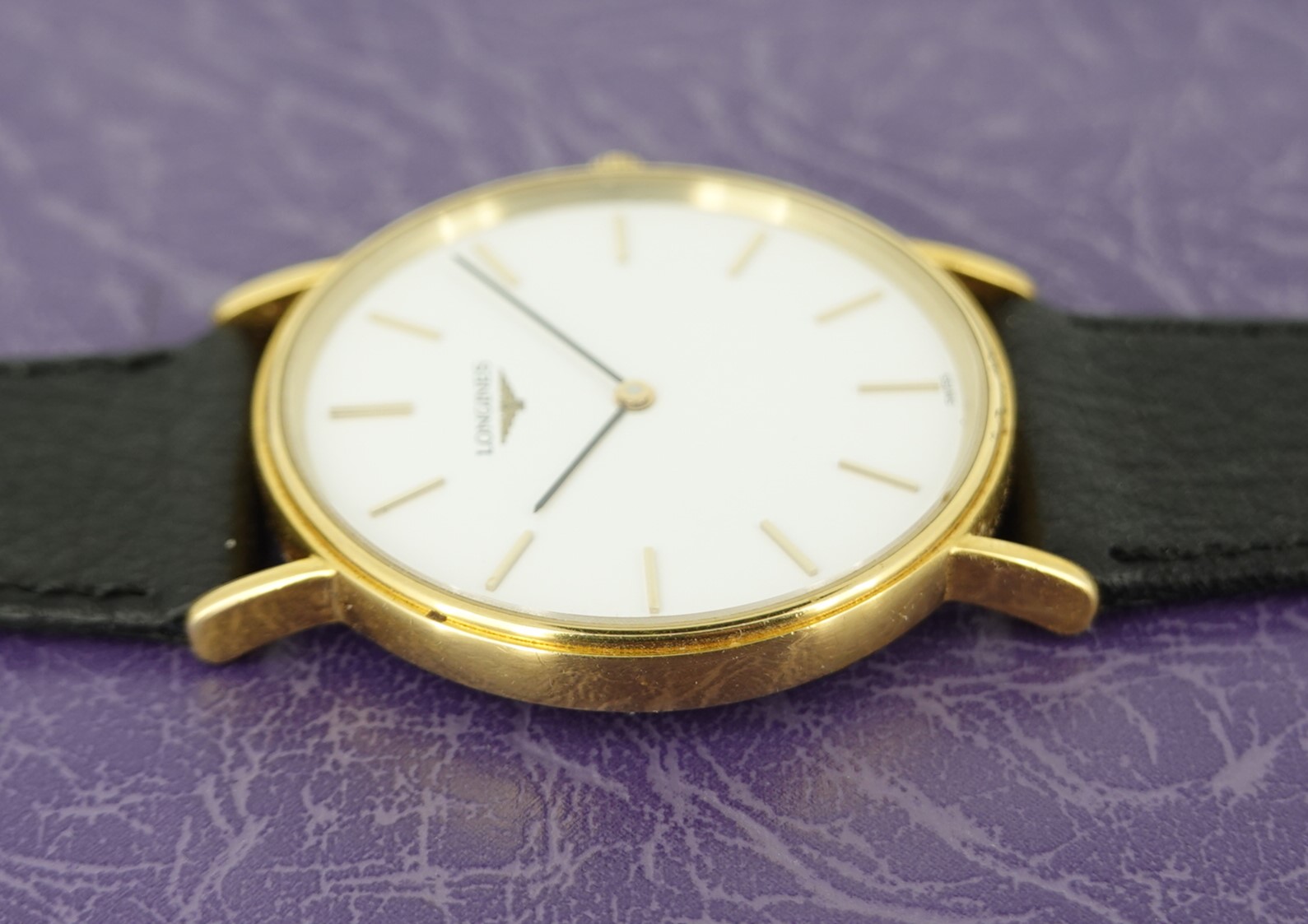 The La Grande Classique is a classic Swiss dress watch. The ultrathin case (<5mm), zero complications and blacked hands on white dial combination is timeless, and meets all the rules for a dress watch. Compromises were made – the case is gold plated, not solid gold, and the movement is quartz and not manual wind, but that keeps the price down – we do have Piaget and Patek’s that will meet those extra requirements, but at a healthy exta cost. This particular one stood out as the case is in good shape, the dial very clean, and the new strap and service box are also very nice to haves. Inside is a quartz set and forget ETA based movement, and we will install a brand new battery before sending the watch out to the new owner. The Longines leather strap is new, and has a new Longines buckle too. The watch is signed on the dial, case, movement, buckle and strap.