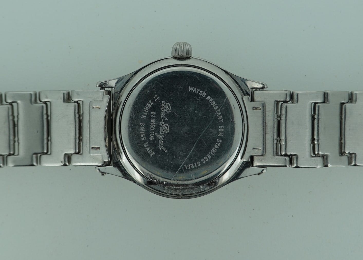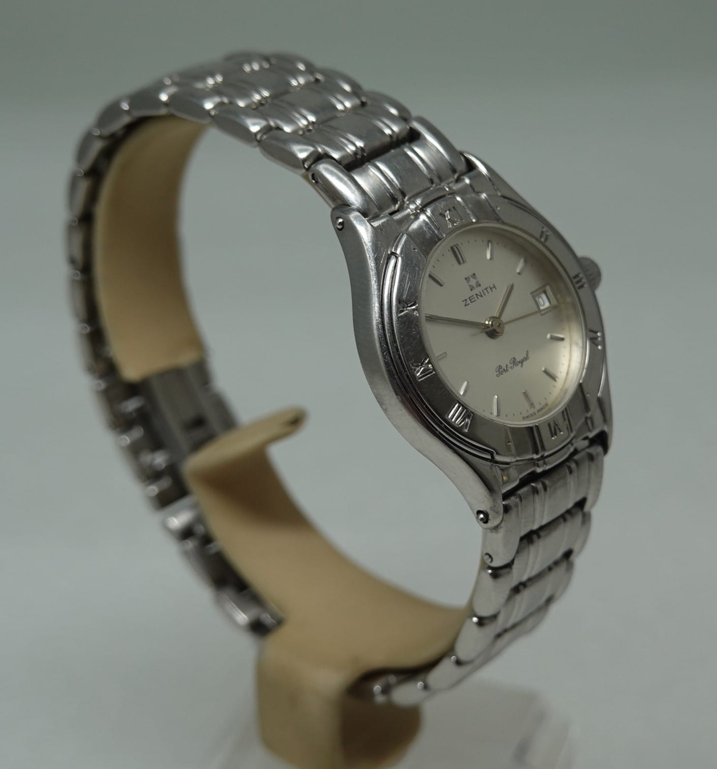 Zenith made a nearly catastrophic decision to ditch mechanical movements in the eighties and just sell quartz watches. By the mid nineties they reversed that and started making purely mechanical watches, and then later they changed partially back and made a few quartz models, particularly on ladies watches like the Port Royal we have here. In broad terms, a lot of ladies like the convenience and accuracy of quartz watches, so it makes sense to offer them. This Port Royal features and ETA quartz movement with centre seconds and date feature which is all working well. We will install a brand new battery before sending the watch out to the new owner. Someone has slipped when replacing the battery before, making a bit of a mess of the case back, but this can not be seen when you are wearing the watch and helps explain the low price. There is also a scratch on the bezel, around 4. The silver dial is good, and the bracelet is long. Our sister website, www.sparelinks.com, may have extra links available if required. The bracelet has been cleaned in our ultrasonic bath.