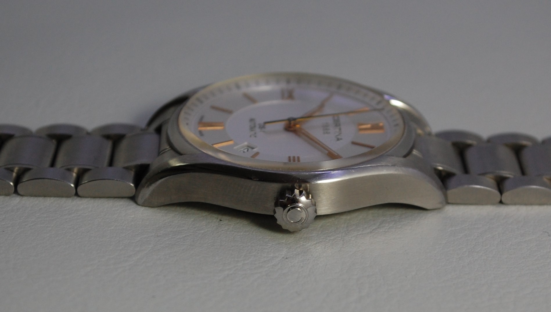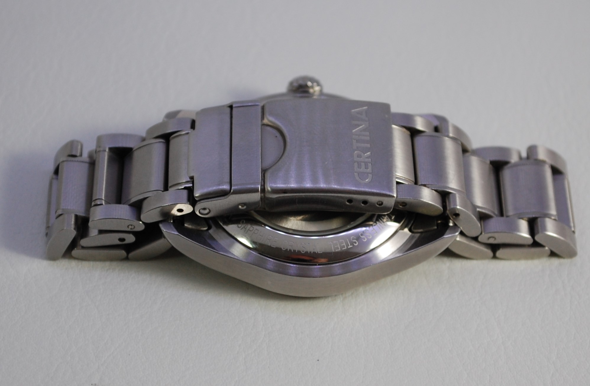 The DS range was first introduced in 1959 as Certina’s more rugged, sports watch, and this tradition has been continued here. As well as a solid stainless steel case, the bracelet is made from the same material and the clasp has a secondary lock to ensure the watch is kept on the wrist. The watch was originally tested to 100M water resistance. You have an exhibition glass case back to show the movement functioning, and it is working very well as you would expect. You have a date window at 4, and this function can be quick set via the crown. The watch has been worn, so carries a few light scratches, but nothing really significant. Two bracelet links have been removed and lost, but the bracelet will still fit most wrists.