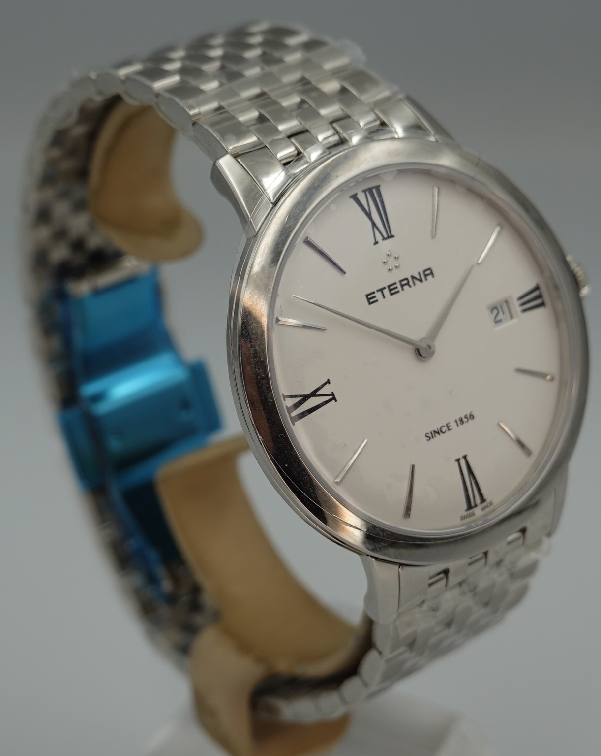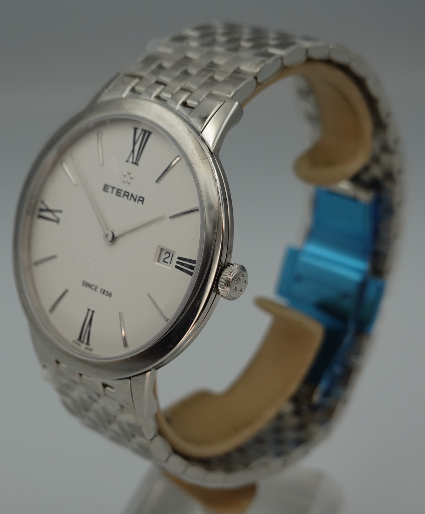 A complete unused Eterna Eternity 40mm mens dress watch, still in all the protective stickers. Model reference 2711.41.350.802.