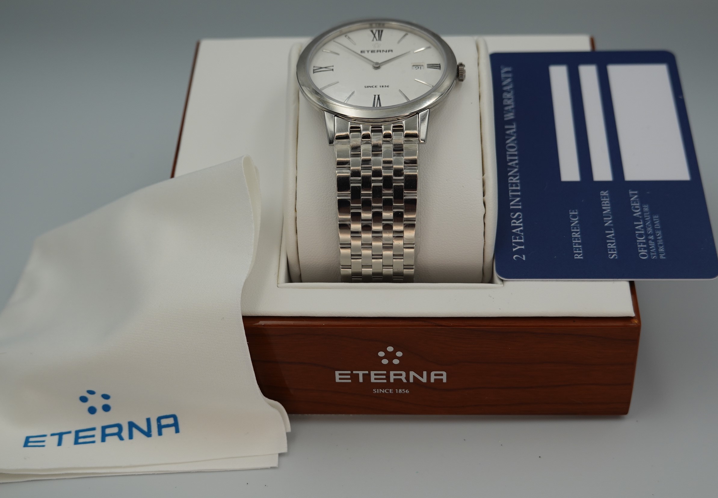 This watch will be supplied with the original presentation box, blank warranty card, Eterna polishing cloth and our Certificate of Authenticity.